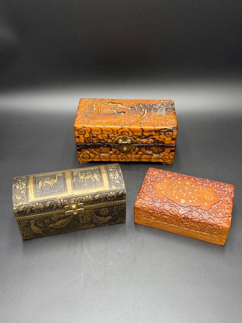 Mini Carved and Etched Boxes (Set of 3) Set of three small decorative boxes in different styles and materials: Carved Wooden Box (4 x 8 x 4 in) Gold-Tone Camel Box (4 x 7 x 3 in) Floral Inlay Wood Box (4 x 6 x 2 in)