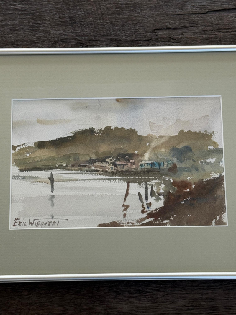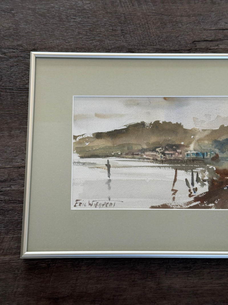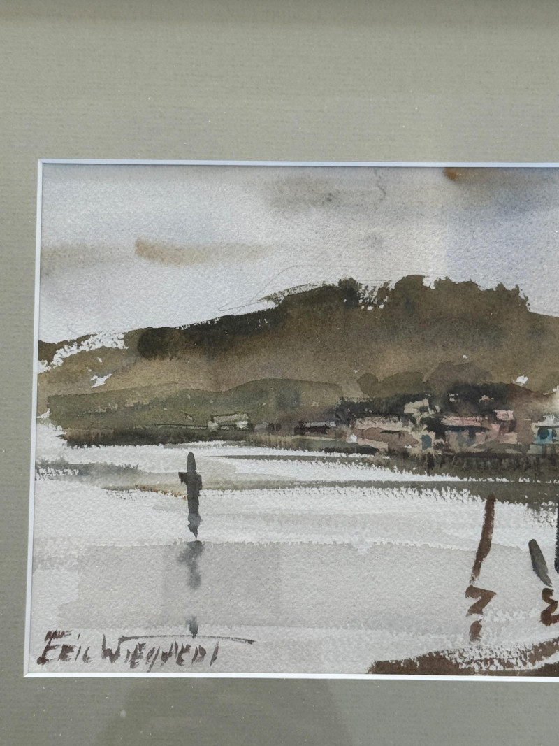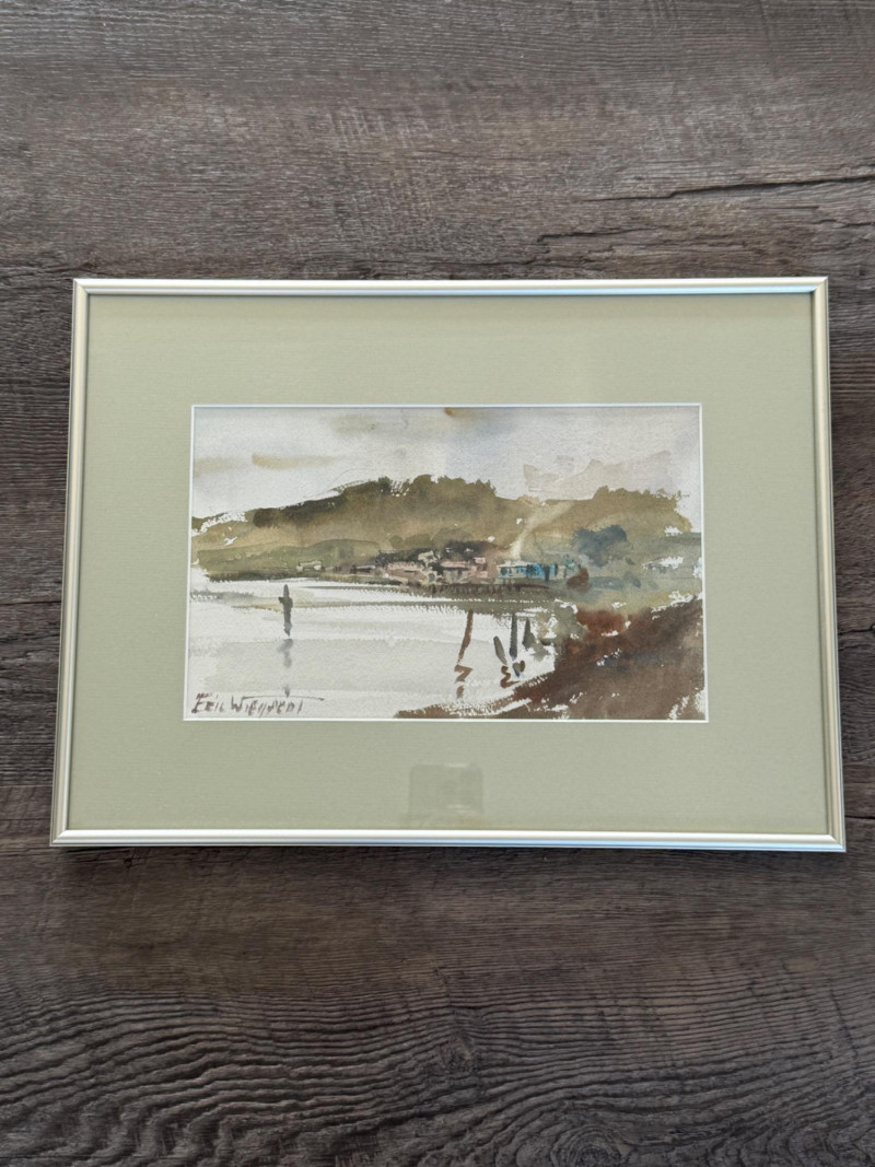 Original Watercolor by Eric Wiegardt – Framed Coastal Landscape Capture the serene beauty of the Pacific Northwest with this original watercolor by acclaimed American artist Eric Wiegardt, a signature member of the American Watercolor Society. Known for his fluid, expressive brushwork and atmospheric scenes, Wiegardt’s work has been widely exhibited and collected both nationally and internationally. This coastal composition features a tranquil shoreline village rendered in earthy tones and soft washes, evoking a timeless sense of place and mood. The artist’s signature appears clearly in the lower left corner. Framed Dimensions: 16" W x 12" H