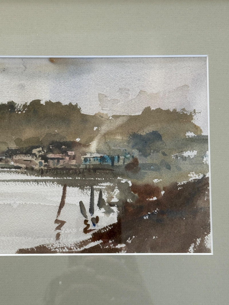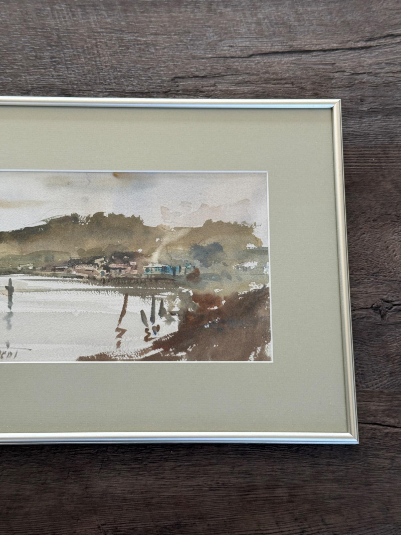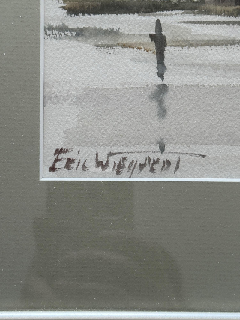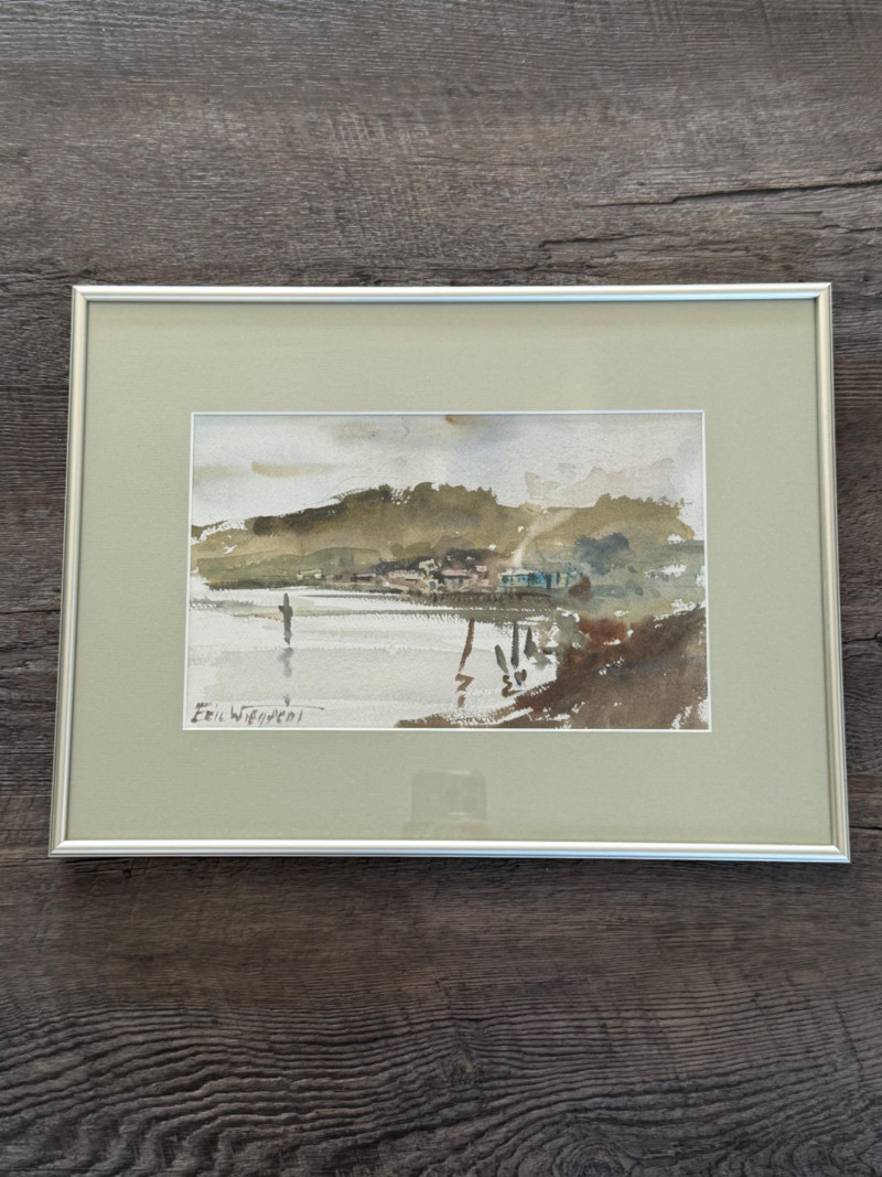 Original Watercolor by Eric Wiegardt – Framed Coastal Landscape Capture the serene beauty of the Pacific Northwest with this original watercolor by acclaimed American artist Eric Wiegardt, a signature member of the American Watercolor Society. Known for his fluid, expressive brushwork and atmospheric scenes, Wiegardt’s work has been widely exhibited and collected both nationally and internationally. This coastal composition features a tranquil shoreline village rendered in earthy tones and soft washes, evoking a timeless sense of place and mood. The artist’s signature appears clearly in the lower left corner. Framed Dimensions: 16" W x 12" H