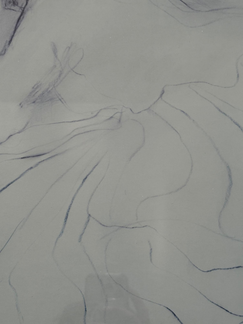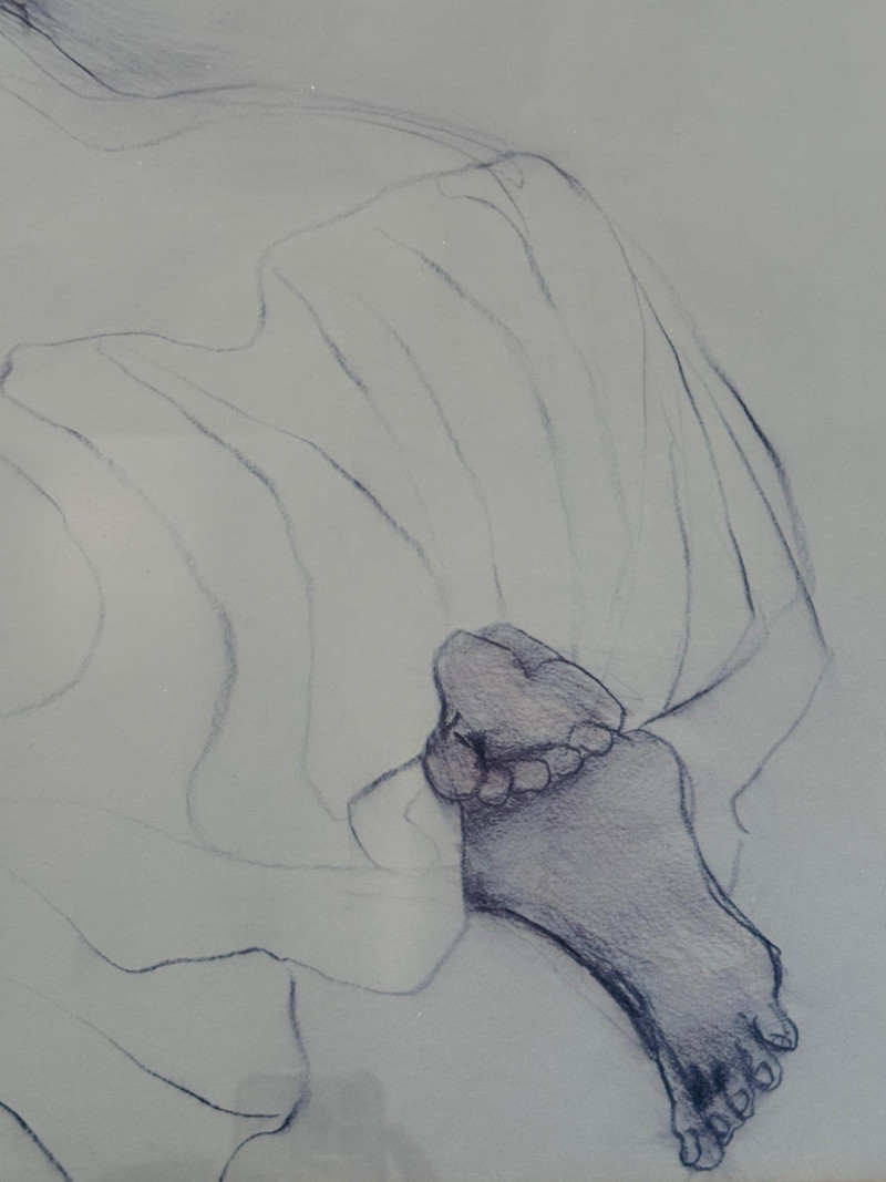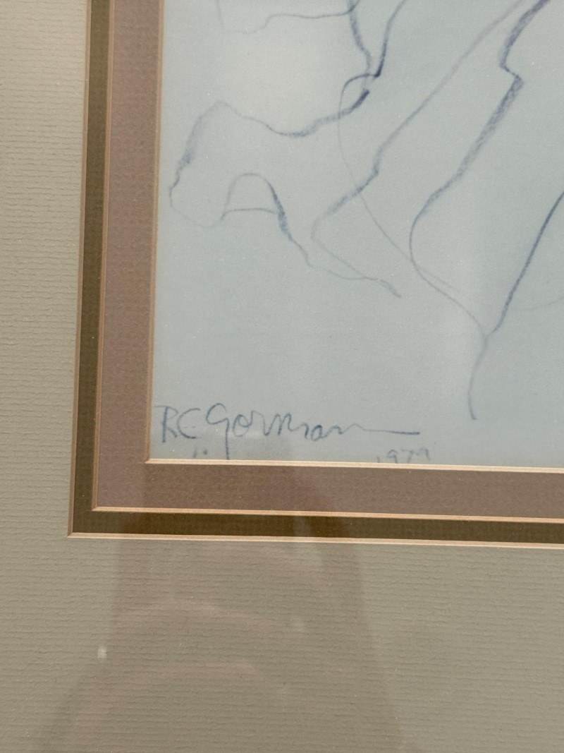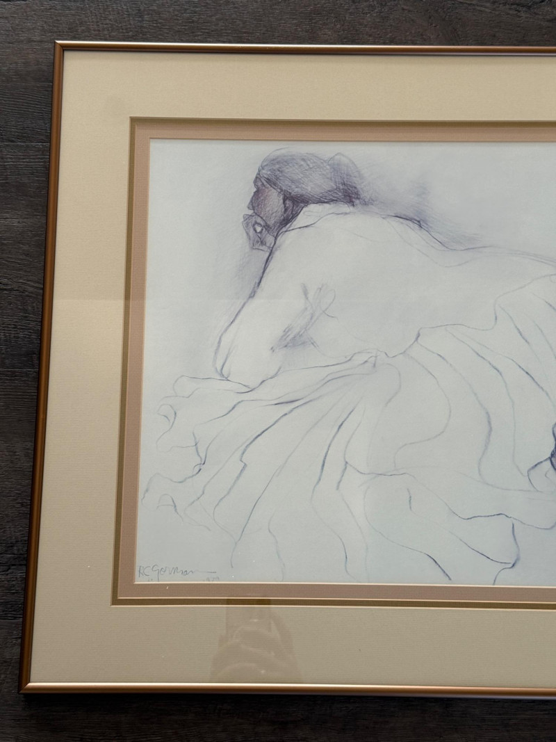 1972 Framed Reclining Figure Sketch Graphite or ink drawing of a reclining figure viewed from the back. The composition shows the figure partially draped in cloth, with visible outlines of the arm, shoulder, and feet. The image is framed with a double mat in neutral tones. Signed lower left. Measurements: 23 x 27 inches (including frame).