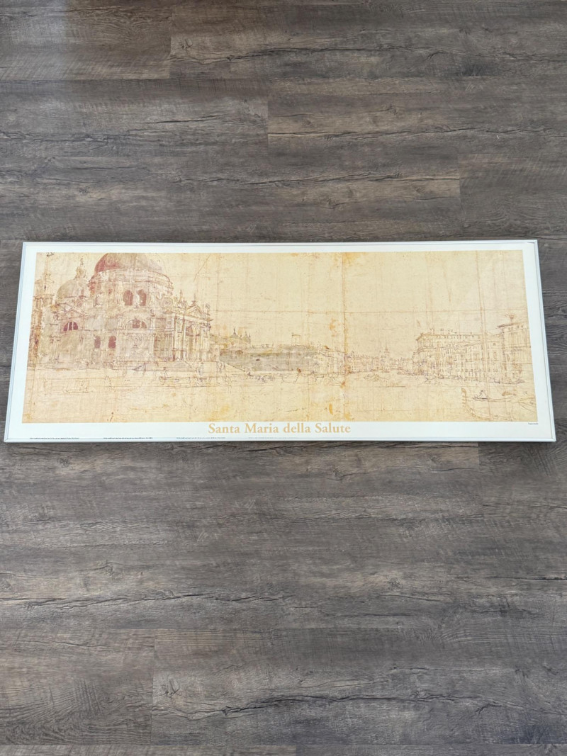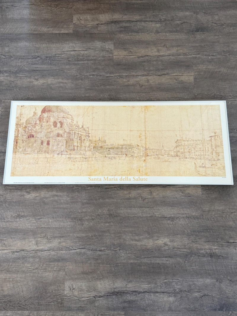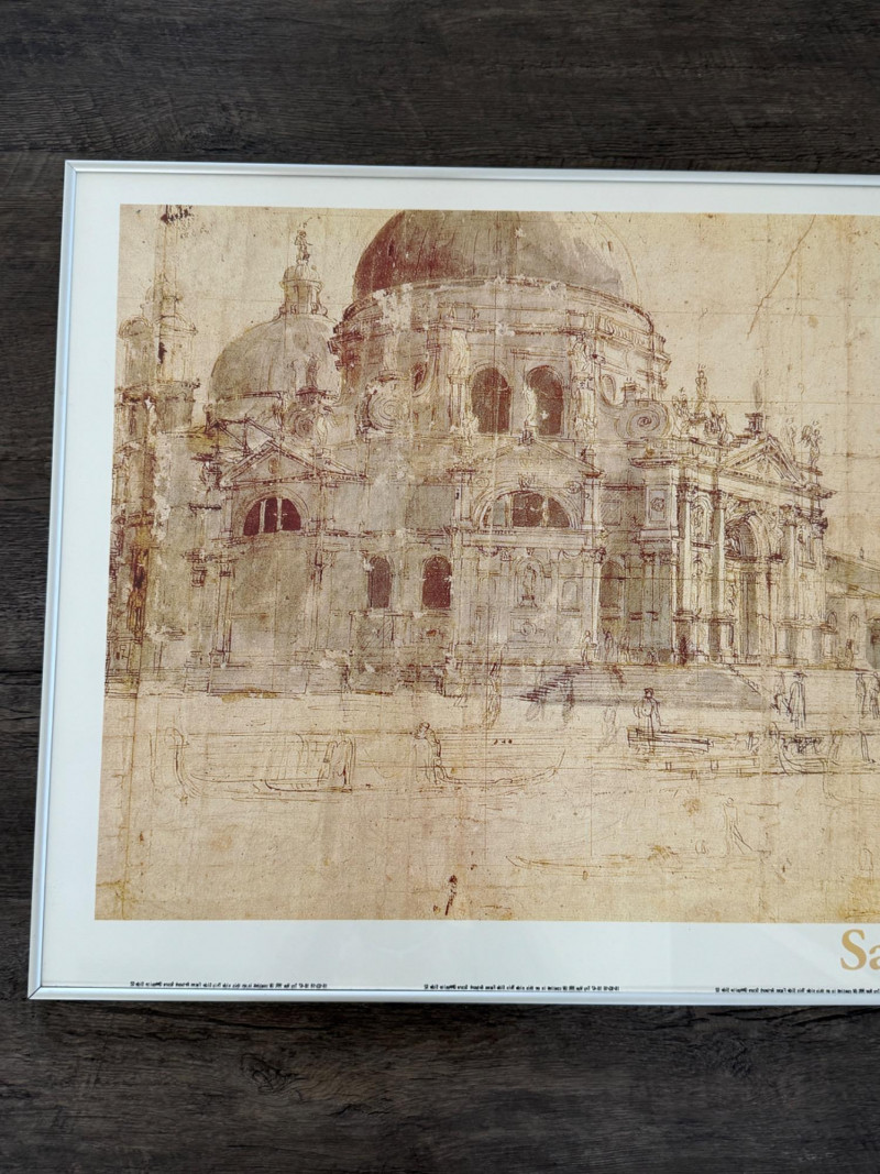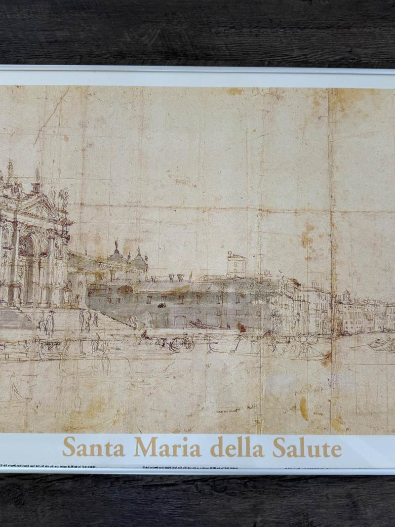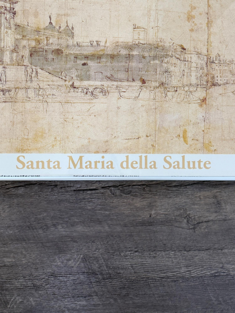 Santa Maria della Salute – Vanvitelli Print Framed print of Vanvitelli’s drawing of Santa Maria della Salute in Venice. Shows the basilica and surrounding buildings along the Grand Canal. Title printed at the bottom. Metal frame with wire for hanging. Info sheet attached at the back. Measurements: