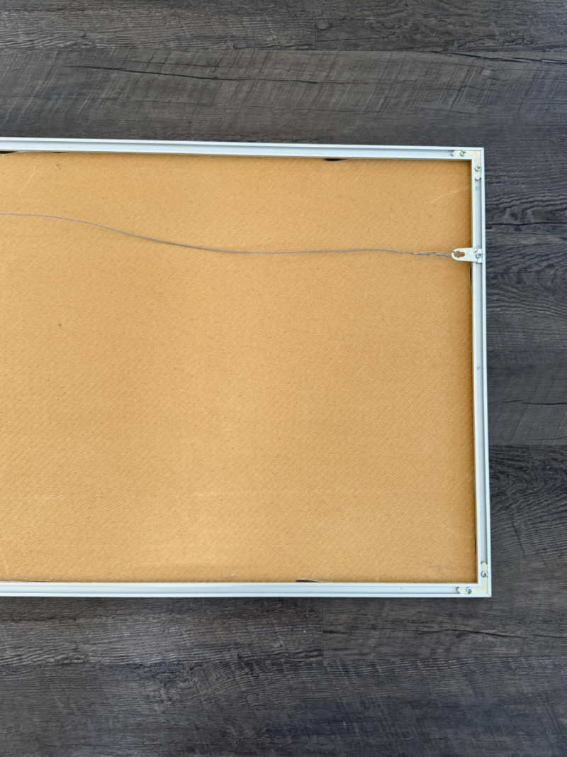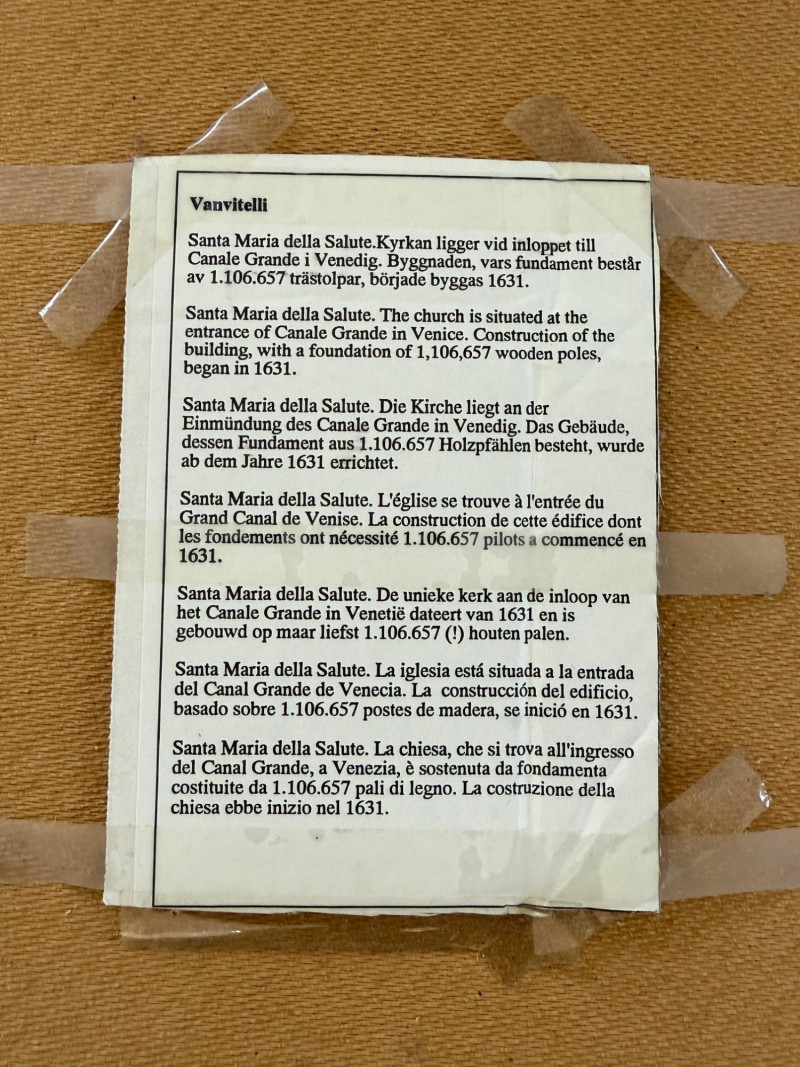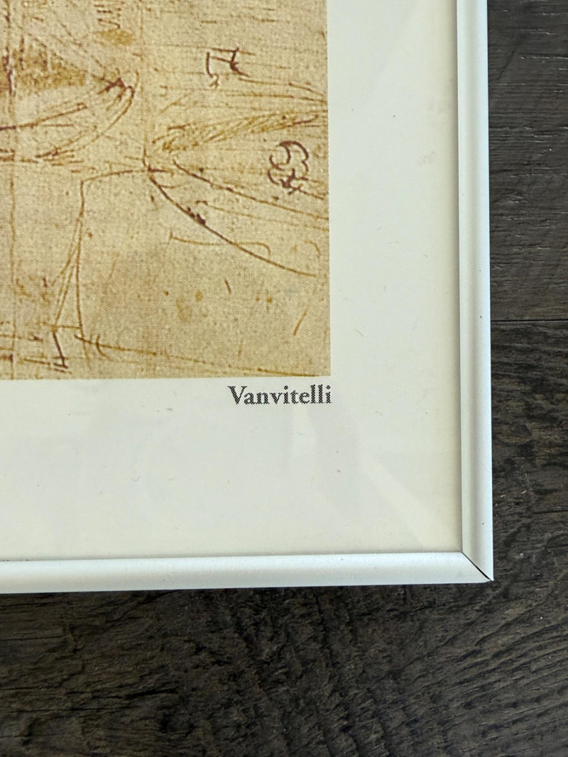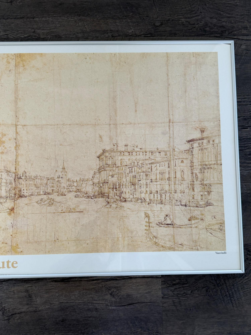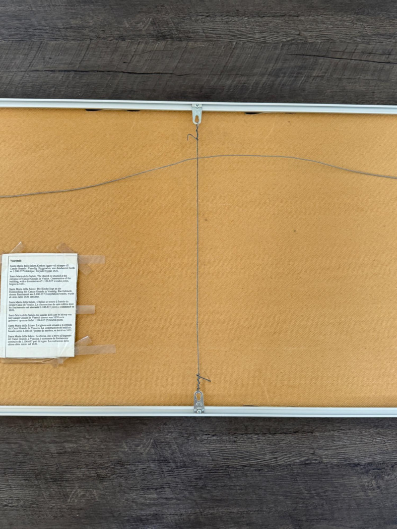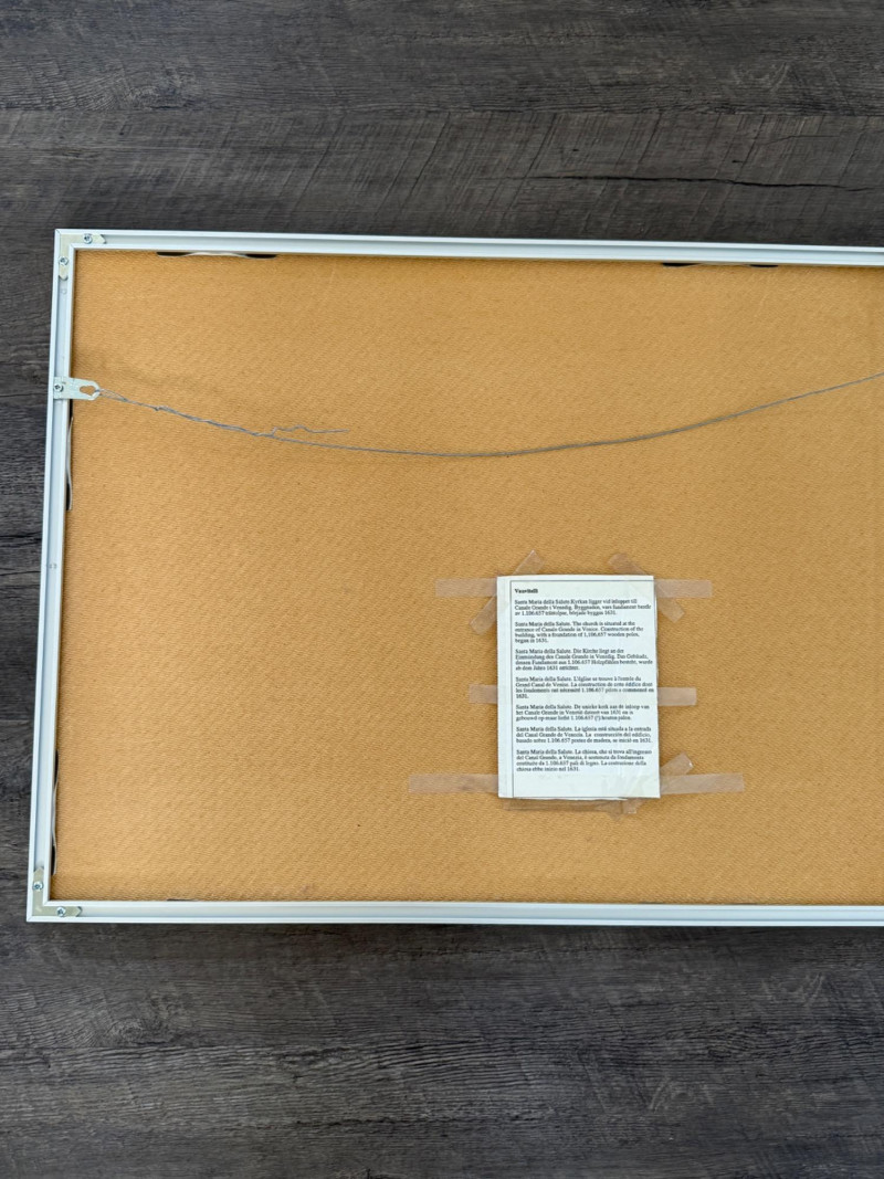 Santa Maria della Salute – Vanvitelli Print Framed print of Vanvitelli’s drawing of Santa Maria della Salute in Venice. Shows the basilica and surrounding buildings along the Grand Canal. Title printed at the bottom. Metal frame with wire for hanging. Info sheet attached at the back. Measurements: