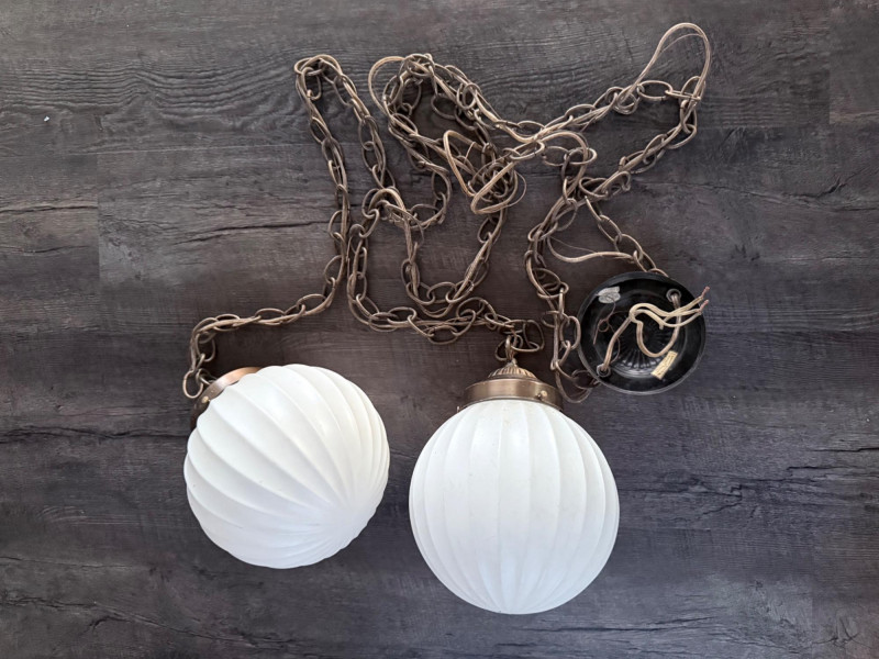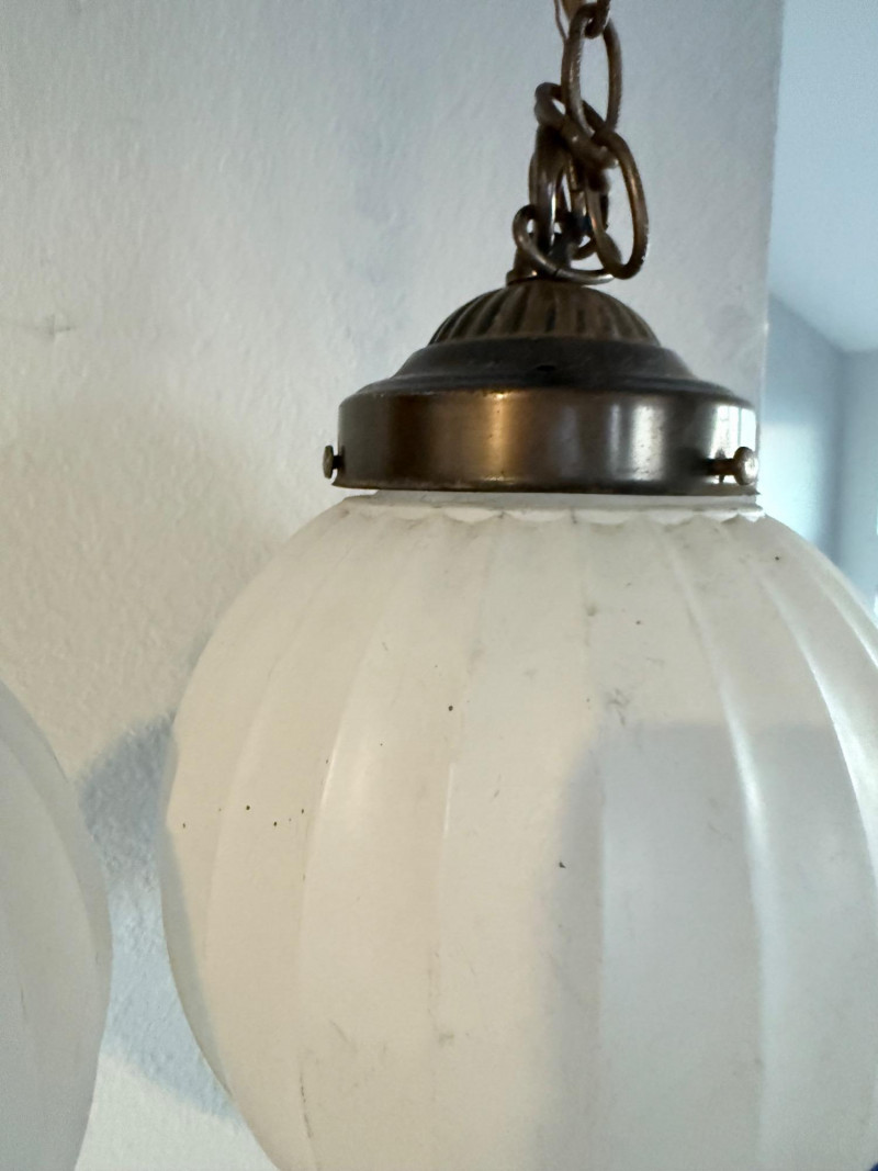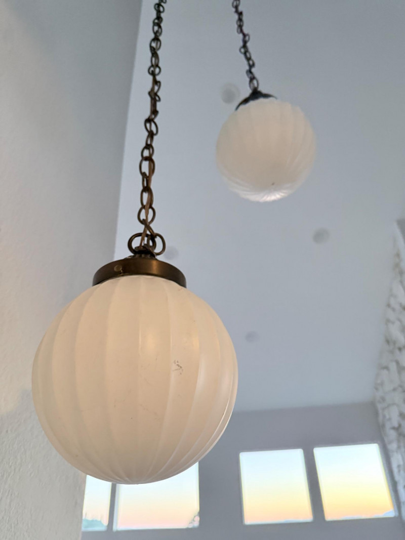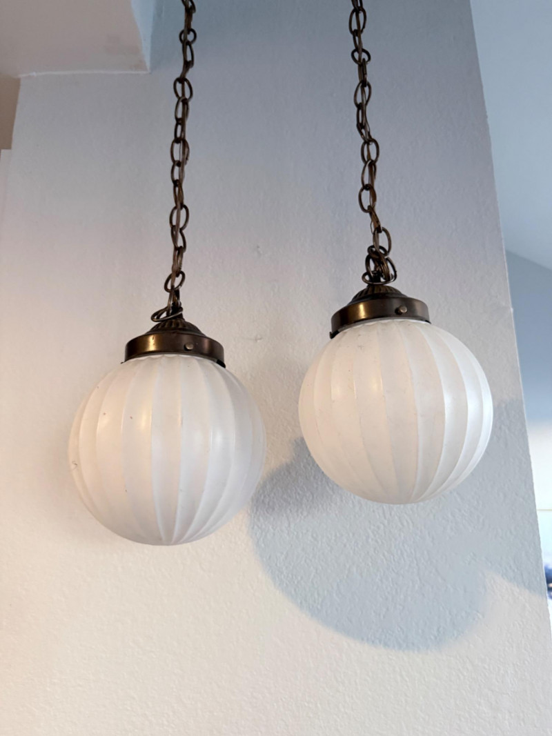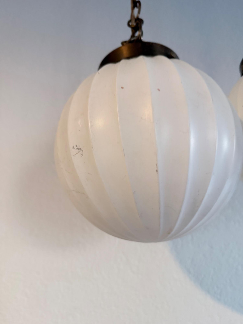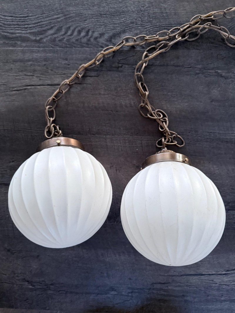 Lot # 101 - Pair of Vintage Ribbed White Glass Globe Pendant Lights