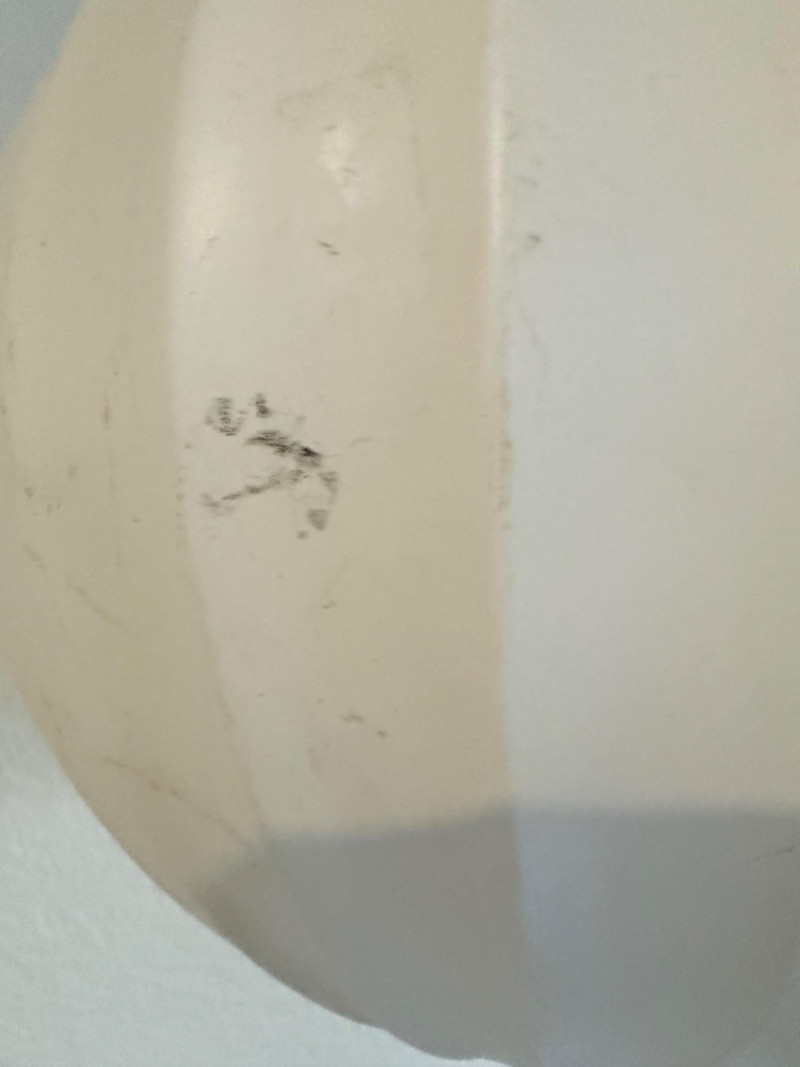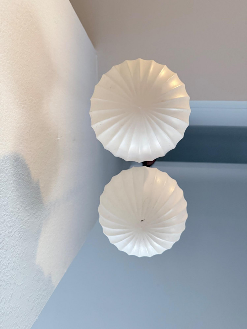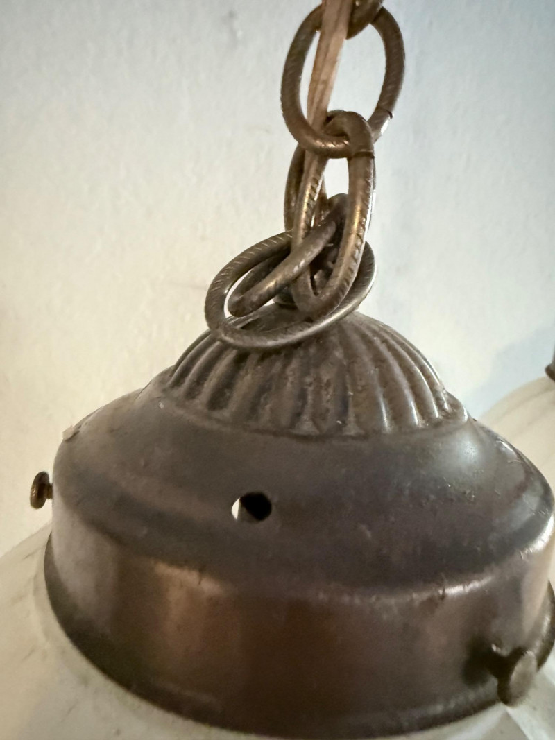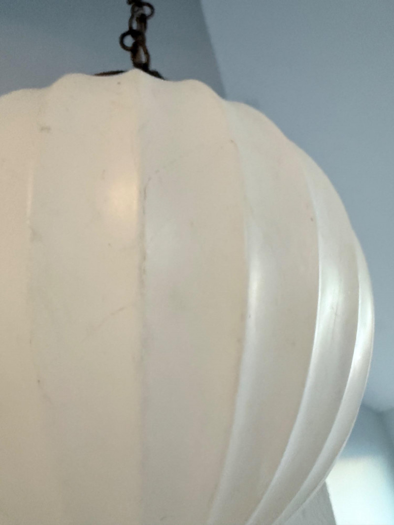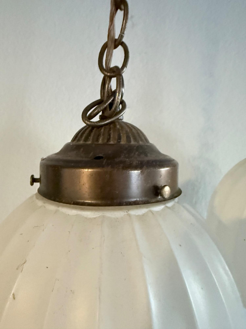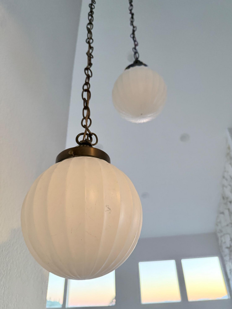 Lot # 101 - Pair of Vintage Ribbed White Glass Globe Pendant Lights