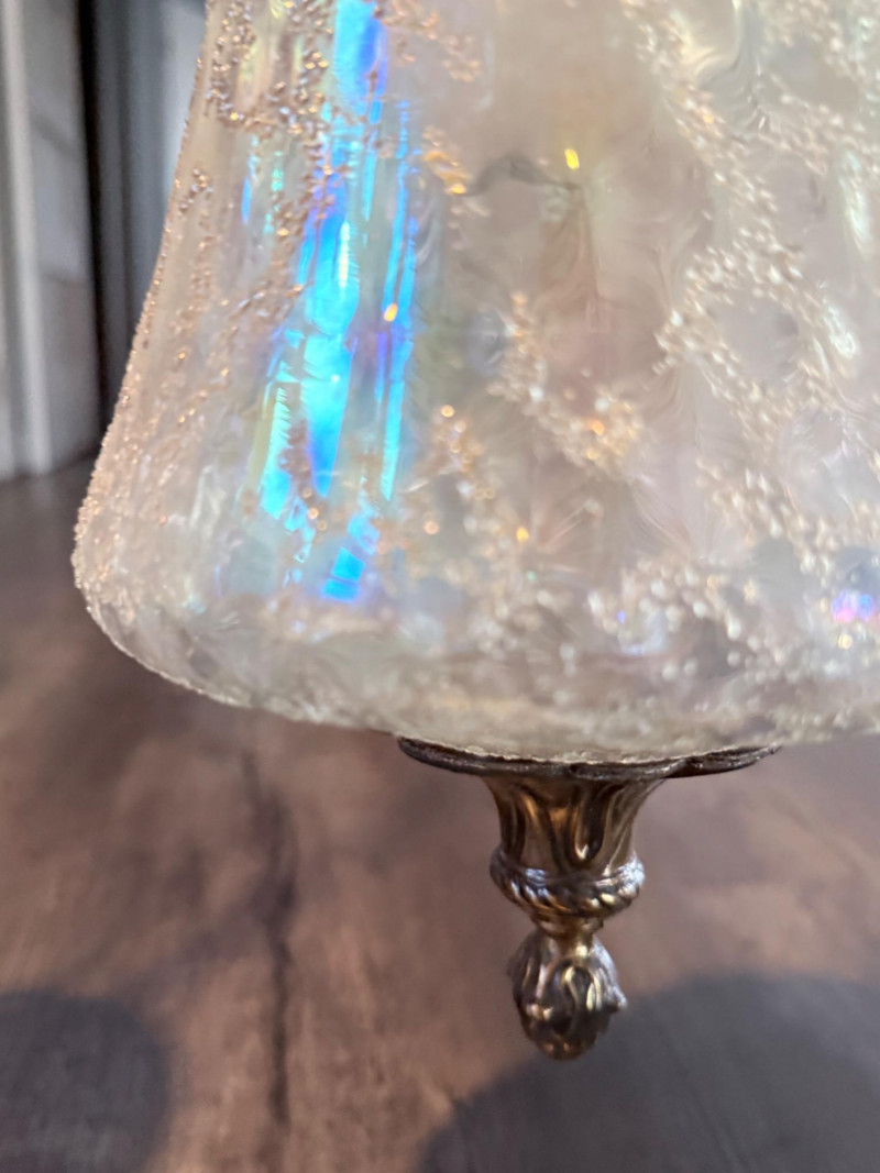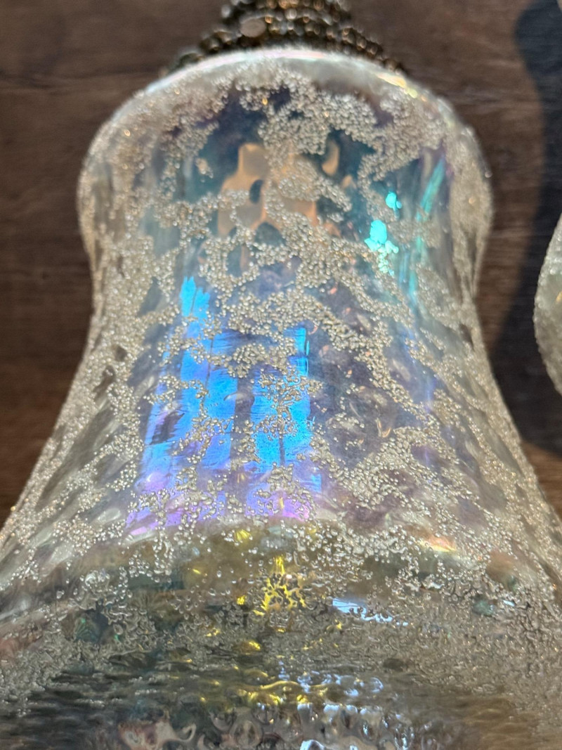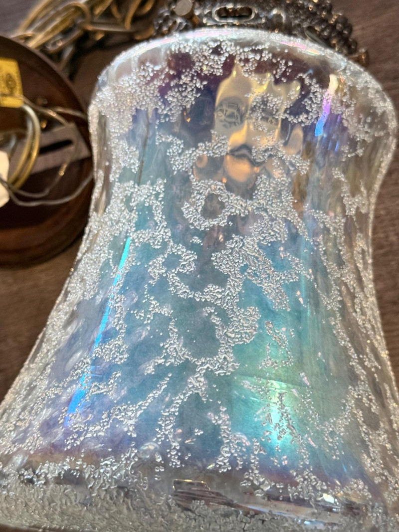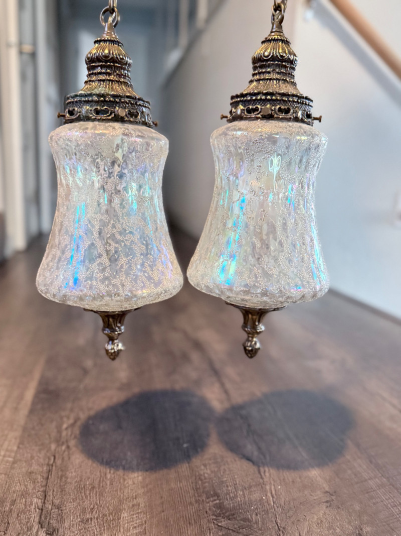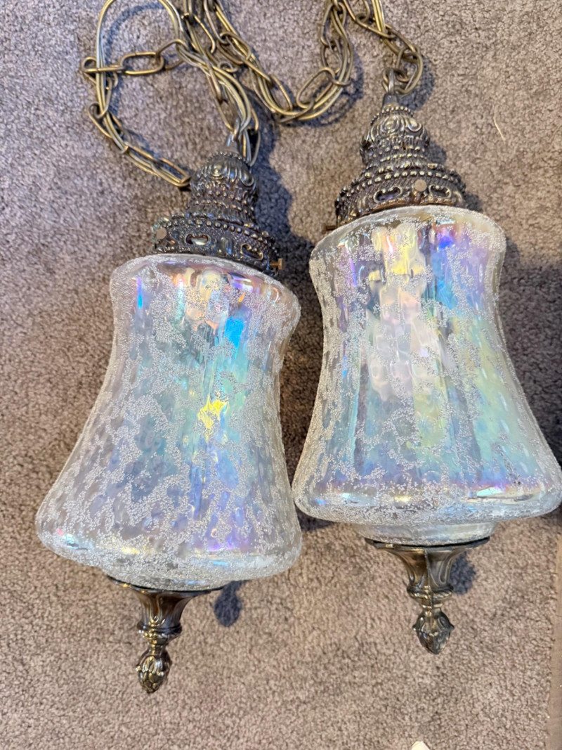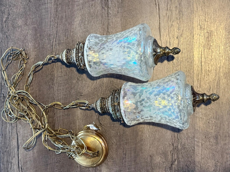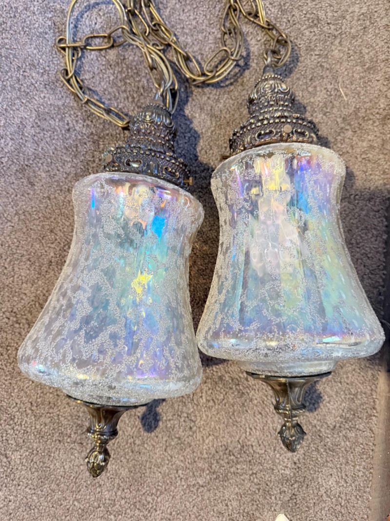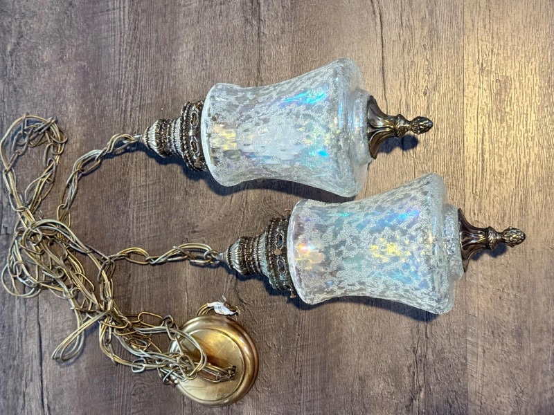 Pair of Iridescent Hanging Lights Hardwired hanging light fixtures featuring flared glass shades with an iridescent surface and raised textured pattern. Each fixture is suspended by a metal chain and includes ornate brass-toned metal fittings at the top and bottom. Wired for installation, UL-listed components visible on the mounting plates. Measurements: Note: Electrical wiring has not been tested on this item.
