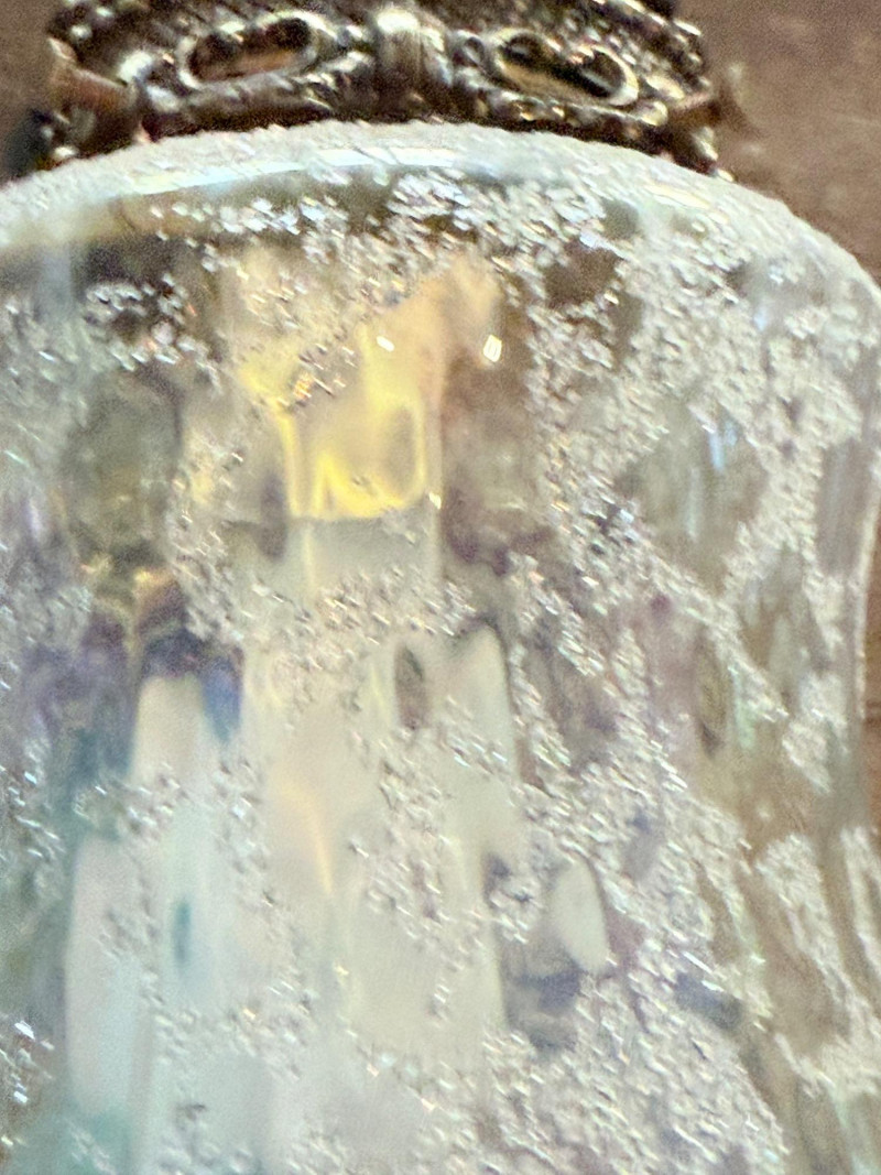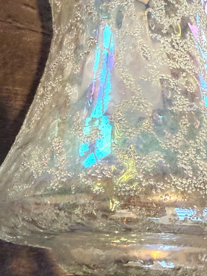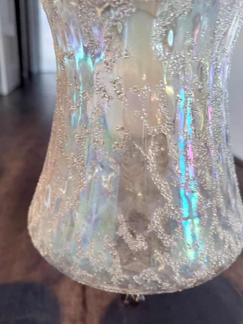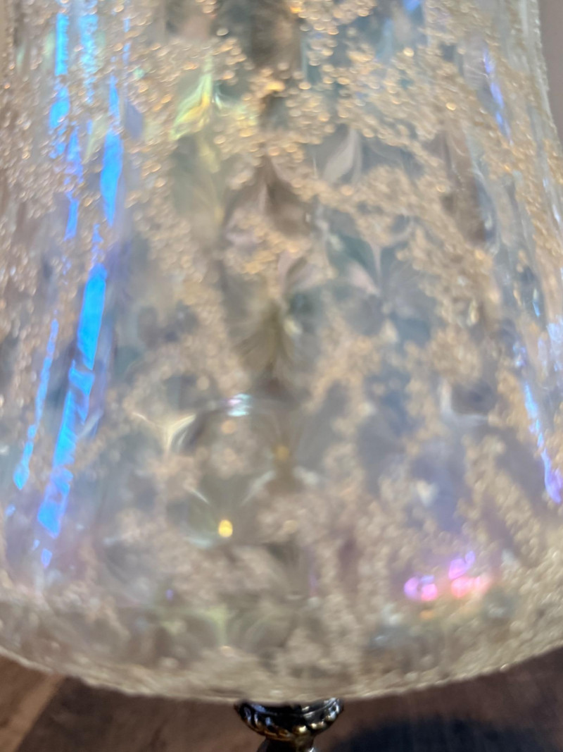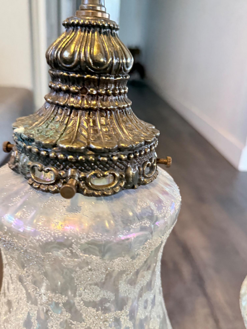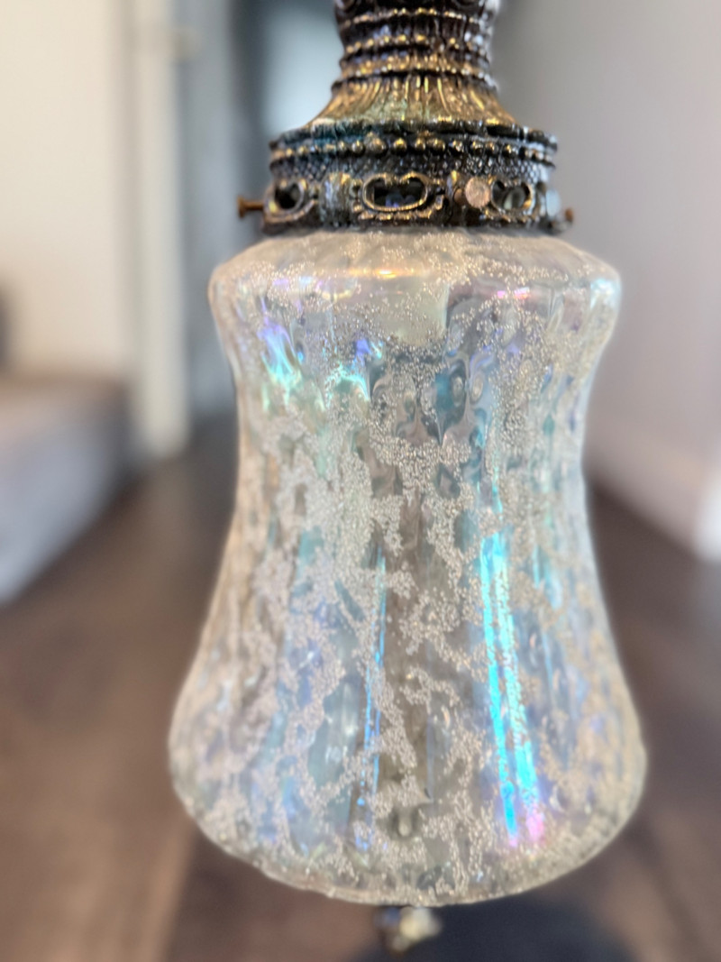 Pair of Iridescent Hanging Lights Hardwired hanging light fixtures featuring flared glass shades with an iridescent surface and raised textured pattern. Each fixture is suspended by a metal chain and includes ornate brass-toned metal fittings at the top and bottom. Wired for installation, UL-listed components visible on the mounting plates. Measurements: Note: Electrical wiring has not been tested on this item.