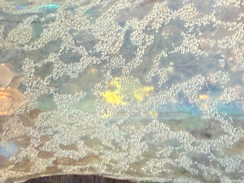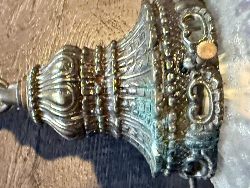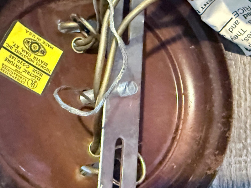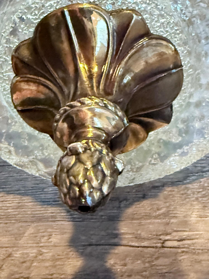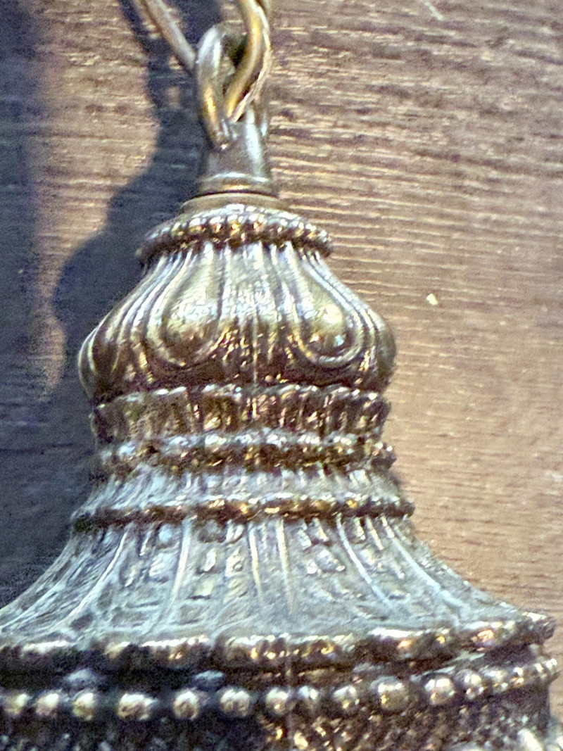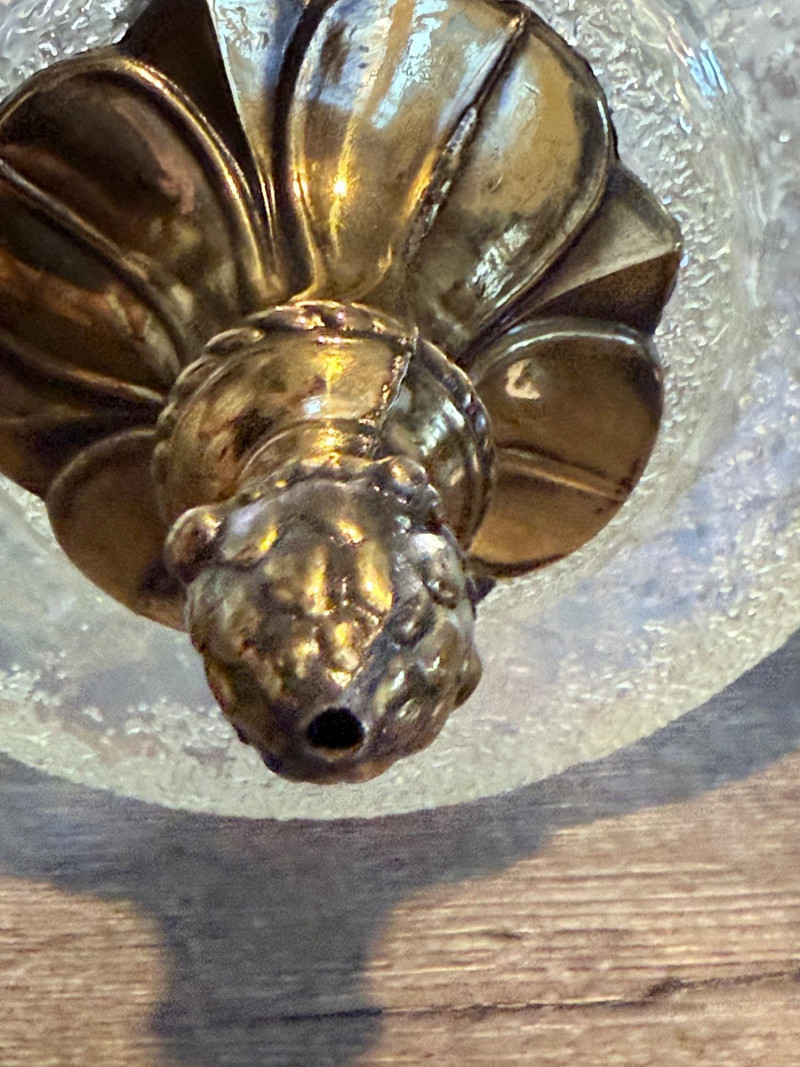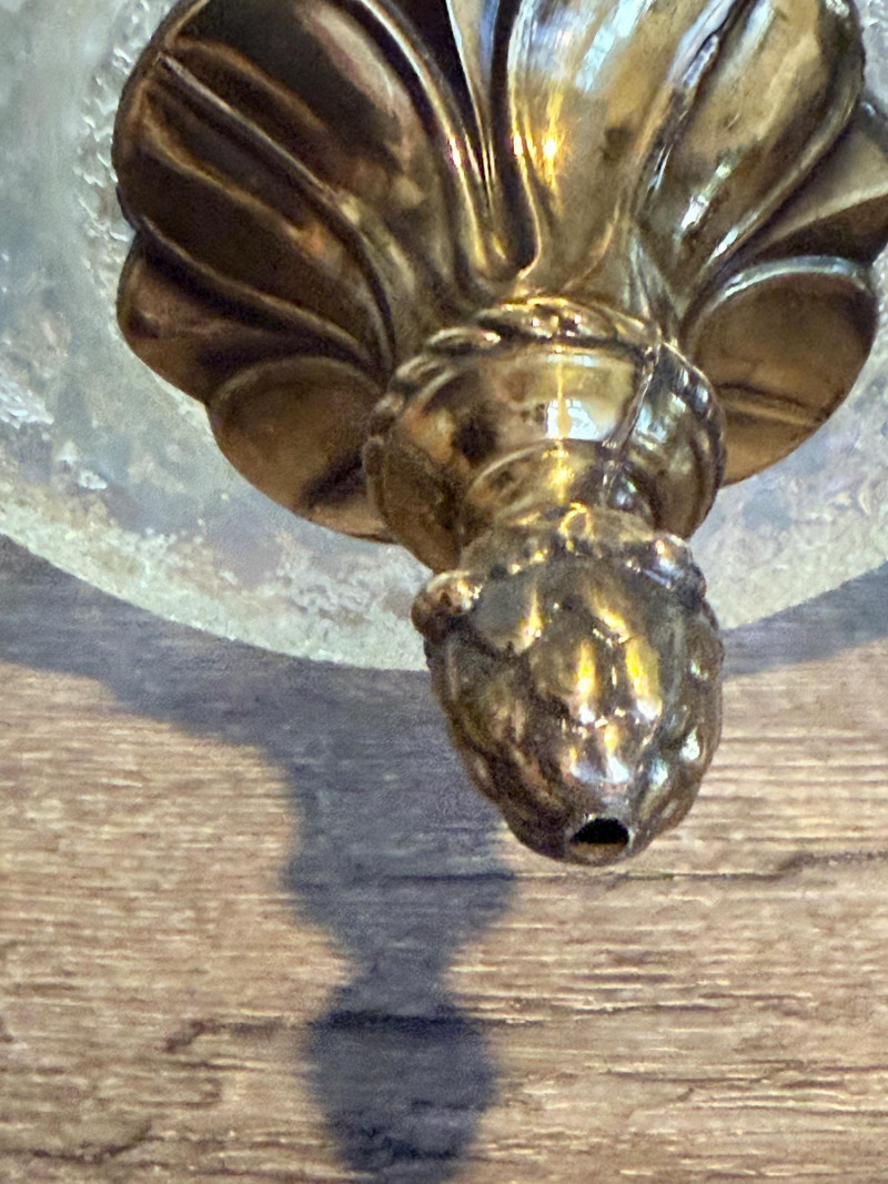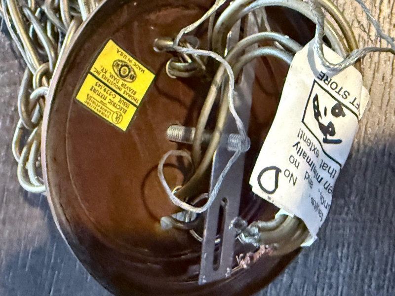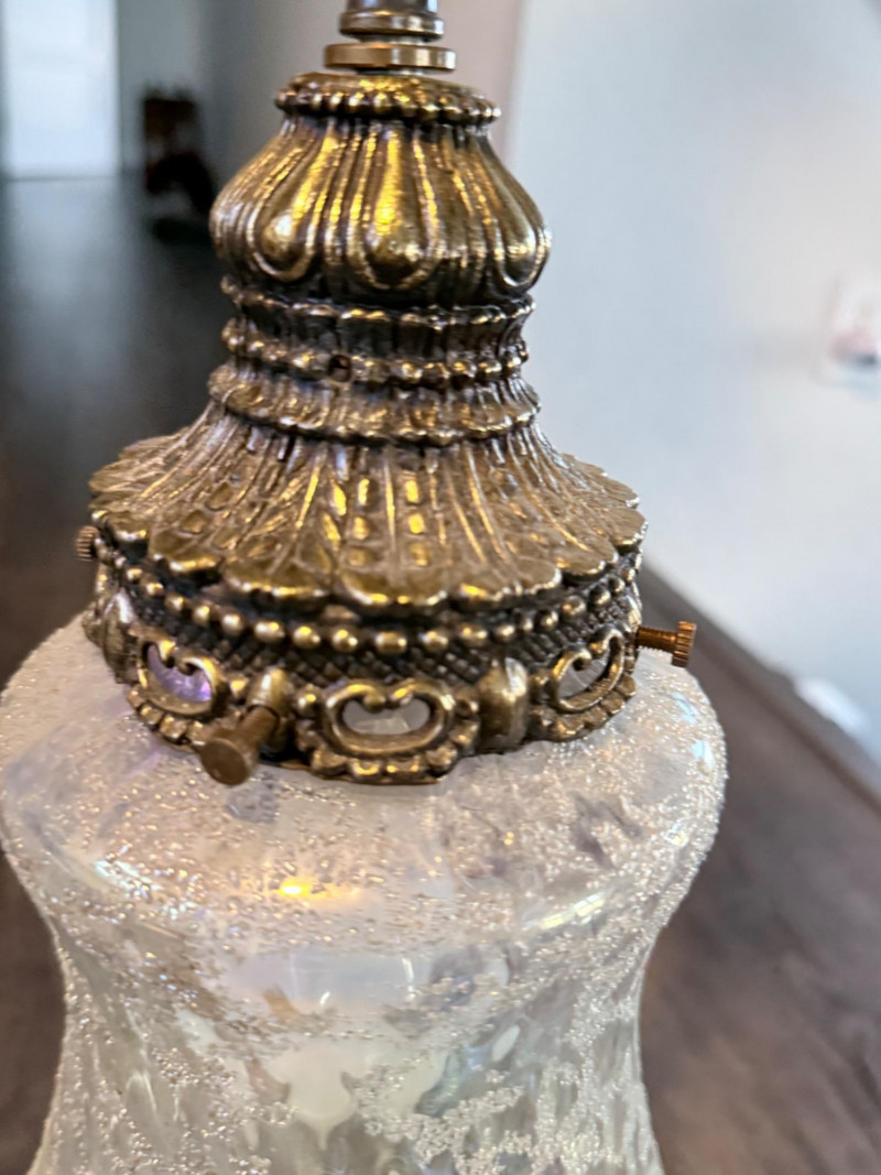 Pair of Iridescent Hanging Lights Hardwired hanging light fixtures featuring flared glass shades with an iridescent surface and raised textured pattern. Each fixture is suspended by a metal chain and includes ornate brass-toned metal fittings at the top and bottom. Wired for installation, UL-listed components visible on the mounting plates. Measurements: Note: Electrical wiring has not been tested on this item.