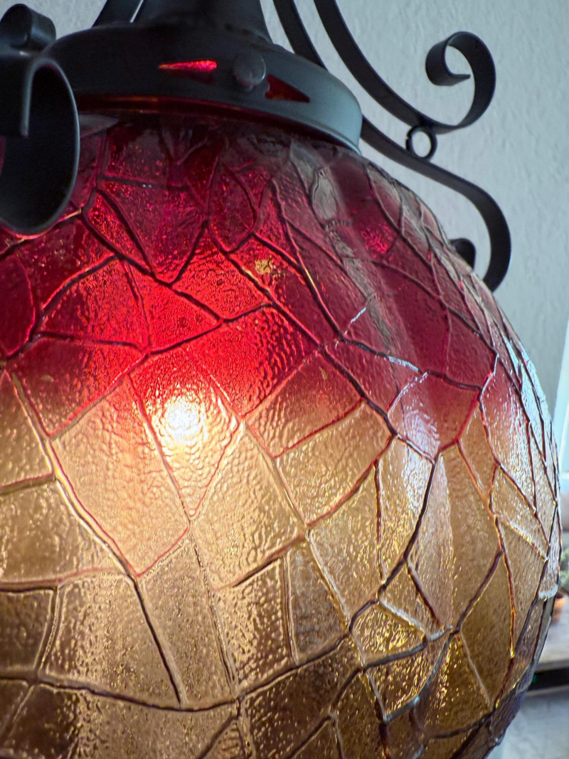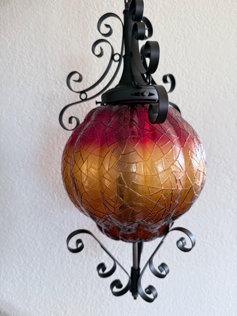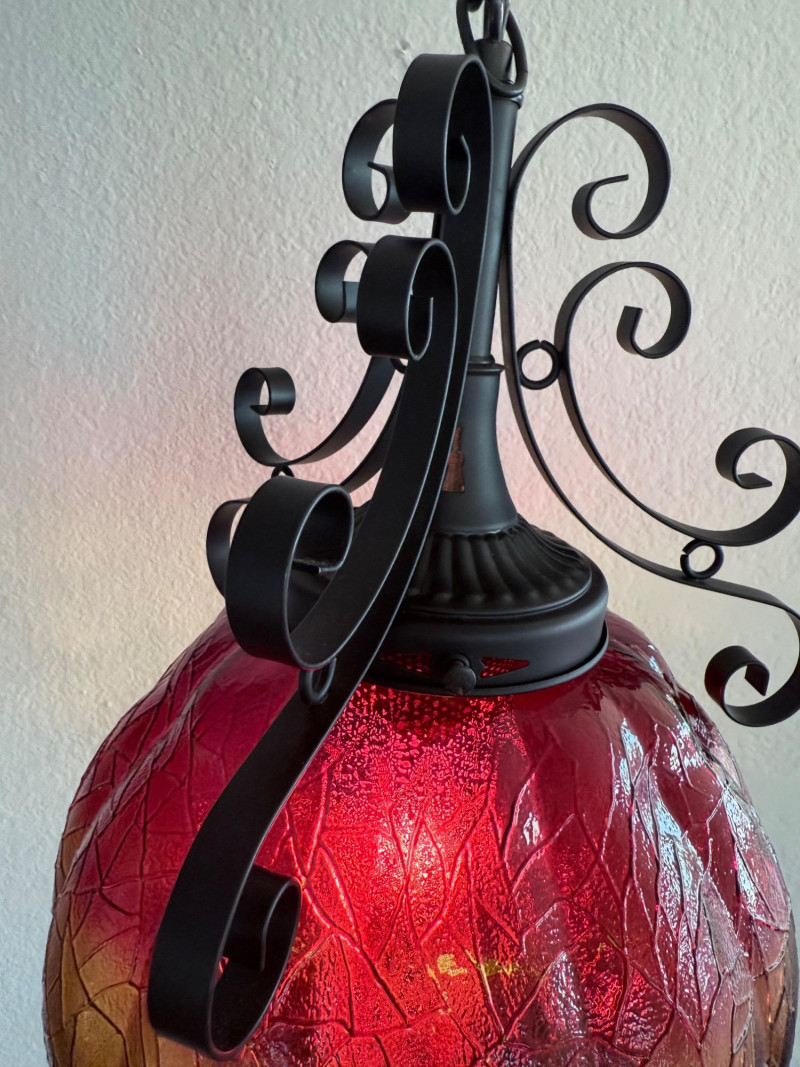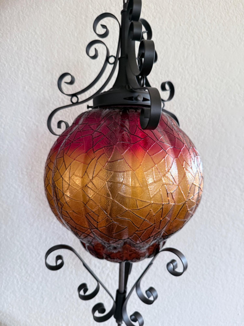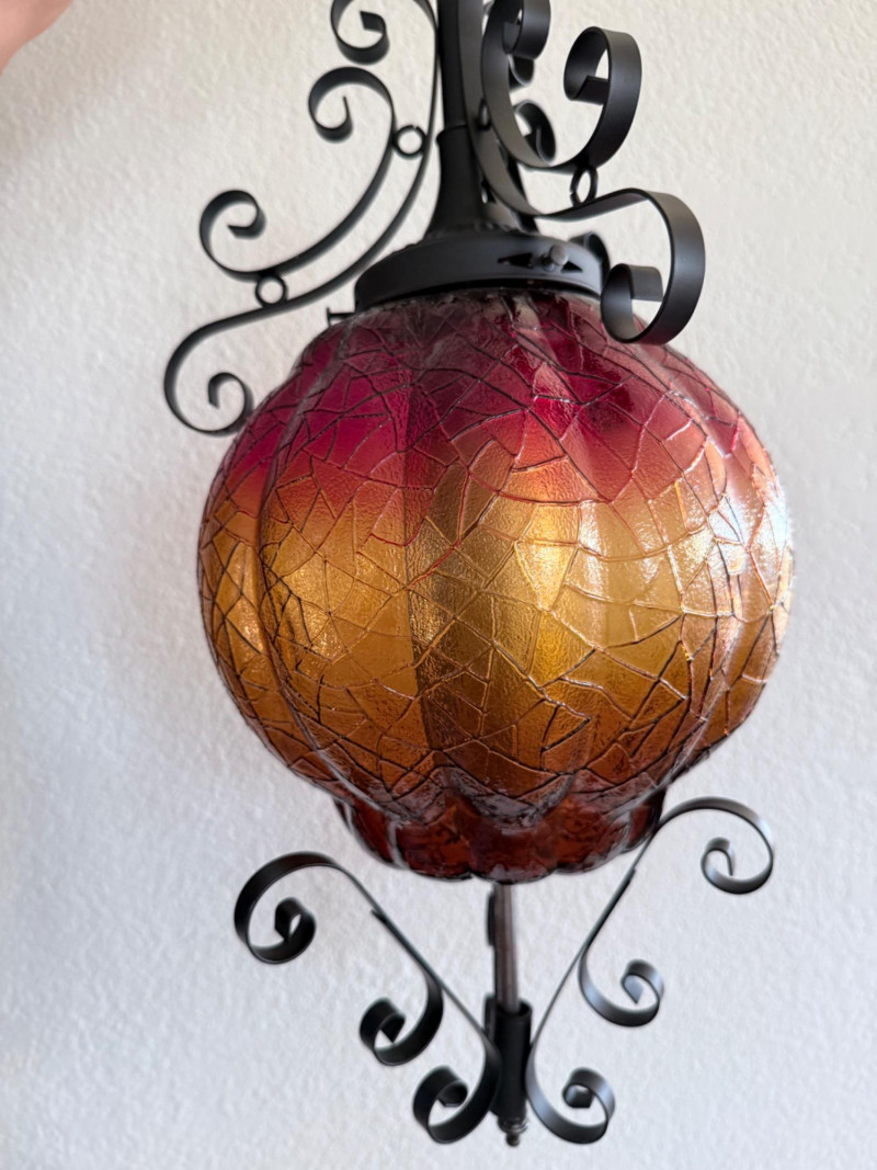 Plug-in hanging lamp with a red and amber textured glass globe encased in a black scrollwork metal frame. Includes a long black chain and cord with inline switch and plug.