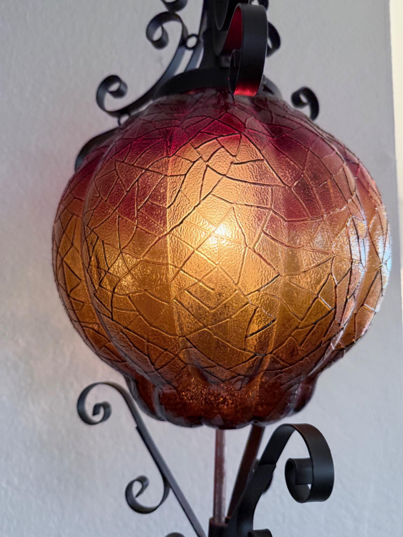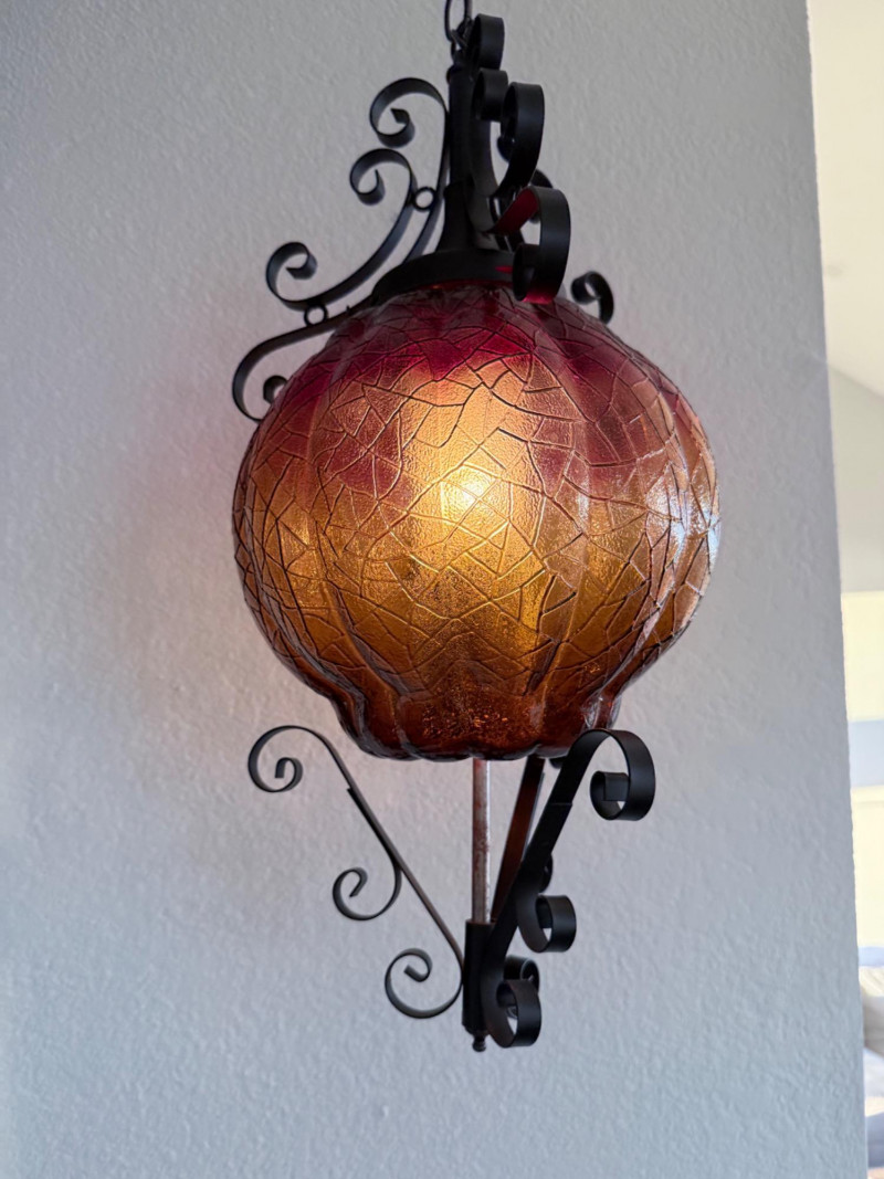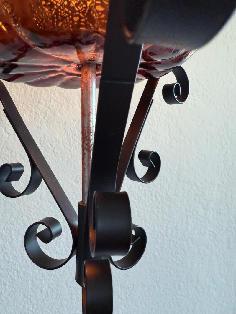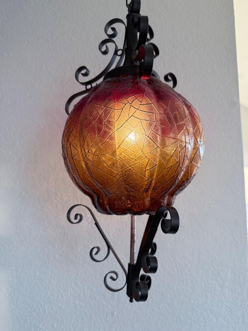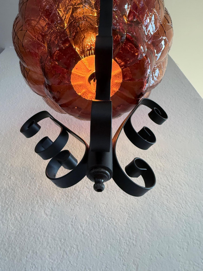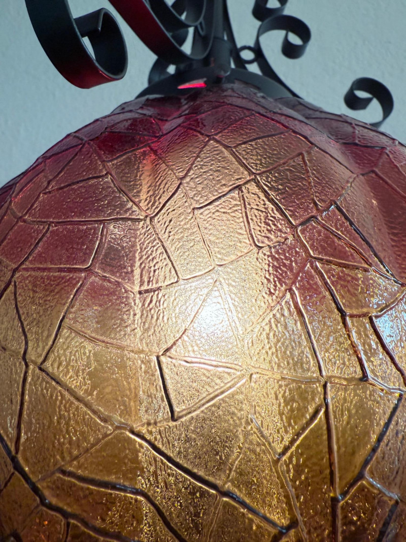 Plug-in hanging lamp with a red and amber textured glass globe encased in a black scrollwork metal frame. Includes a long black chain and cord with inline switch and plug.