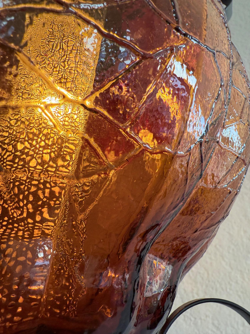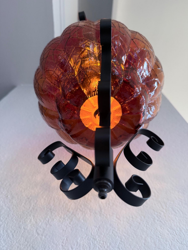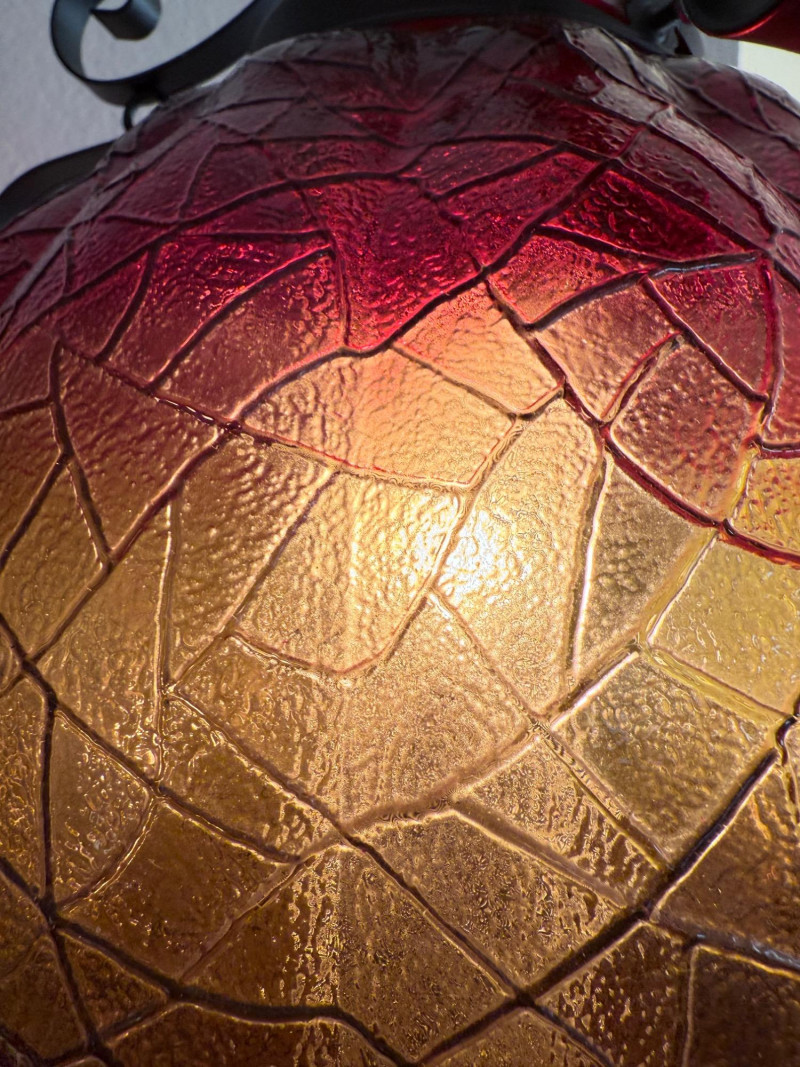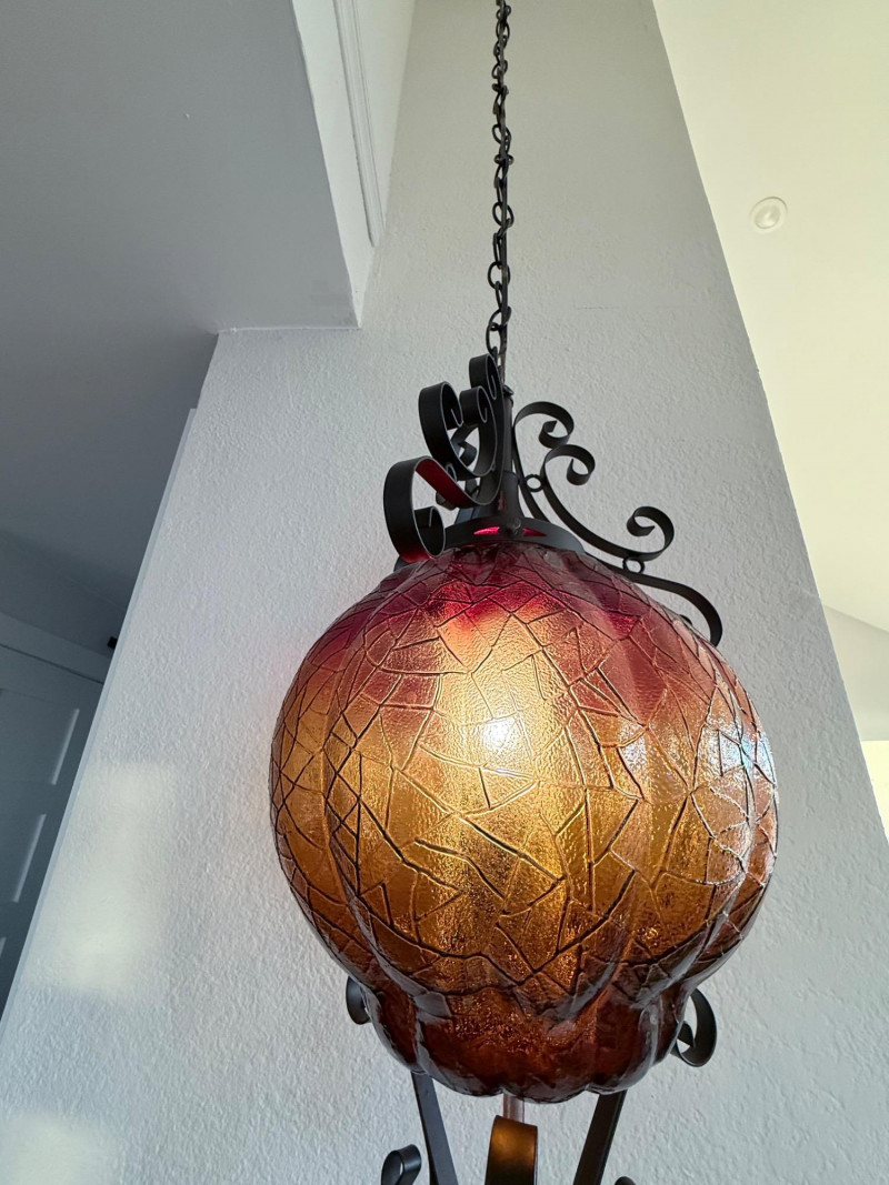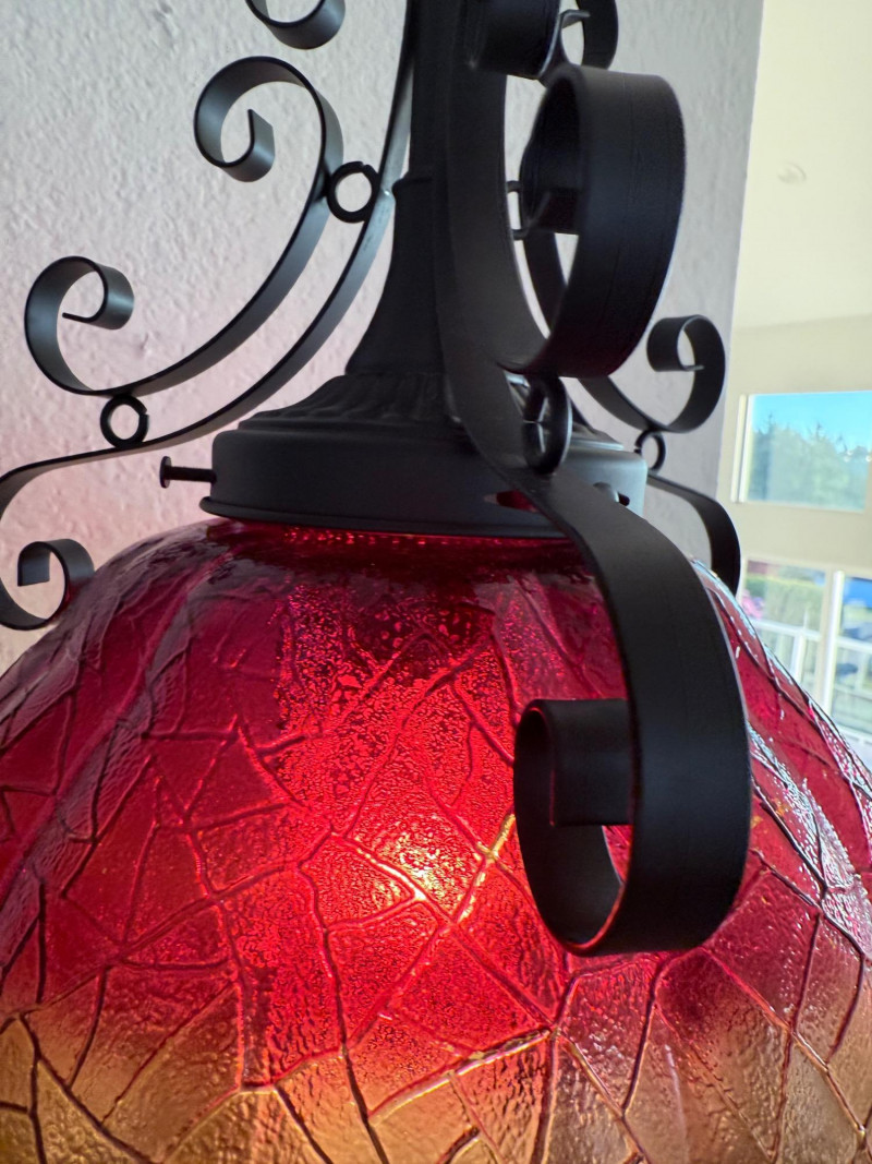 Plug-in hanging lamp with a red and amber textured glass globe encased in a black scrollwork metal frame. Includes a long black chain and cord with inline switch and plug.