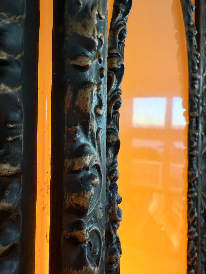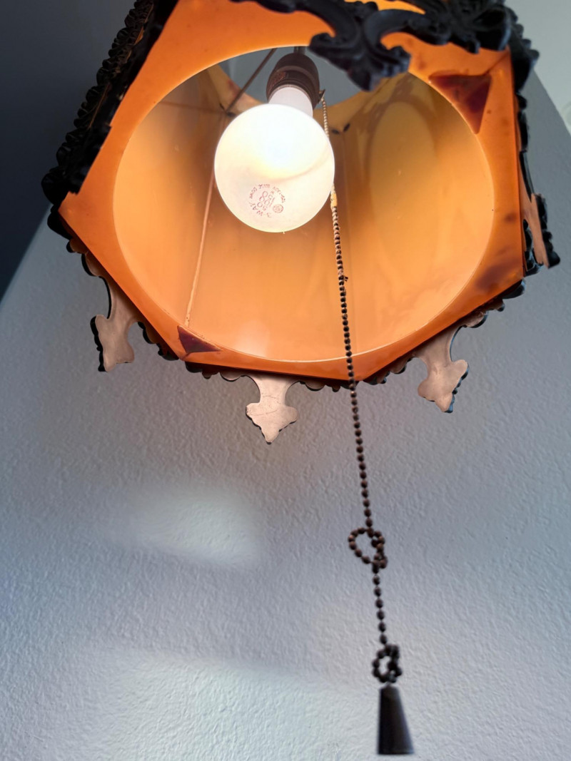 Hanging light fixture featuring an octagonal shape with black decorative panels and an inner orange lining. The black exterior appears to be a molded resin with raised patterns. The inner orange panel is a thin, semi-rigid translucent plastic, likely heat-resistant. It has a pull chain switch and a plug-in cord. Includes a hanging chain and a loop for ceiling mounting.
