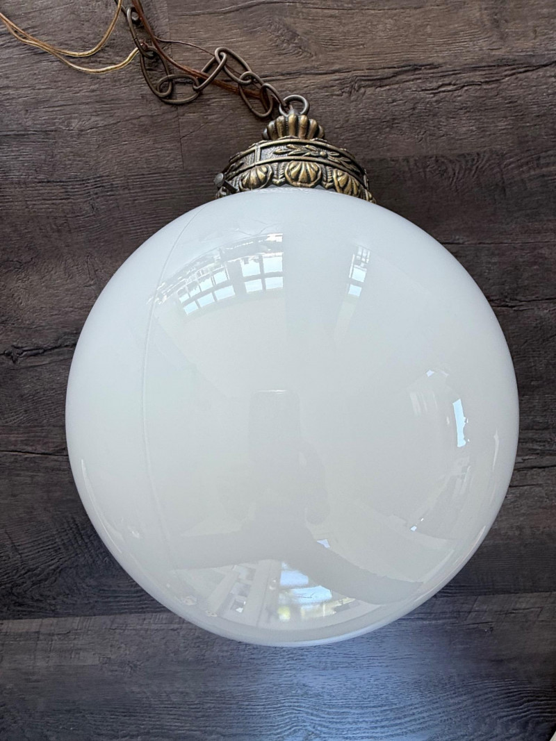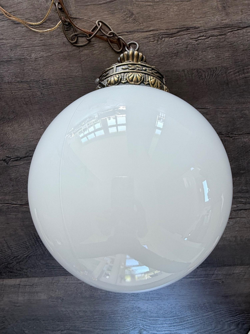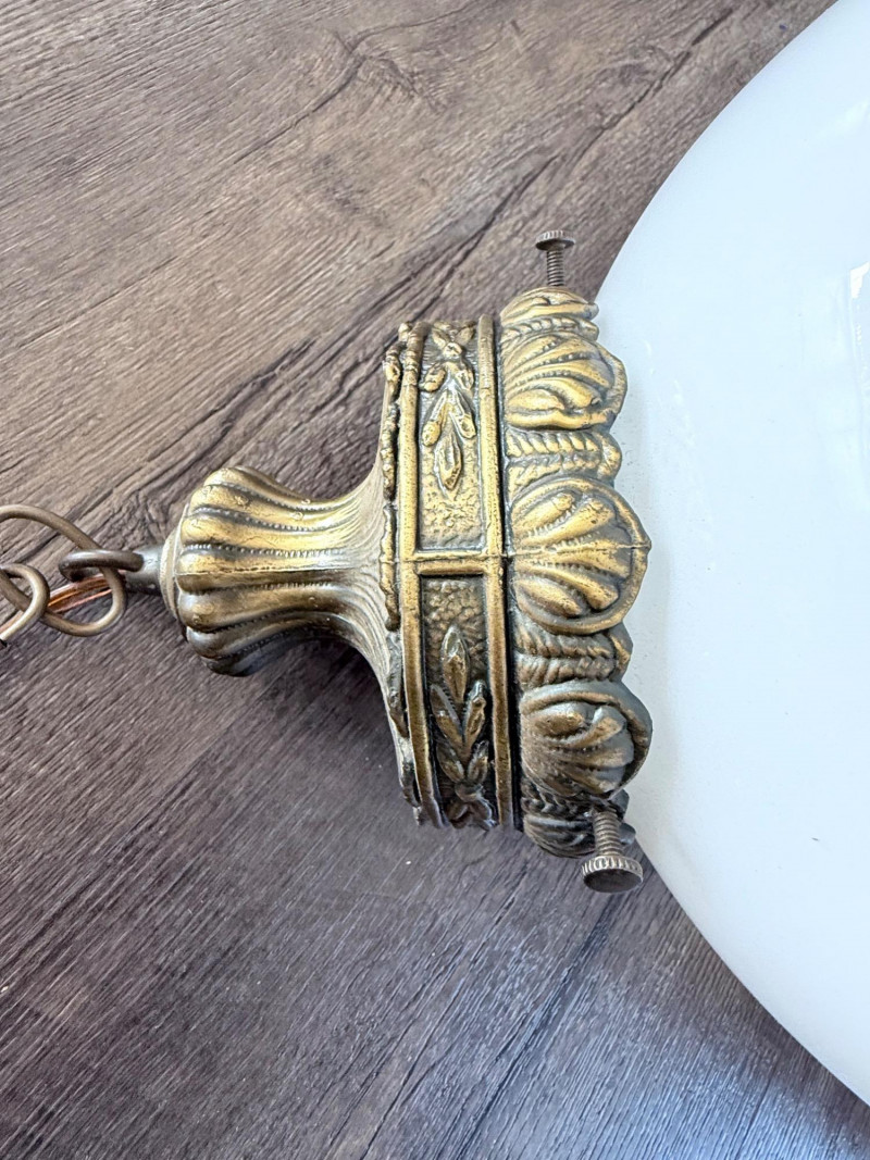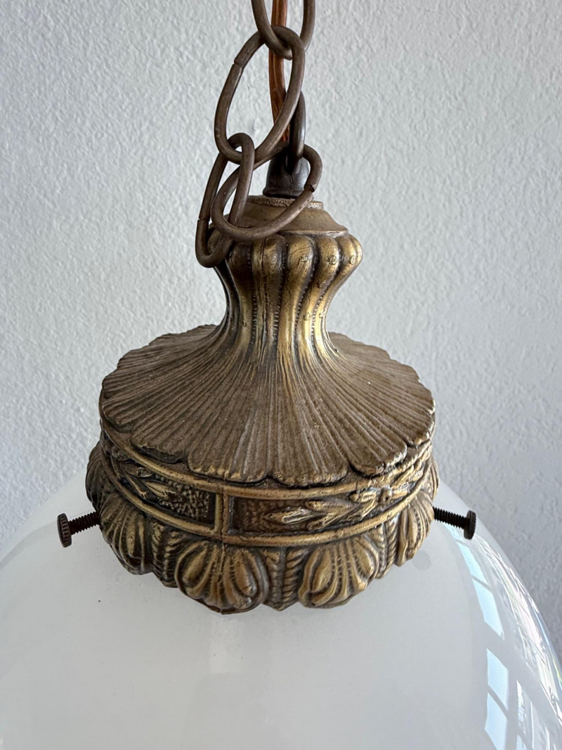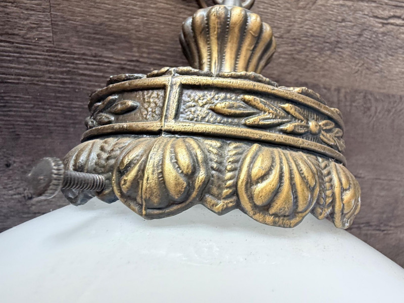 Brass Pendant Light with Opaline Glass Globe Hanging light fixture featuring a round opaline glass globe and a detailed brass-tone metal cap and canopy with raised floral and ribbed patterns. Hardwired type with a ceiling mount plate, hanging chain, and wiring. Marked with Underwriters Laboratories label. Measurements: Note: Electrical wiring has not been tested on this item.