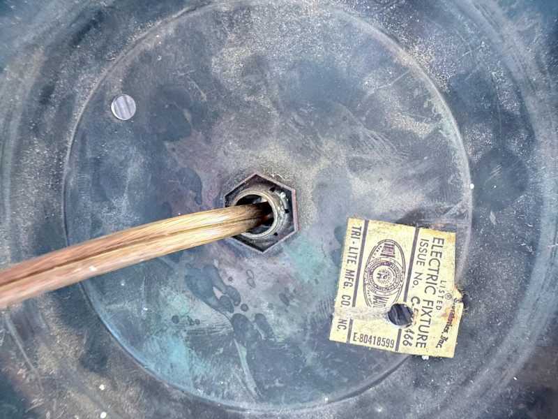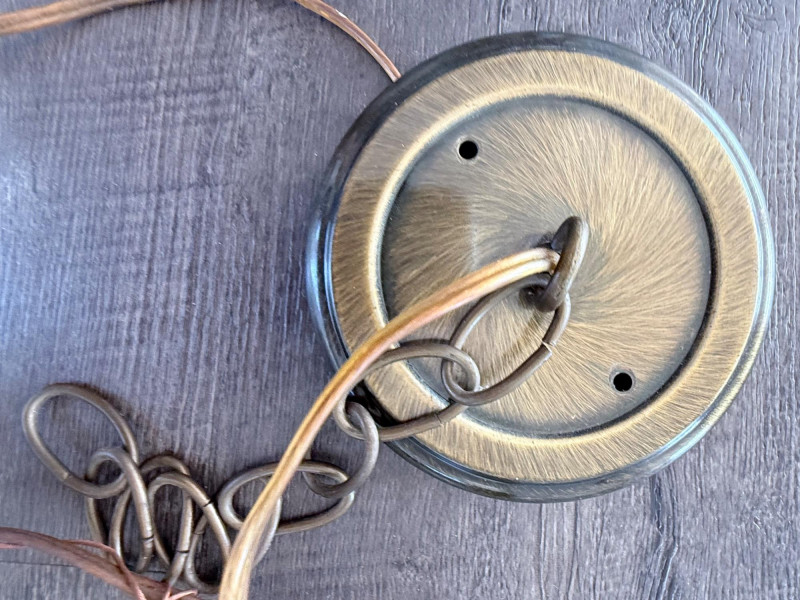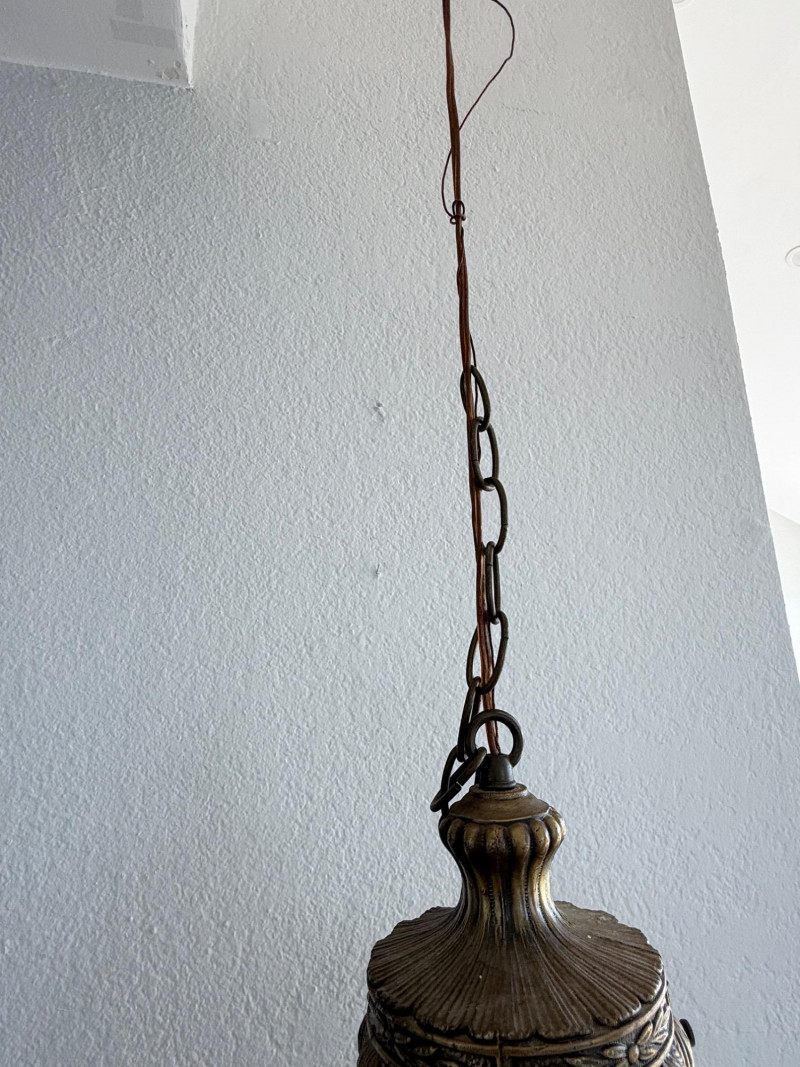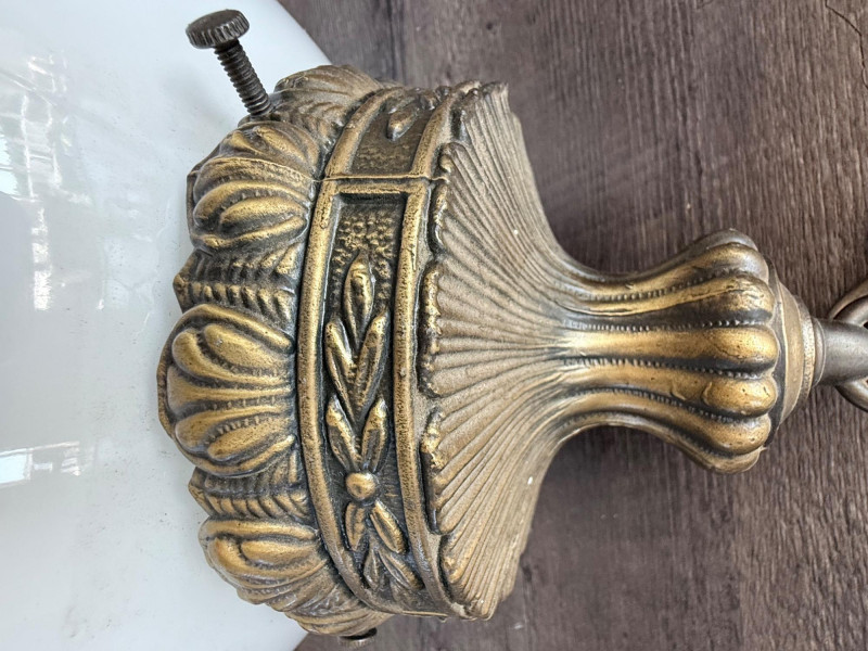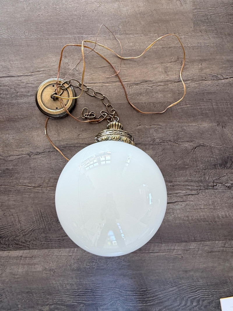 Brass Pendant Light with Opaline Glass Globe Hanging light fixture featuring a round opaline glass globe and a detailed brass-tone metal cap and canopy with raised floral and ribbed patterns. Hardwired type with a ceiling mount plate, hanging chain, and wiring. Marked with Underwriters Laboratories label. Measurements: Note: Electrical wiring has not been tested on this item.