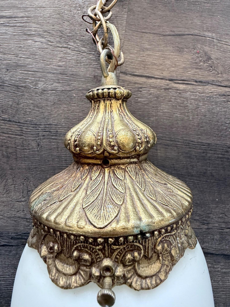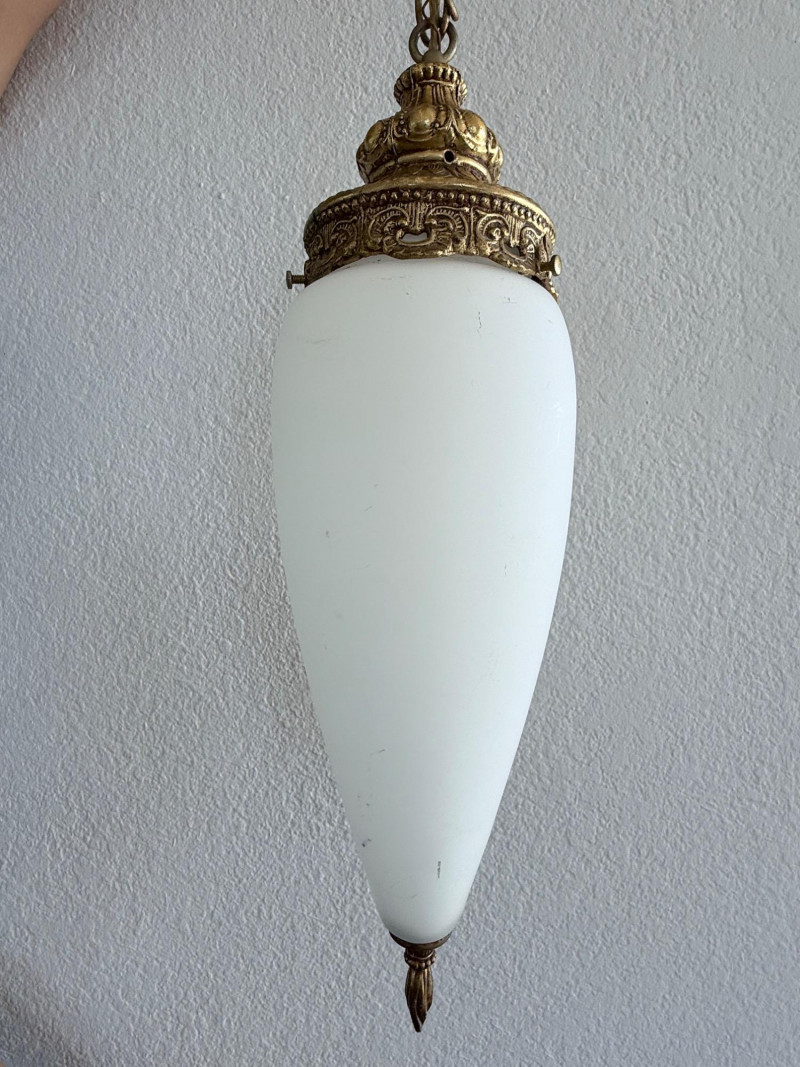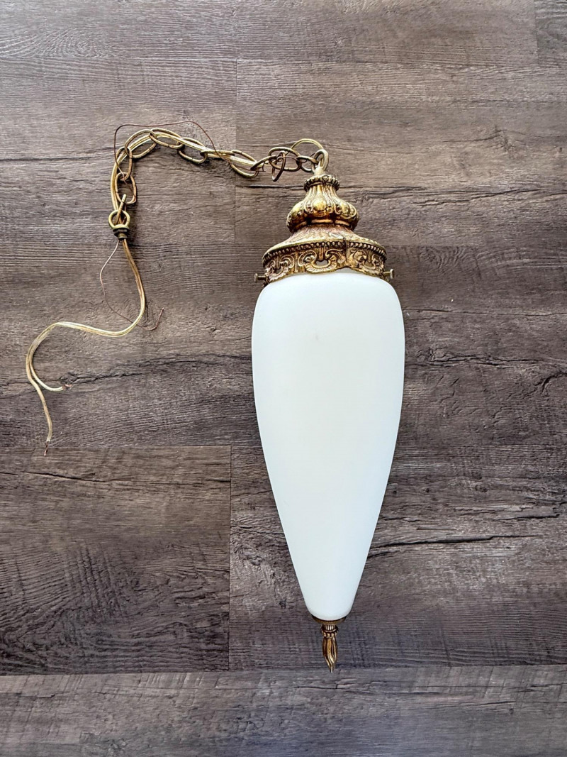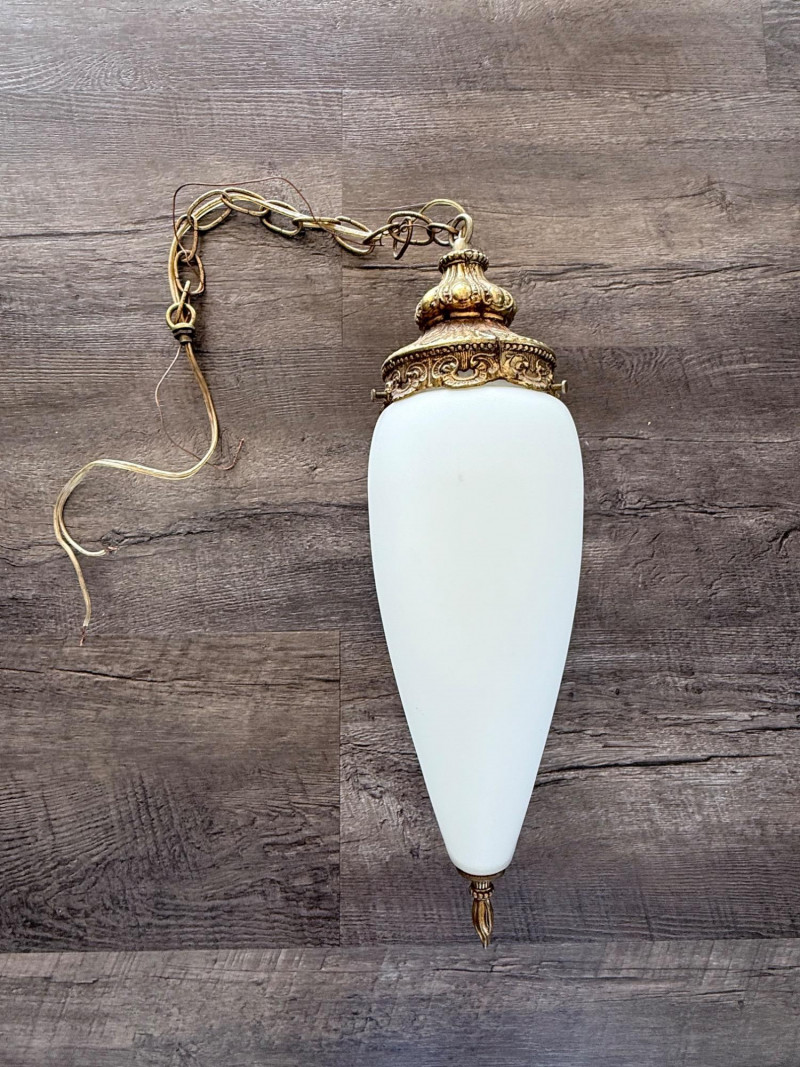 Elegant Vintage Teardrop Pendant Light with Ornate Brass Fittings – Hardwire Fixture A single hanging pendant light fixture with an elongated white glass shade tapering to a point. The fixture has ornate brass-toned metal fittings at the top and bottom. The top section includes a domed, embossed metal cover with scrollwork and floral patterns. The light is suspended by a metal chain and has exposed wiring. Measurements: Note: Electrical wiring has not been tested on this item.