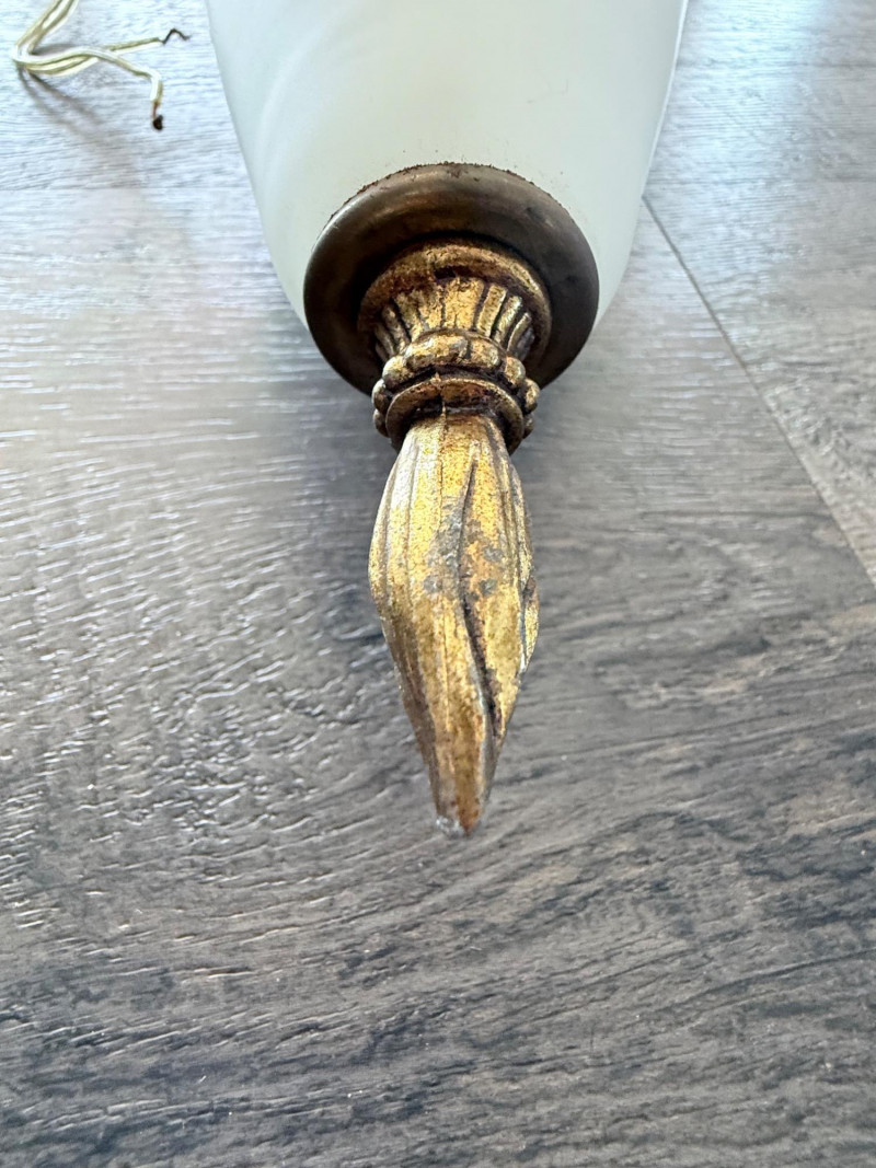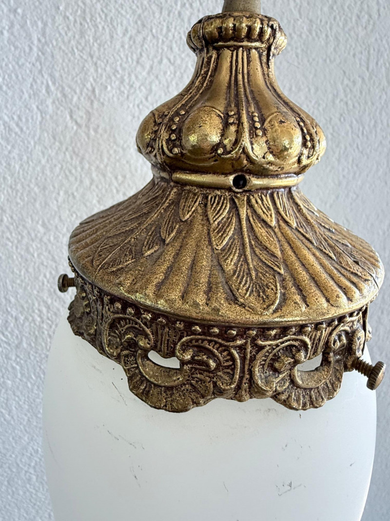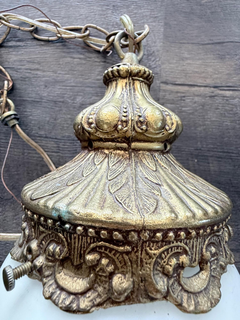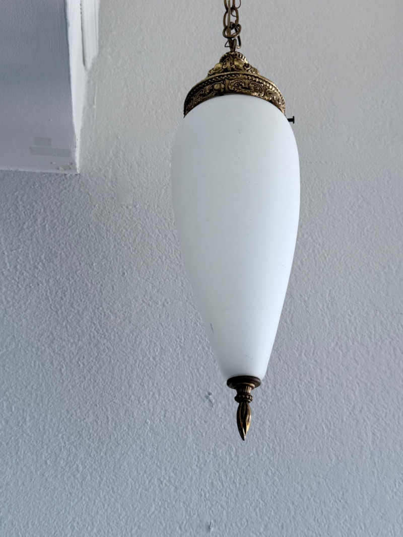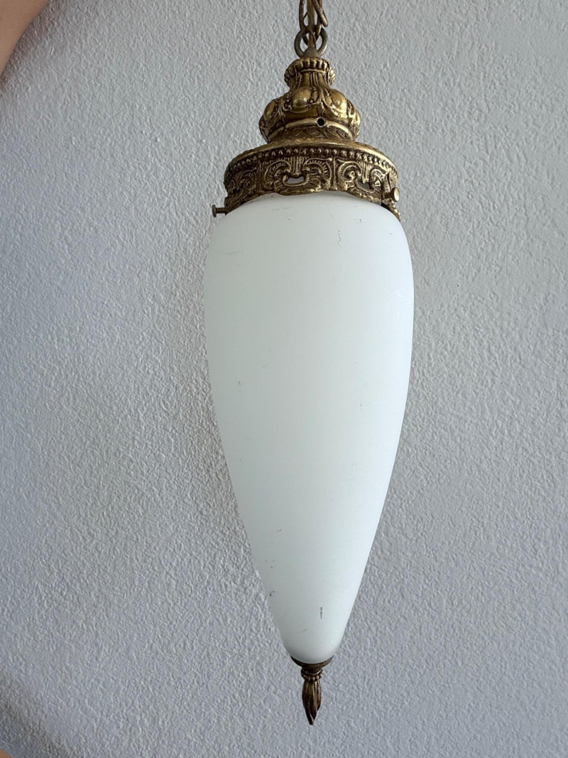 Elegant Vintage Teardrop Pendant Light with Ornate Brass Fittings – Hardwire Fixture A single hanging pendant light fixture with an elongated white glass shade tapering to a point. The fixture has ornate brass-toned metal fittings at the top and bottom. The top section includes a domed, embossed metal cover with scrollwork and floral patterns. The light is suspended by a metal chain and has exposed wiring. Measurements: Note: Electrical wiring has not been tested on this item.