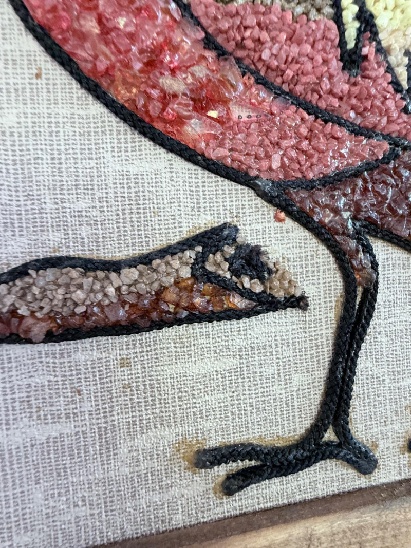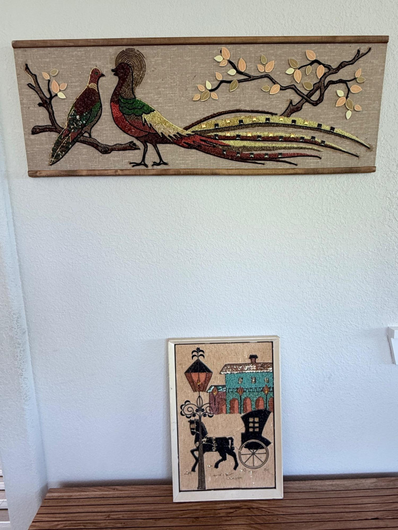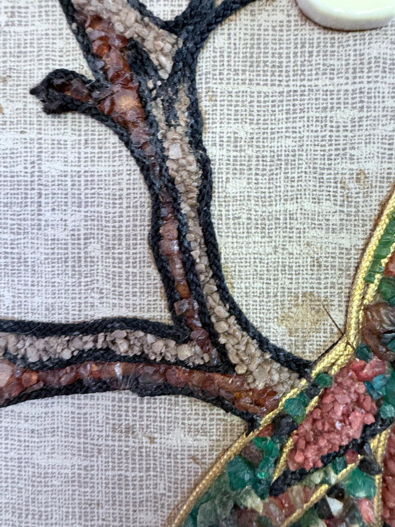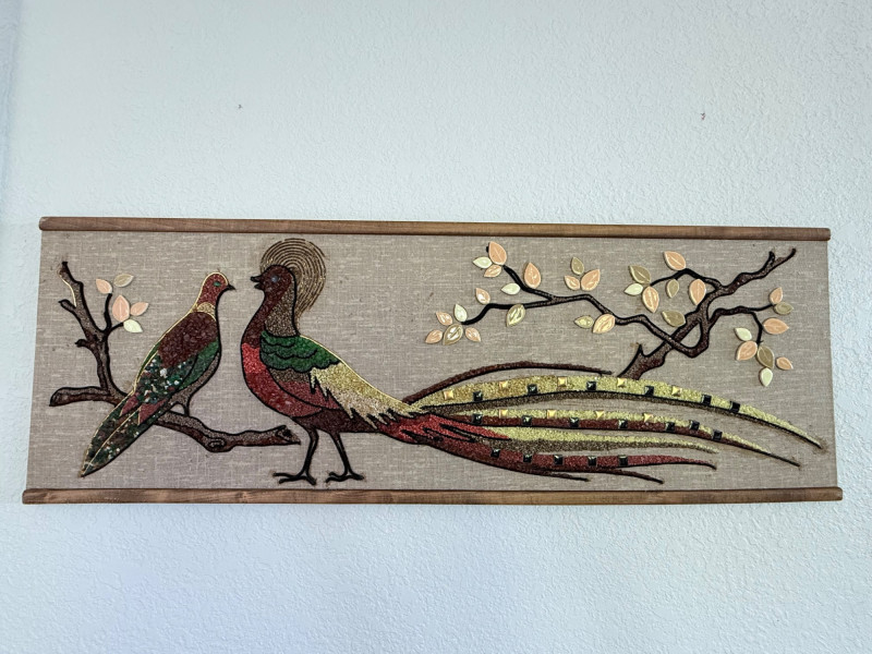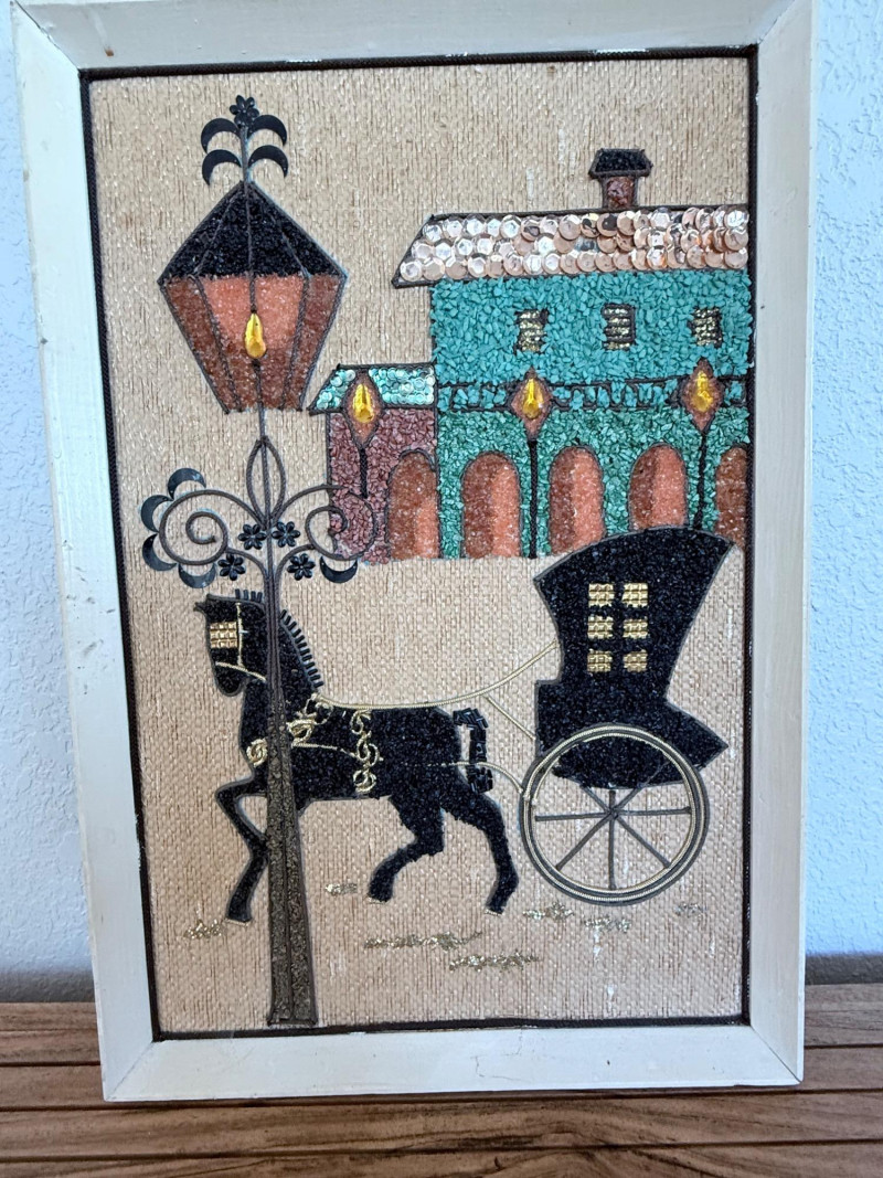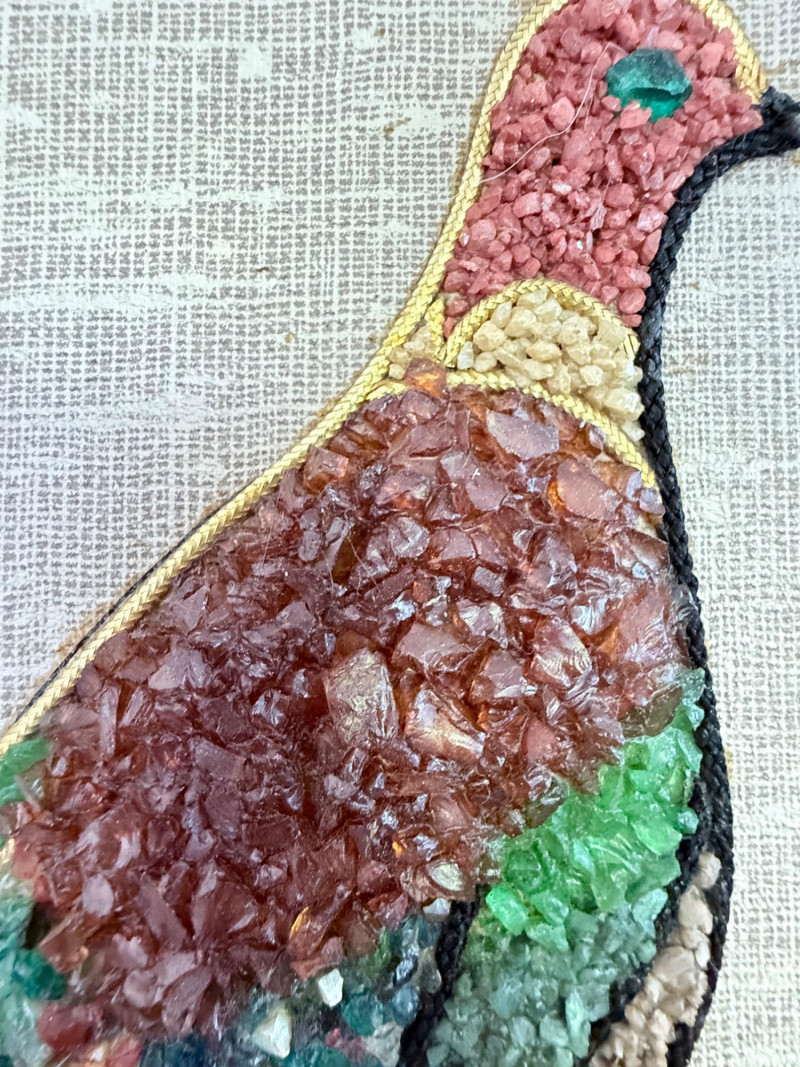 Colored Stone Mixed Media Art – Set of 2 Set of two framed mixed media artworks featuring colored stone, beads, and porcelain leaves on woven or textured fabric backing. The first piece (36" x 12.5") depicts a pair of pheasants perched on a branch. The second piece (18.5" x 12.5") shows a horse-drawn carriage in front of a building with a sequined rooftop. Both pieces use wood frames and materials such as resin, colored gravel, and molded decorative elements.