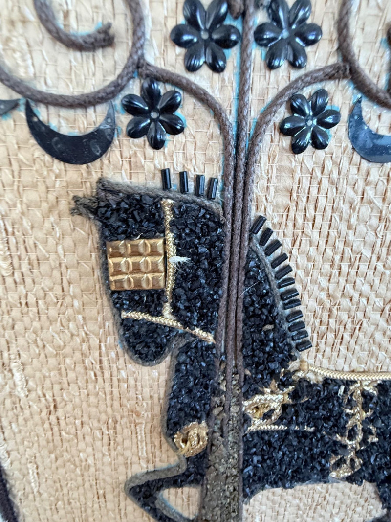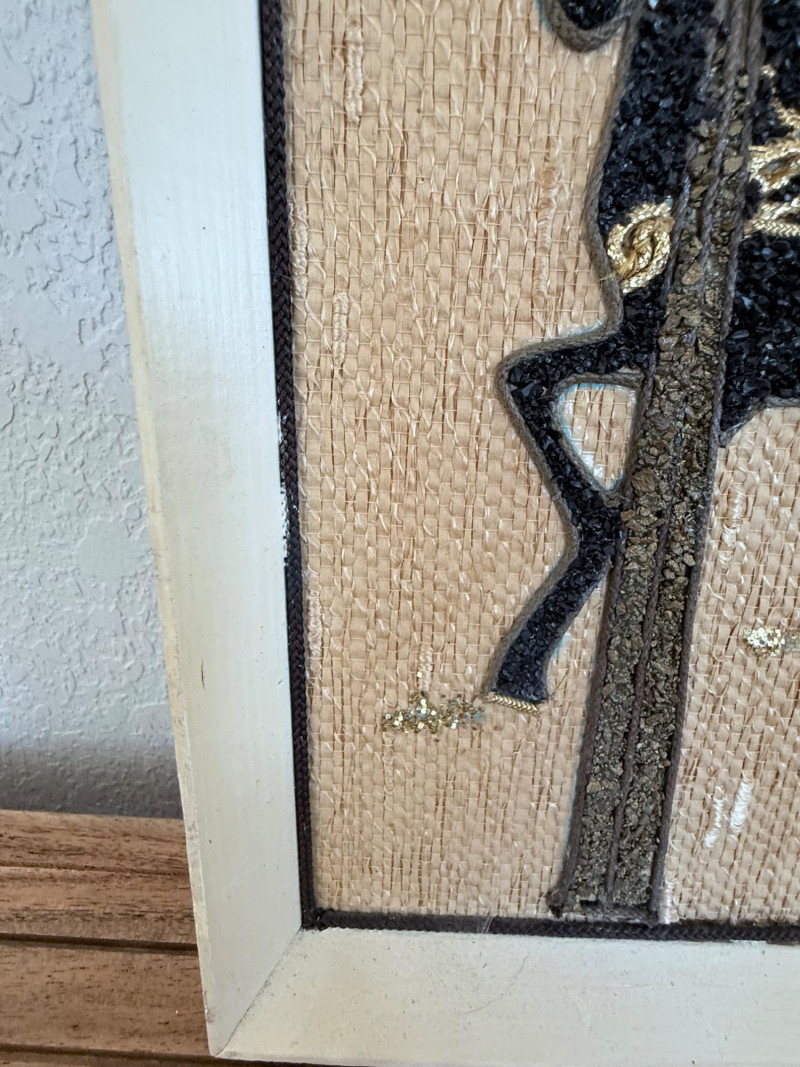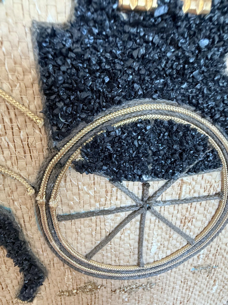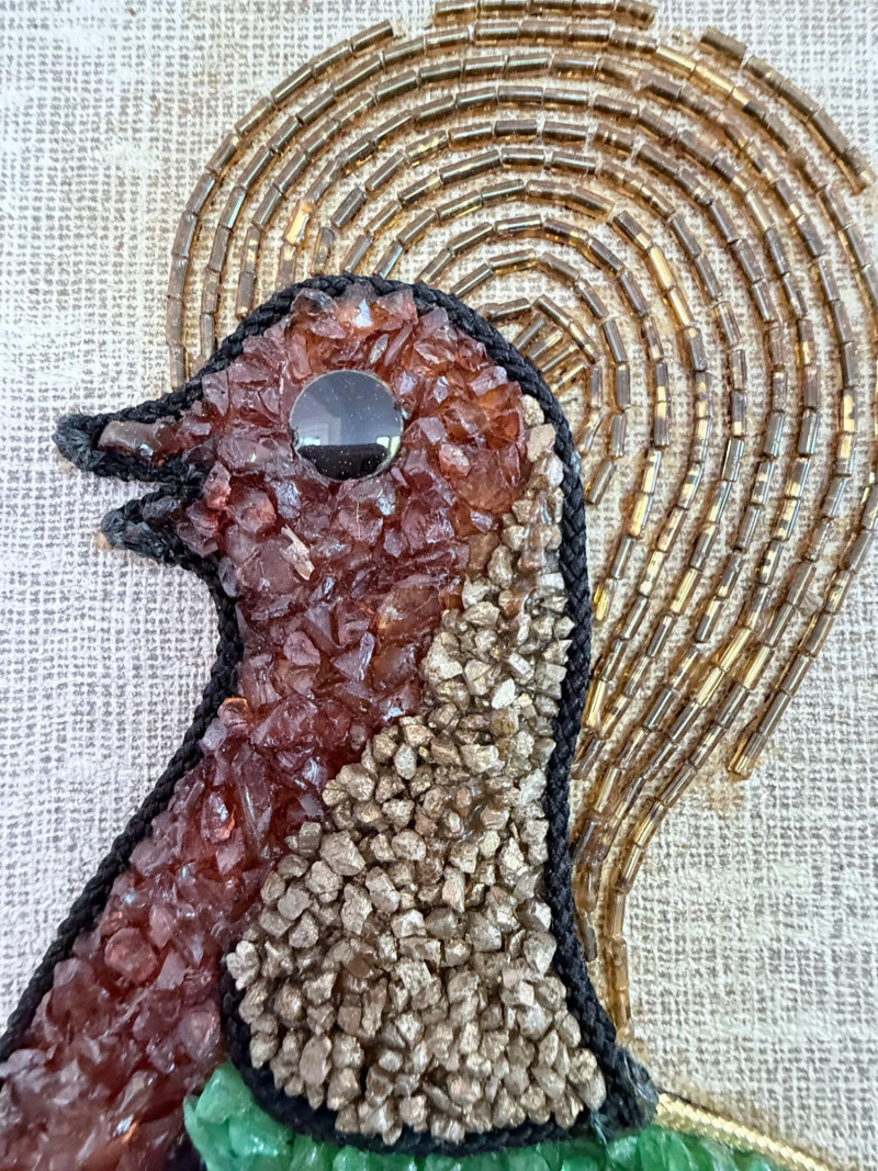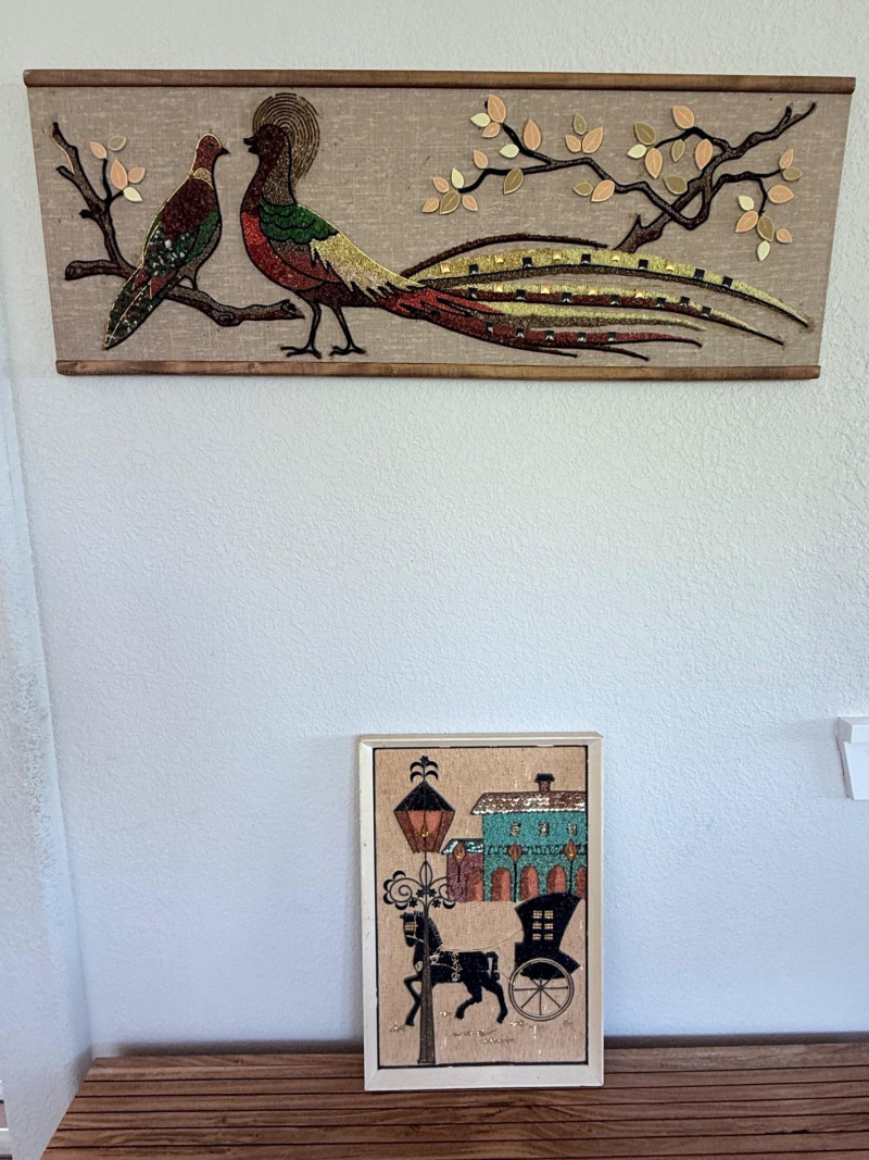 Colored Stone Mixed Media Art – Set of 2 Set of two framed mixed media artworks featuring colored stone, beads, and porcelain leaves on woven or textured fabric backing. The first piece (36" x 12.5") depicts a pair of pheasants perched on a branch. The second piece (18.5" x 12.5") shows a horse-drawn carriage in front of a building with a sequined rooftop. Both pieces use wood frames and materials such as resin, colored gravel, and molded decorative elements.
