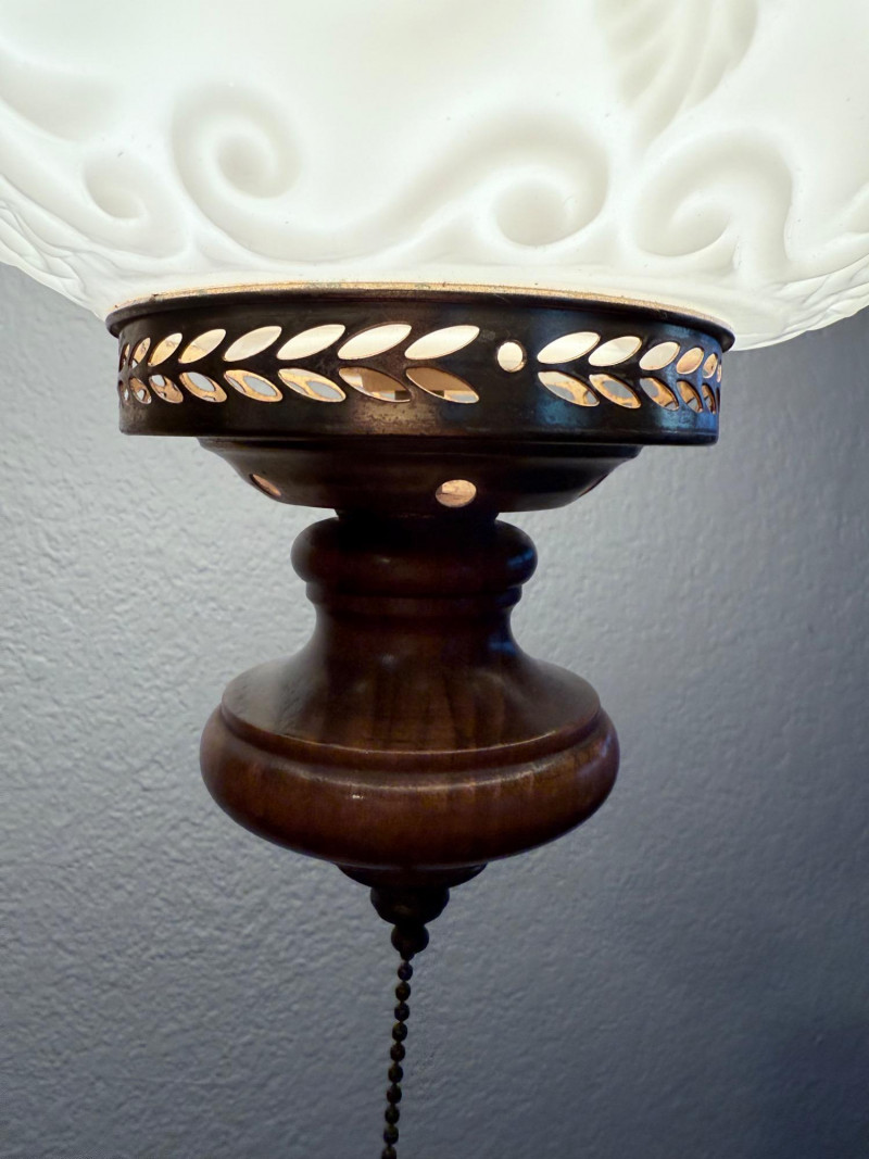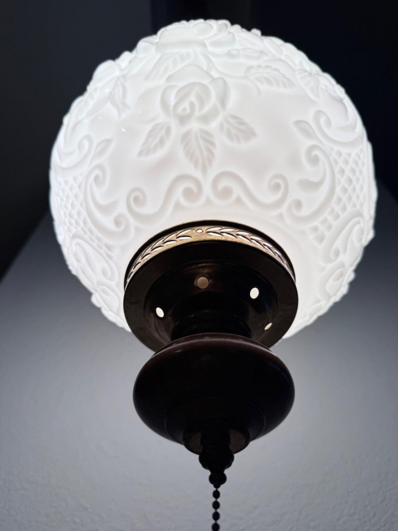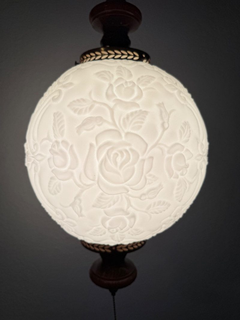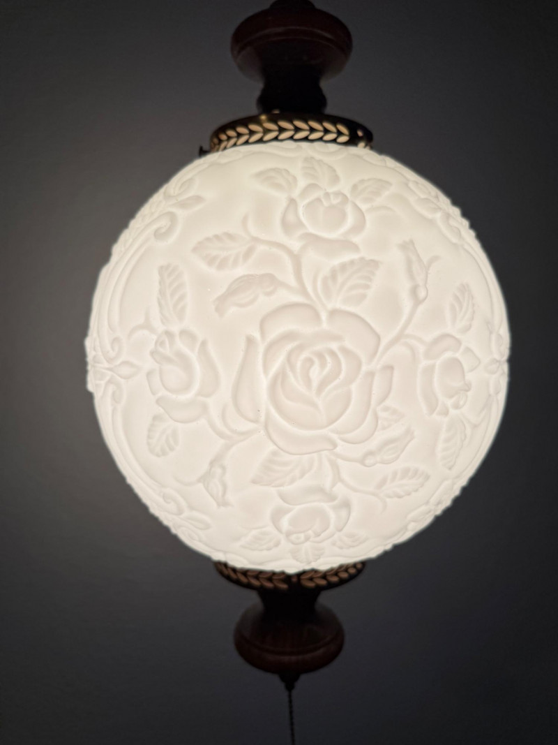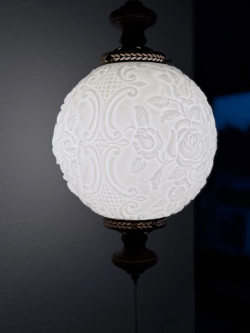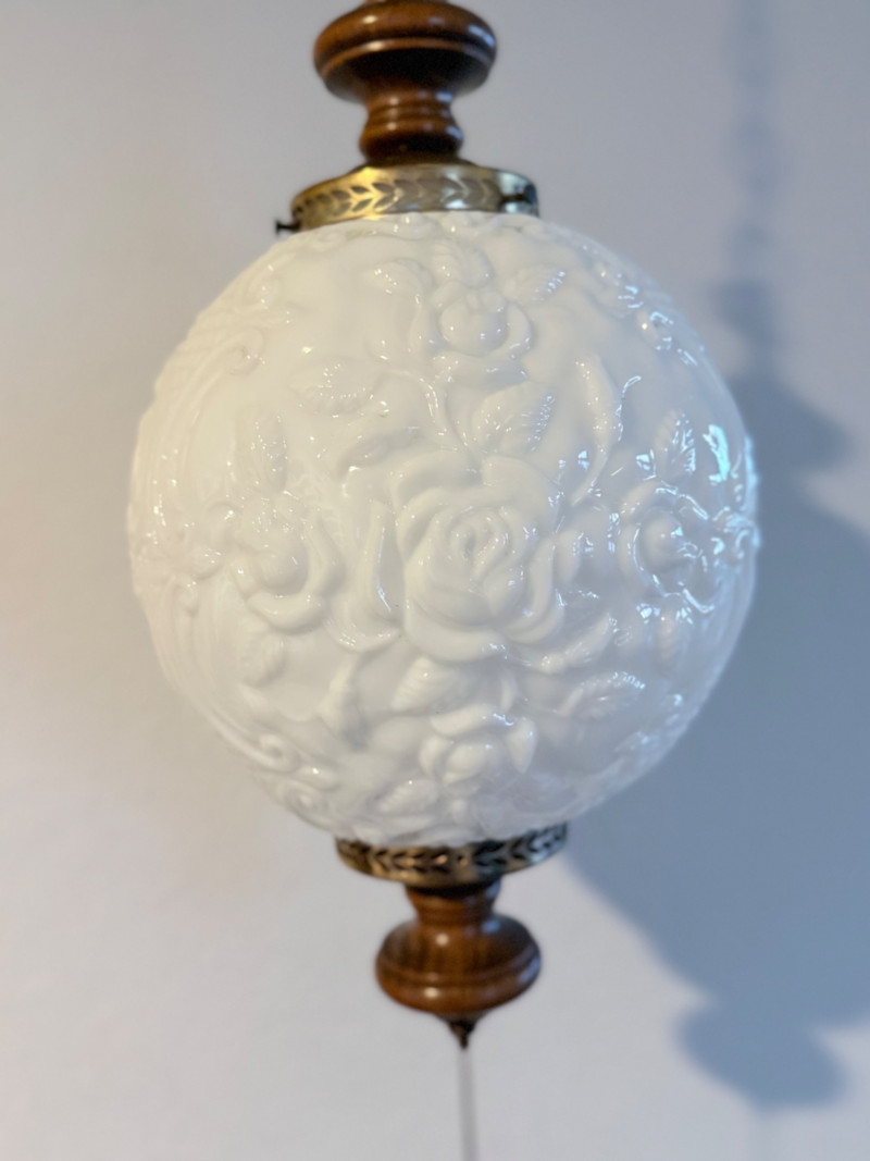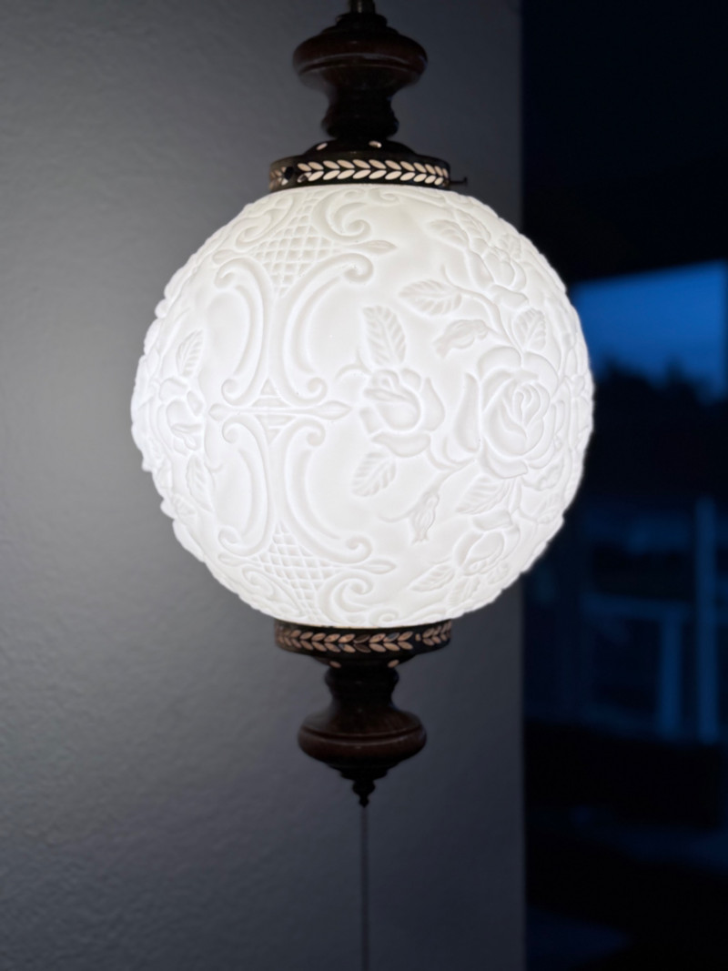 Soft Matte Floral Glass Hanging Lamp Plug In White glass hanging lamp with embossed floral and leaf patterns across the surface. The globe is suspended vertically and held between metal and wood fittings. The top and bottom caps have pierced metal bands with a leaf motif and a pull-chain switch hangs from the bottom. Plug-in style with an extra-long cord and chain for hanging. Measurements:
