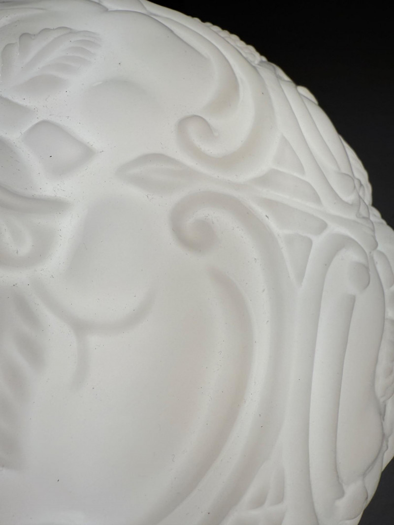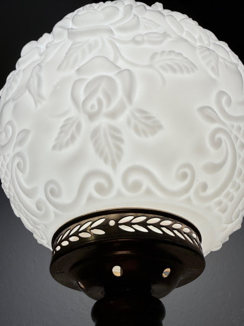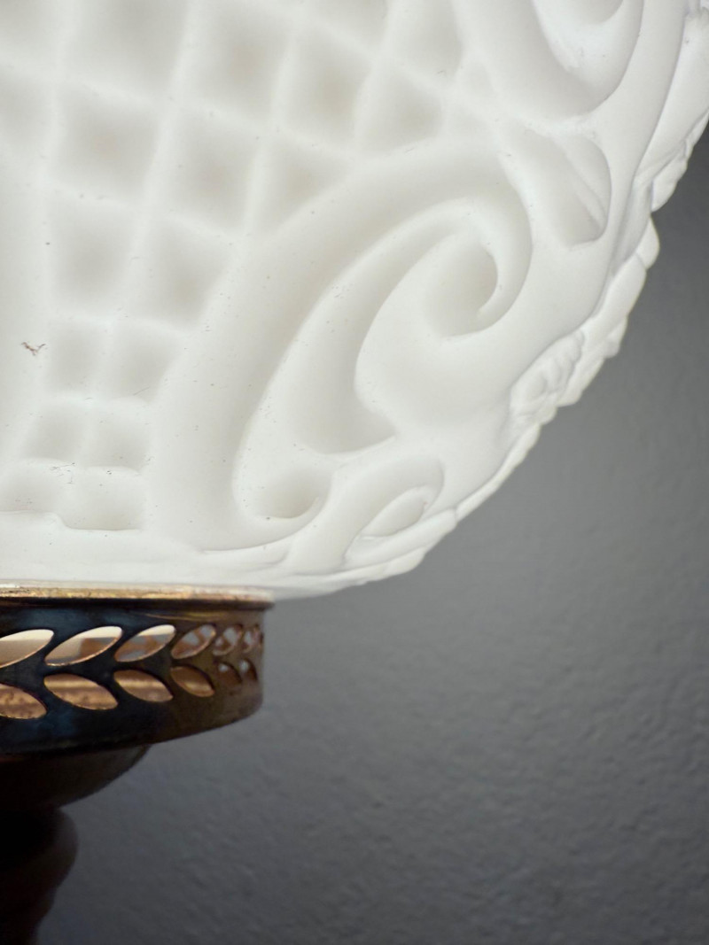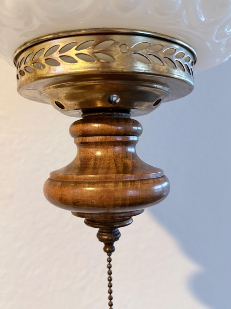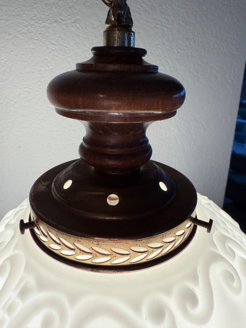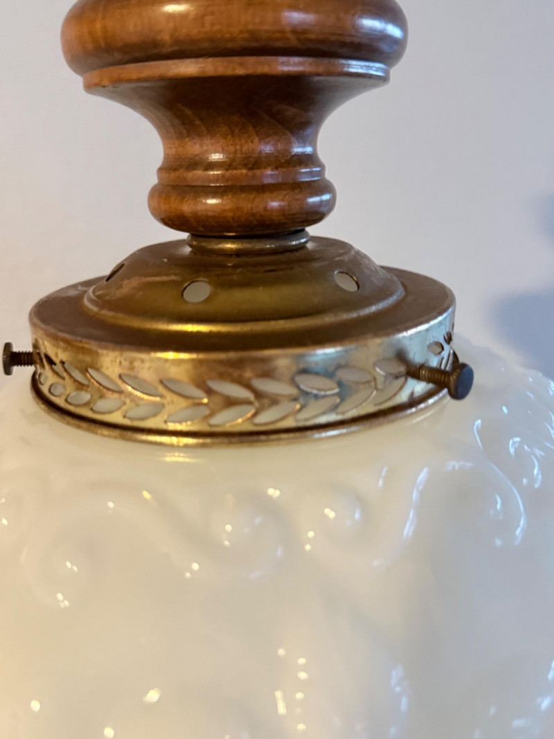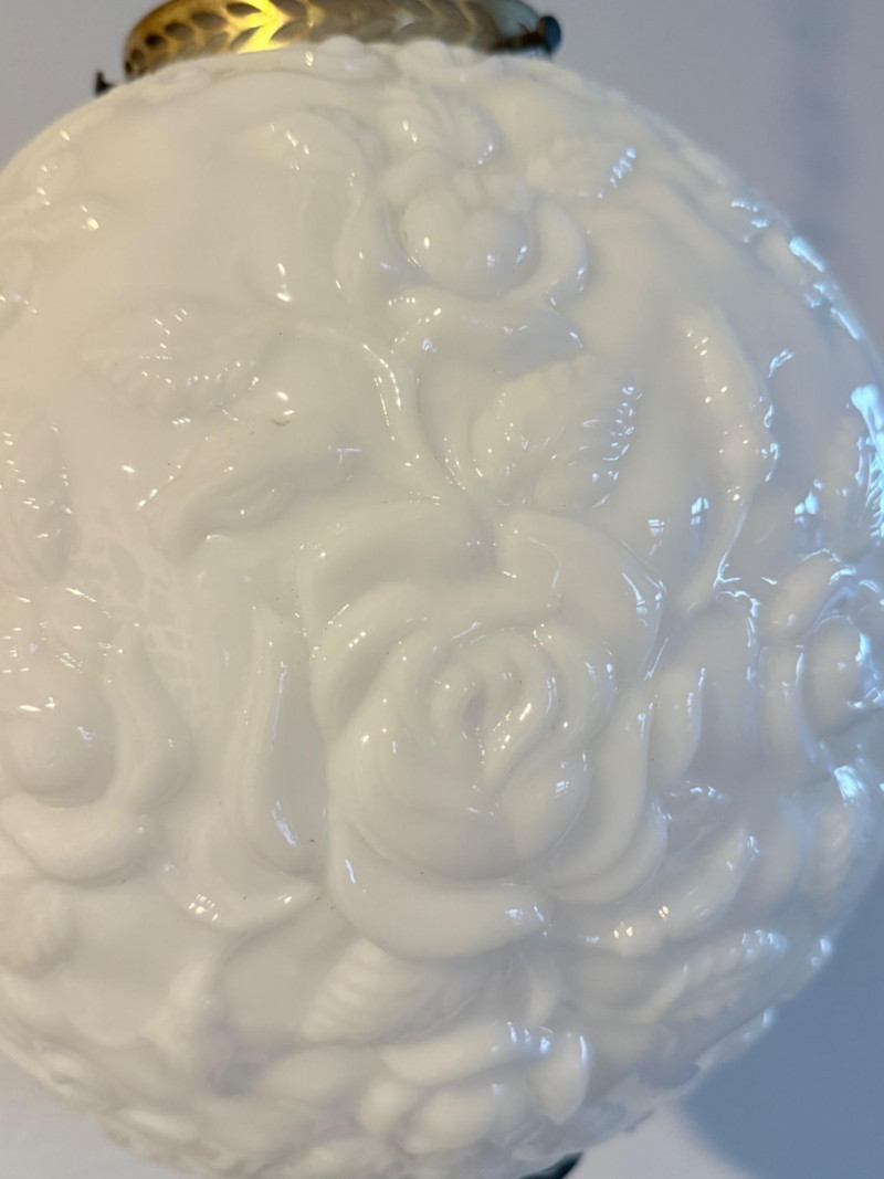 Soft Matte Floral Glass Hanging Lamp Plug In White glass hanging lamp with embossed floral and leaf patterns across the surface. The globe is suspended vertically and held between metal and wood fittings. The top and bottom caps have pierced metal bands with a leaf motif and a pull-chain switch hangs from the bottom. Plug-in style with an extra-long cord and chain for hanging. Measurements: