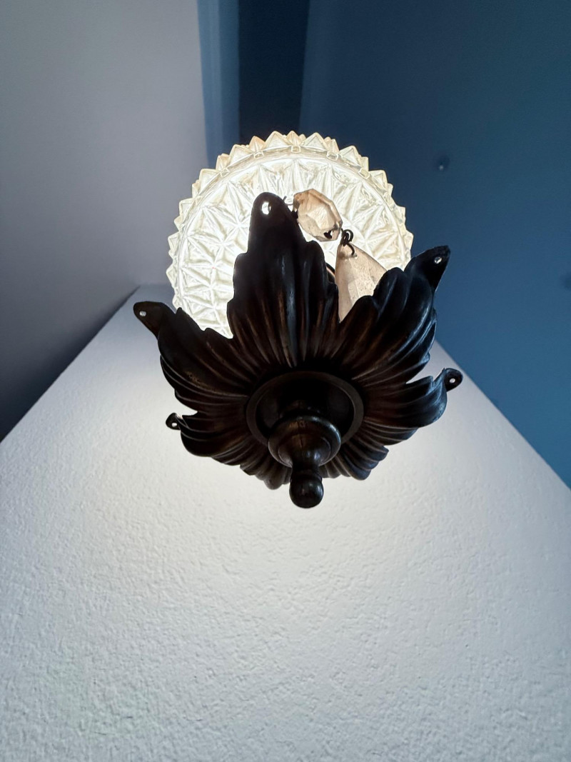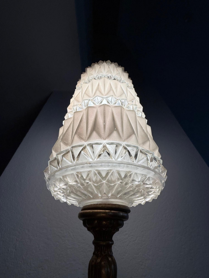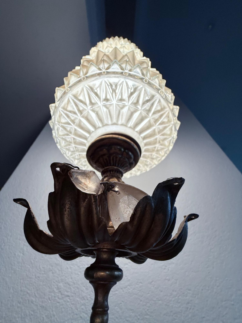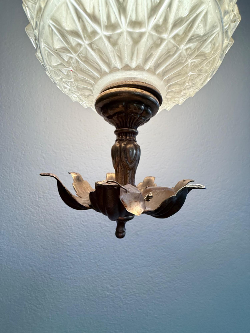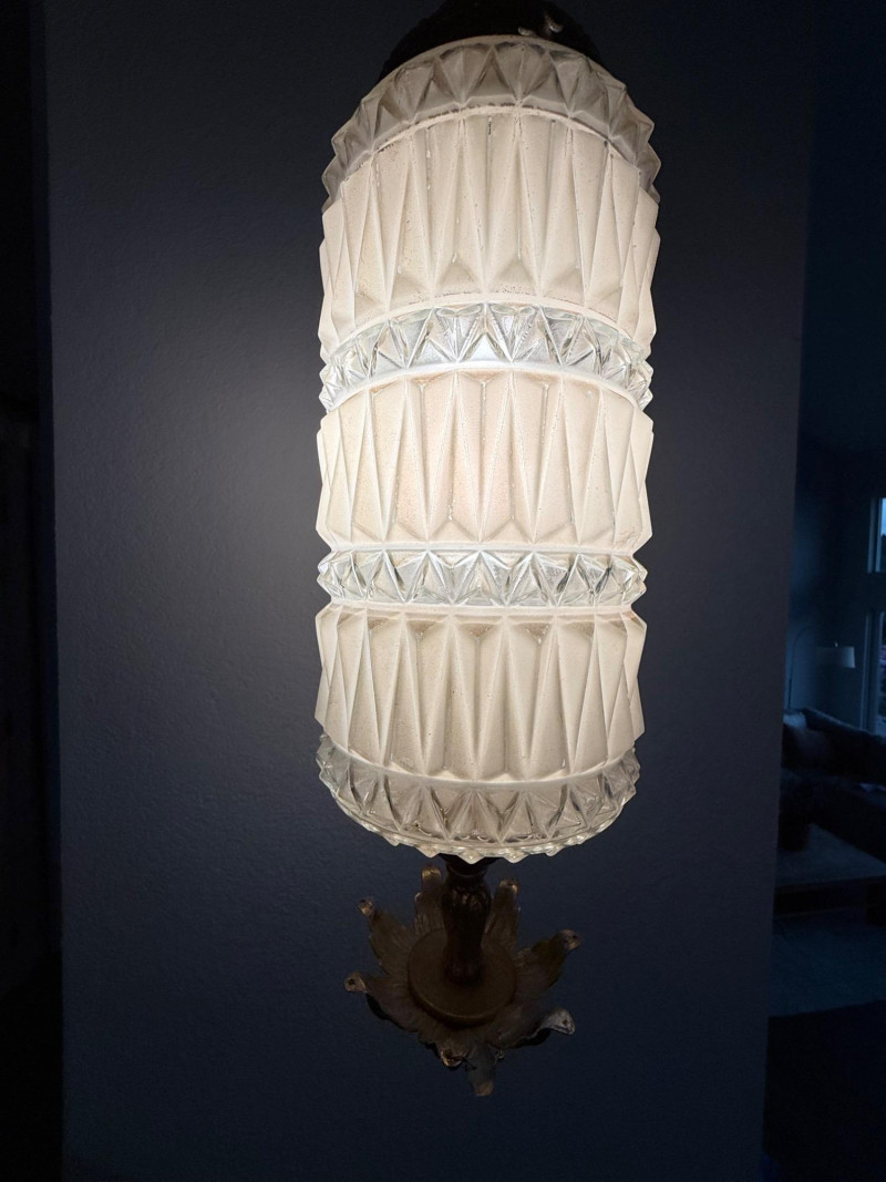 Plug-In Hanging Lamp with Frosted Glass Shade Plug-in hanging lamp with a textured, elongated frosted glass shade featuring a geometric diamond pattern. The metal base has a dark patina finish and includes ornate floral and leaf motifs. The glass shade is secured by a decorative metal holder with petal-like extensions. Measurements: