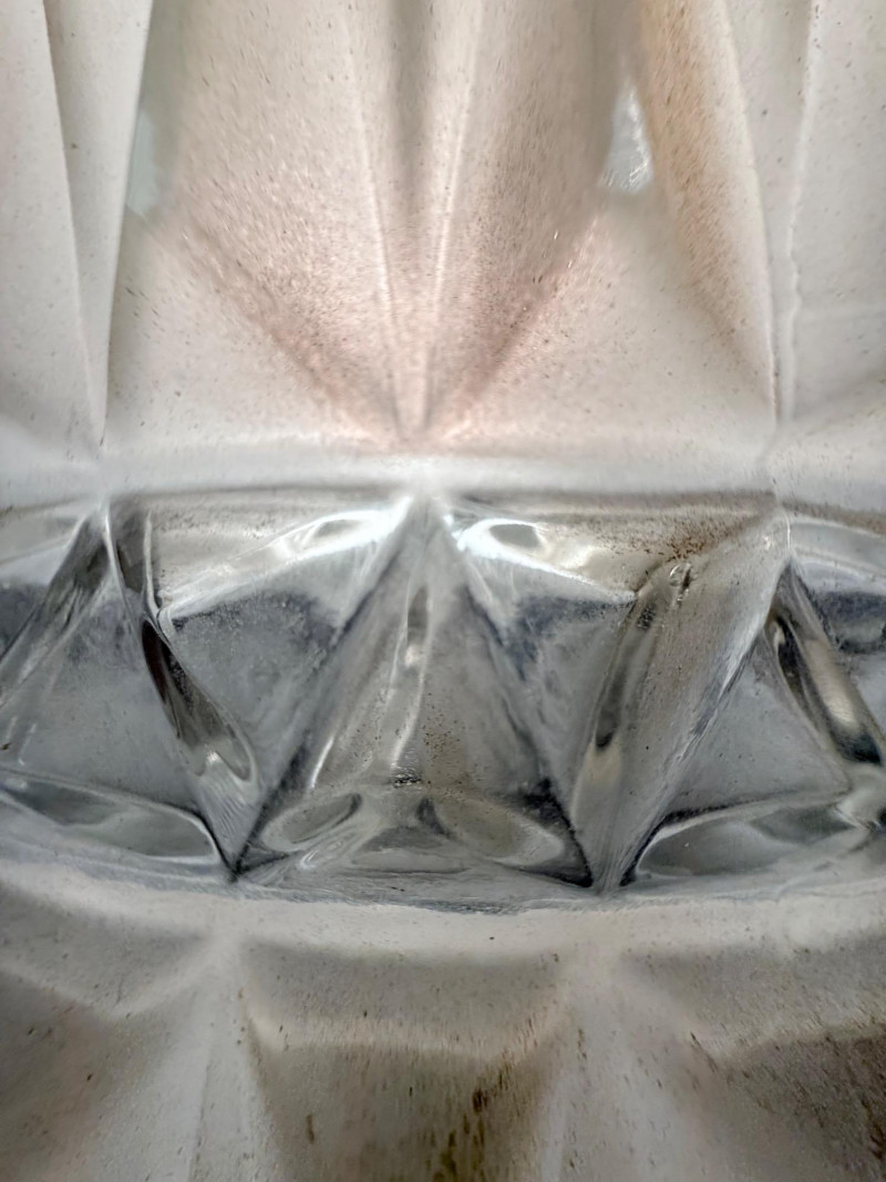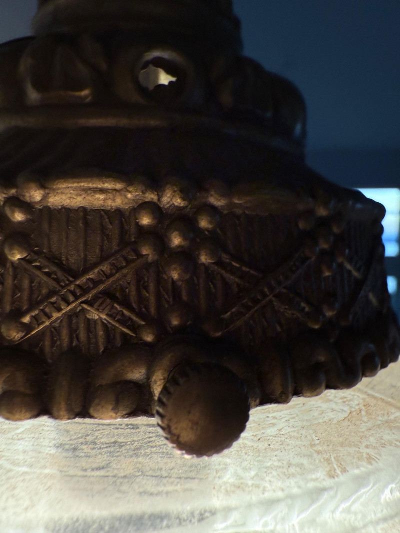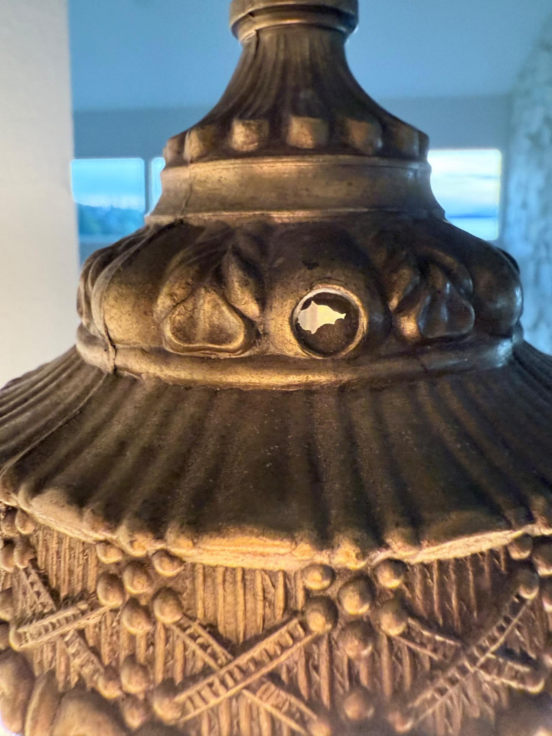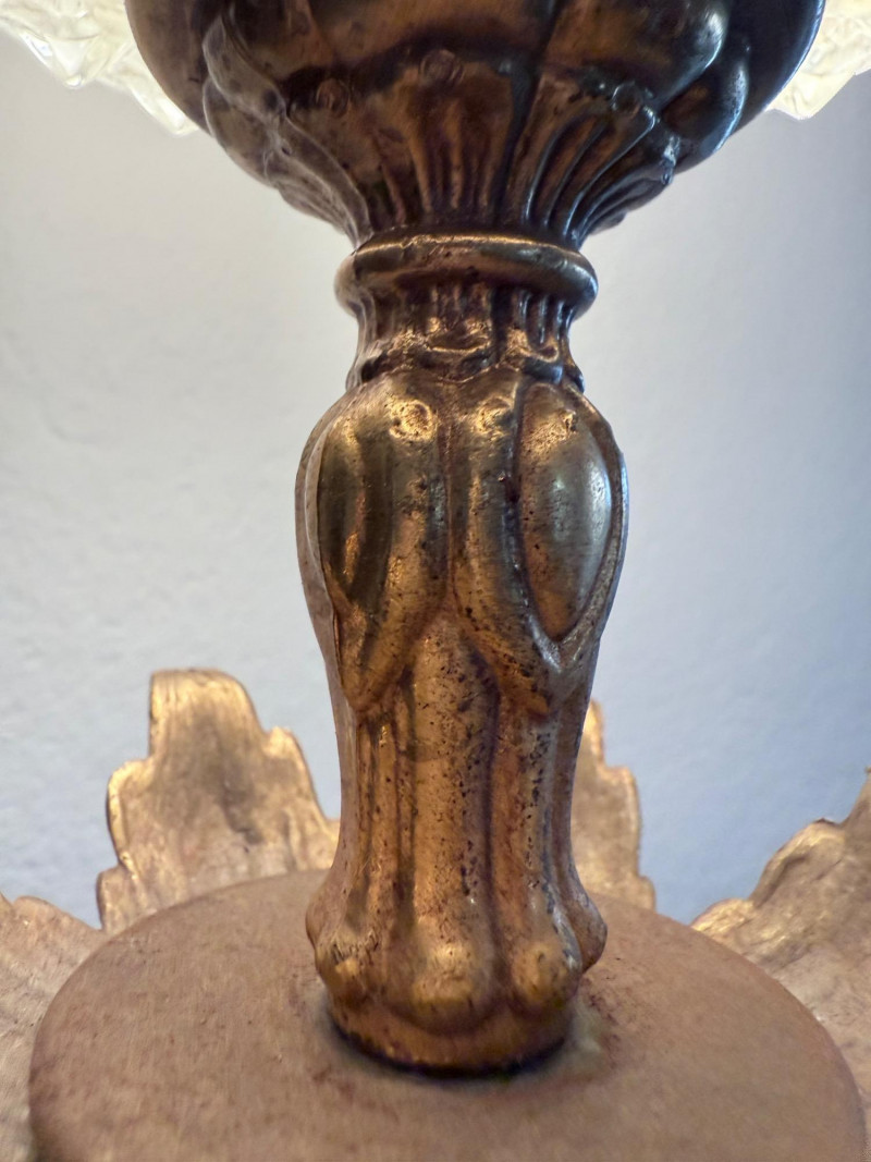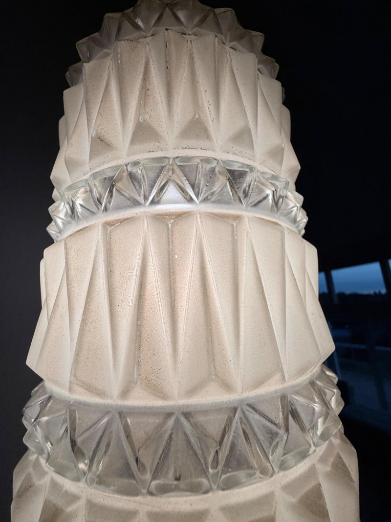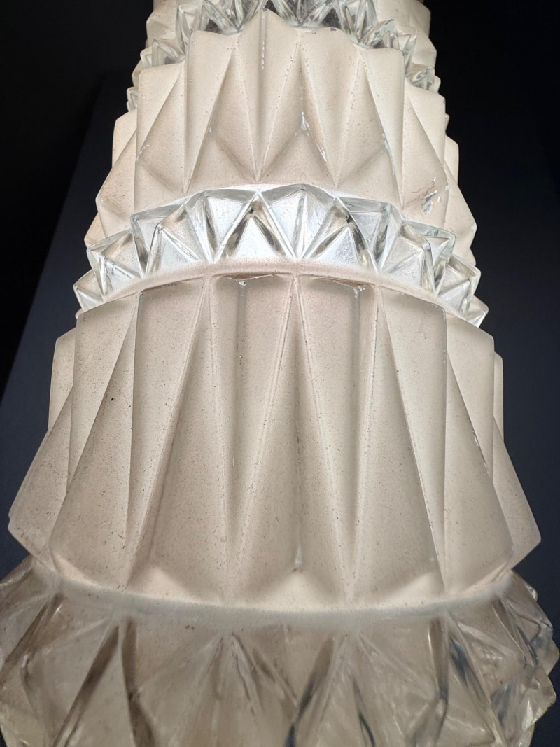 Plug-In Hanging Lamp with Frosted Glass Shade Plug-in hanging lamp with a textured, elongated frosted glass shade featuring a geometric diamond pattern. The metal base has a dark patina finish and includes ornate floral and leaf motifs. The glass shade is secured by a decorative metal holder with petal-like extensions. Measurements: