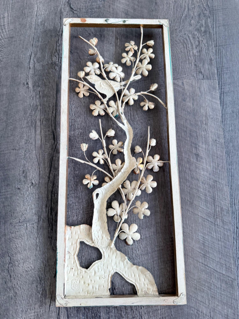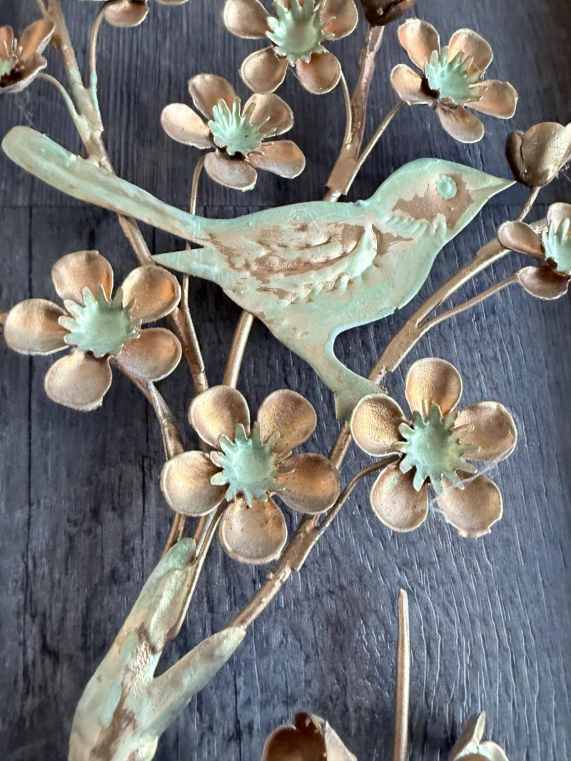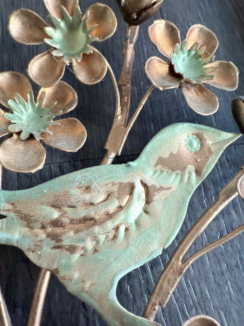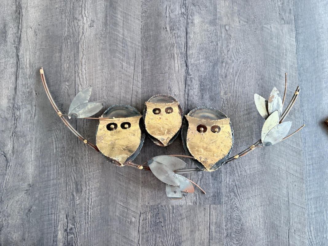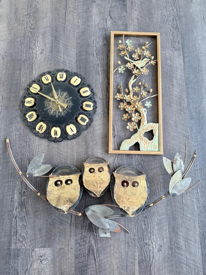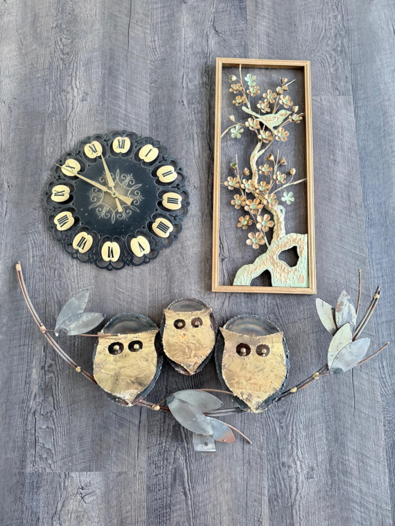 Vintage Metal Wall Art Collection – Owls, Clock & Floral Bird Panel (3 Pieces) Bring a touch of vintage charm and artistic texture to your space with this 3-piece metal wall art collection, each item offering unique handcrafted detail and mid-century appeal. This mixed lot includes a sculptural owl trio, a decorative Roman numeral wall clock, and a floral bird relief panel. Included in this lot: Three Owls on Branch Wall Art Size: 27" x 13" Features layered metal textures with gold-toned and patinated finishes Stylized design with hand-formed leaves and whimsical expressions Metal Roman Numeral Wall Clock (Not Tested) Size: 11" diameter Decorative black filigree-style backing with raised gold Roman numerals Please note: Clock is untested and may require a new mechanism or battery Floral Bird Panel Art Size: 8" x 20" Features a delicately sculpted bird perched among blossoms Aged green and bronze tones with beautiful patina throughout This collection is a wonderful example of vintage metalwork with a nature-inspired theme.