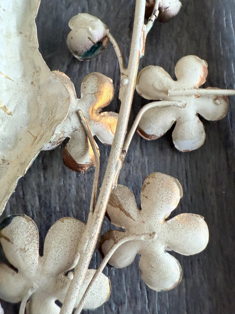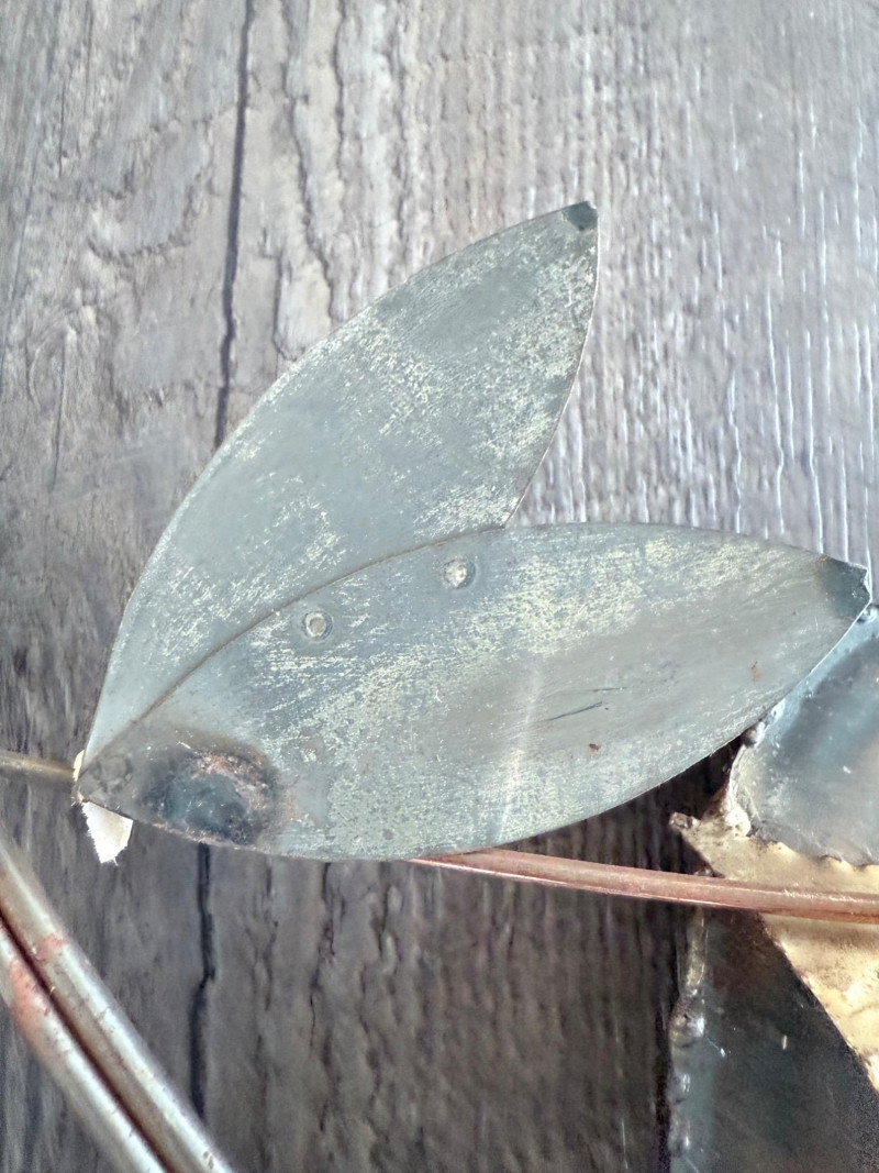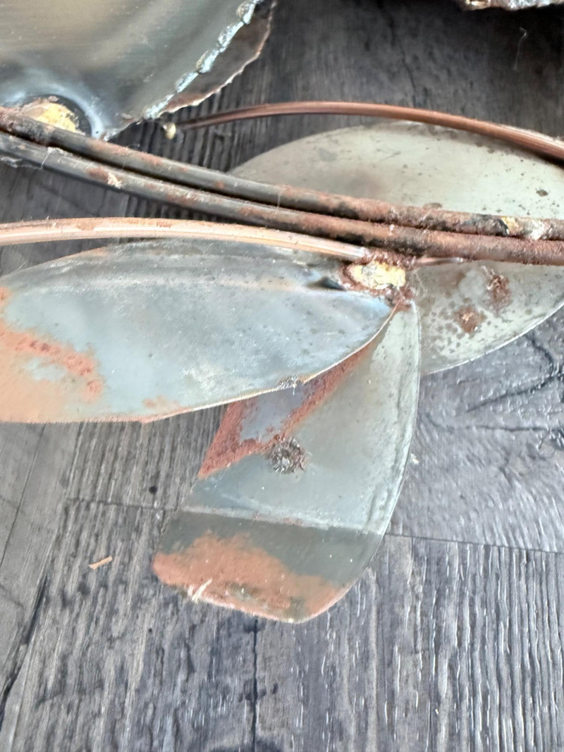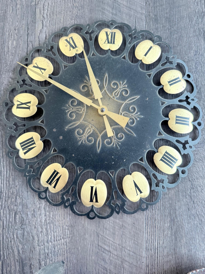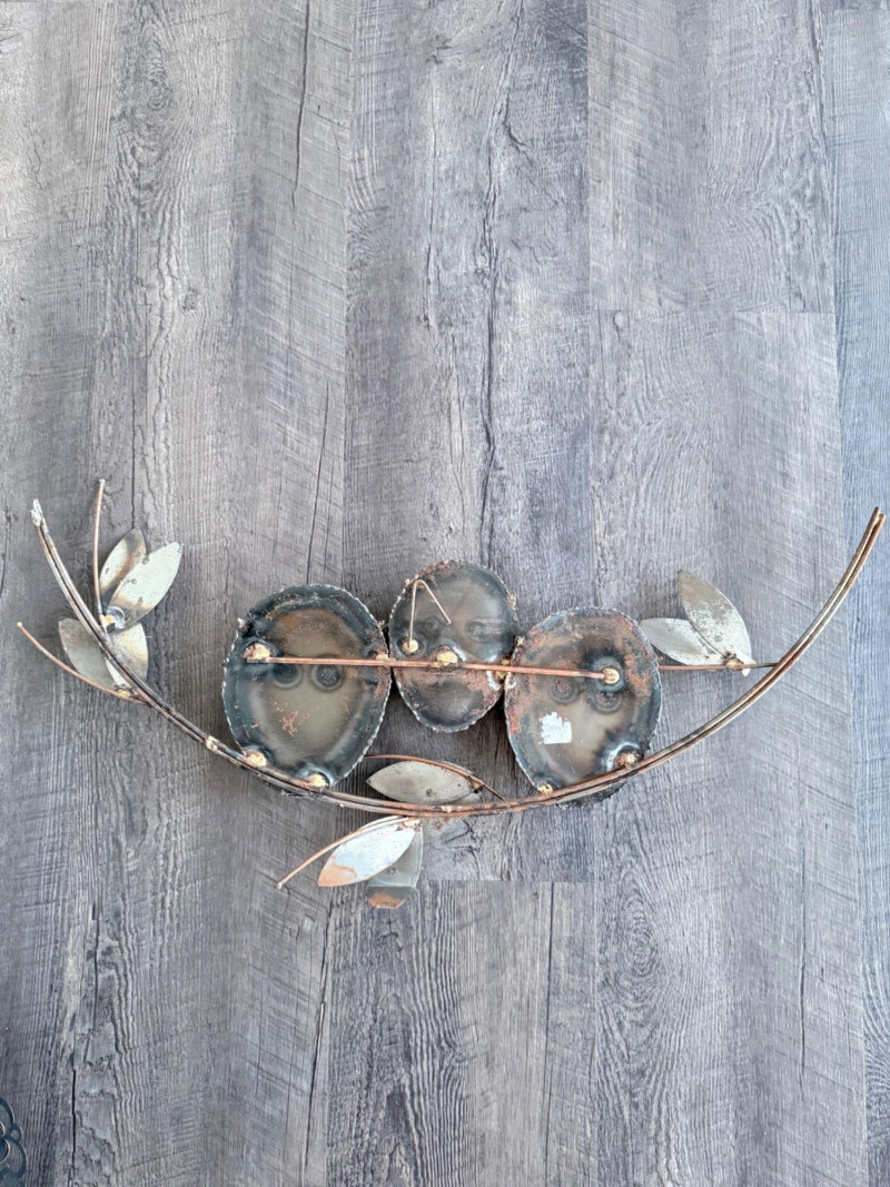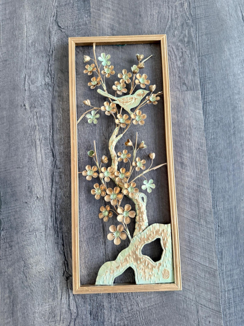 Vintage Metal Wall Art Collection – Owls, Clock & Floral Bird Panel (3 Pieces) Bring a touch of vintage charm and artistic texture to your space with this 3-piece metal wall art collection, each item offering unique handcrafted detail and mid-century appeal. This mixed lot includes a sculptural owl trio, a decorative Roman numeral wall clock, and a floral bird relief panel. Included in this lot: Three Owls on Branch Wall Art Size: 27" x 13" Features layered metal textures with gold-toned and patinated finishes Stylized design with hand-formed leaves and whimsical expressions Metal Roman Numeral Wall Clock (Not Tested) Size: 11" diameter Decorative black filigree-style backing with raised gold Roman numerals Please note: Clock is untested and may require a new mechanism or battery Floral Bird Panel Art Size: 8" x 20" Features a delicately sculpted bird perched among blossoms Aged green and bronze tones with beautiful patina throughout This collection is a wonderful example of vintage metalwork with a nature-inspired theme.