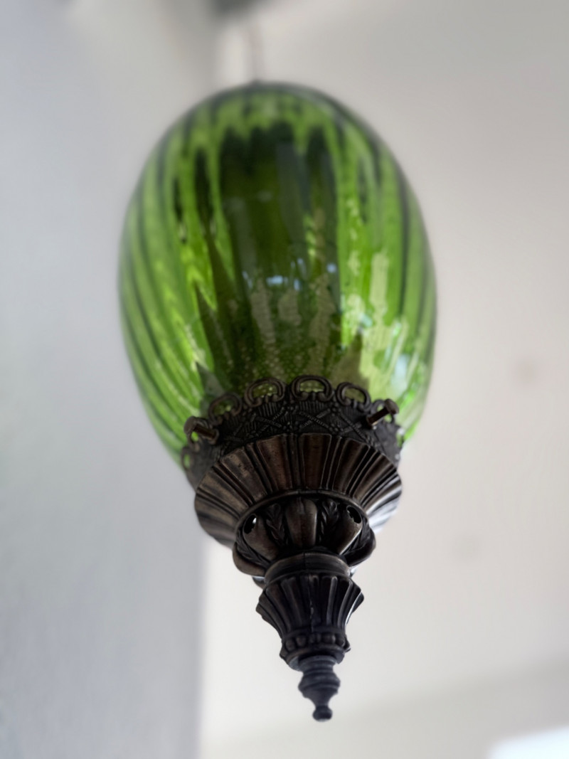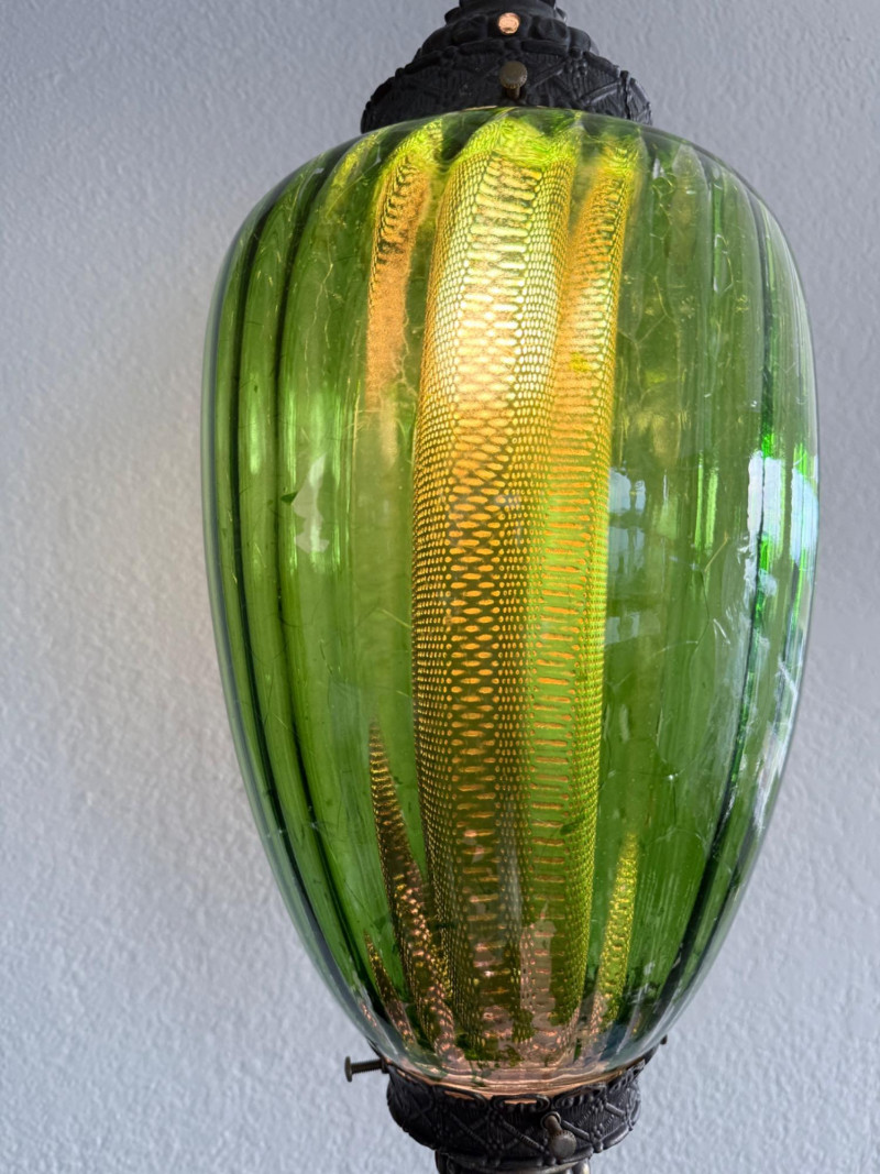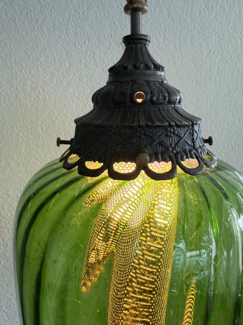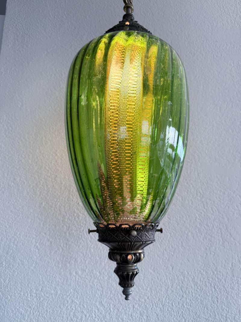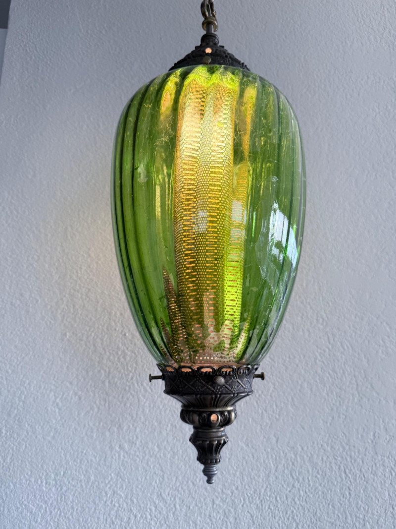 Vintage Green Ribbed Glass Hanging Pendant Lamp – Plug-In with Ornate Metal Crown – Rare Find This stunning vintage hanging plug-in pendant lamp features a vibrant ribbed green glass globe paired with an ornate, dark patina metal crown and finial. A true mid-century treasure, this piece casts a warm, atmospheric glow and brings bold retro character to any space. Details: Ribbed green blown glass shade with excellent clarity and tone Highly detailed metal crown with floral and looped cutout design Plug-in style – no hardwiring required Works beautifully as a statement light in entryways, reading nooks, or boho interiors Decorative interior diffuser adds extra texture and glow Rarity & Appeal: