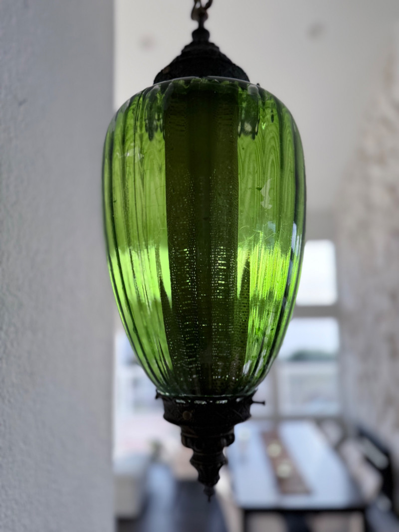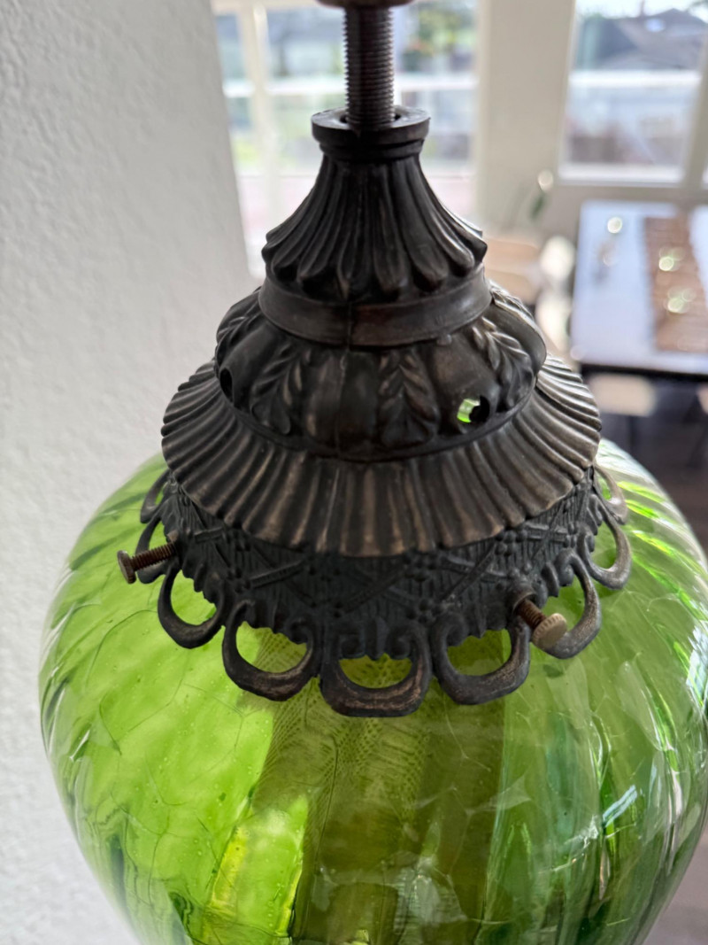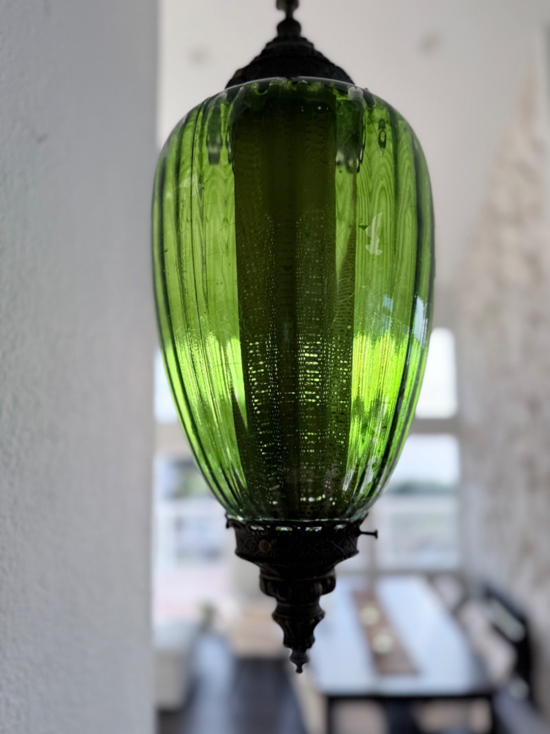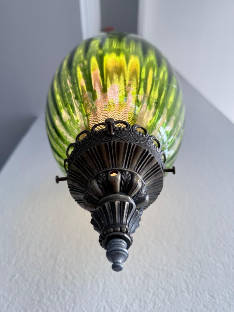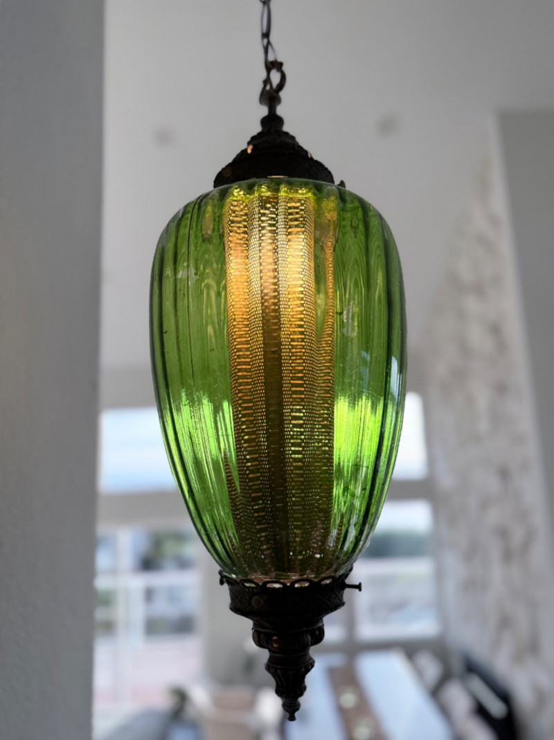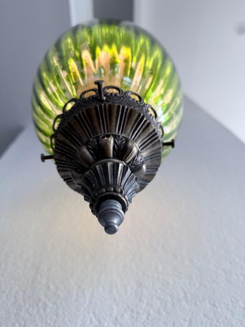 Vintage Green Ribbed Glass Hanging Pendant Lamp – Plug-In with Ornate Metal Crown – Rare Find This stunning vintage hanging plug-in pendant lamp features a vibrant ribbed green glass globe paired with an ornate, dark patina metal crown and finial. A true mid-century treasure, this piece casts a warm, atmospheric glow and brings bold retro character to any space. Details: Ribbed green blown glass shade with excellent clarity and tone Highly detailed metal crown with floral and looped cutout design Plug-in style – no hardwiring required Works beautifully as a statement light in entryways, reading nooks, or boho interiors Decorative interior diffuser adds extra texture and glow Rarity & Appeal: