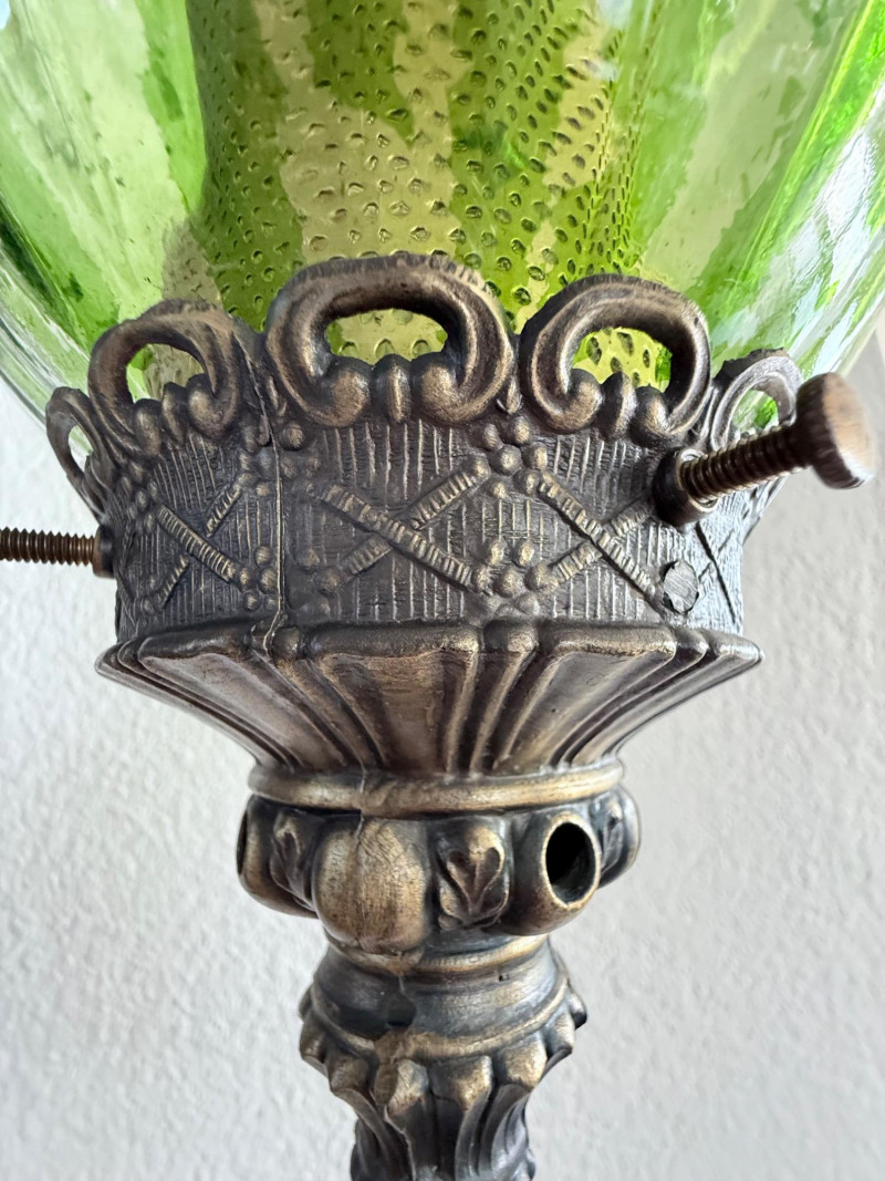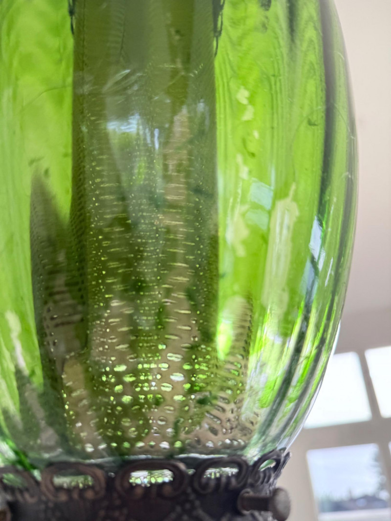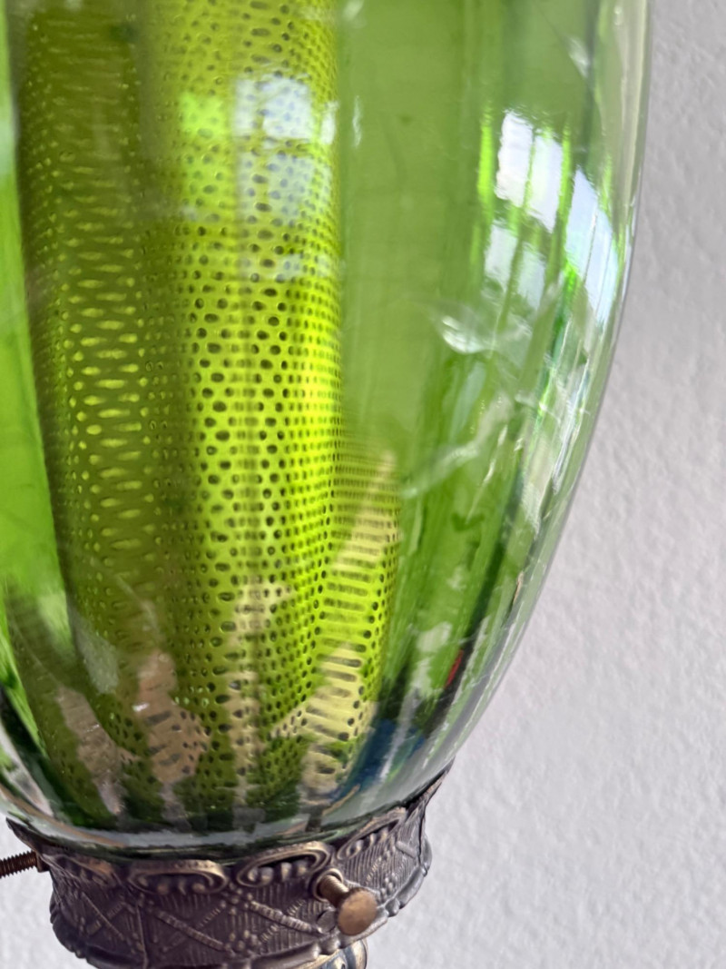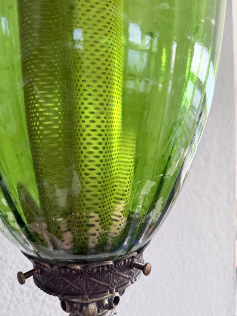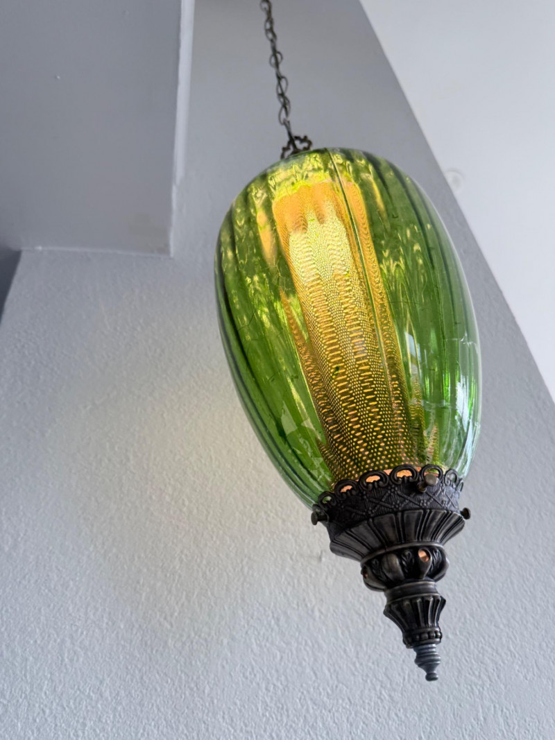 Vintage Green Ribbed Glass Hanging Pendant Lamp – Plug-In with Ornate Metal Crown – Rare Find This stunning vintage hanging plug-in pendant lamp features a vibrant ribbed green glass globe paired with an ornate, dark patina metal crown and finial. A true mid-century treasure, this piece casts a warm, atmospheric glow and brings bold retro character to any space. Details: Ribbed green blown glass shade with excellent clarity and tone Highly detailed metal crown with floral and looped cutout design Plug-in style – no hardwiring required Works beautifully as a statement light in entryways, reading nooks, or boho interiors Decorative interior diffuser adds extra texture and glow Rarity & Appeal: