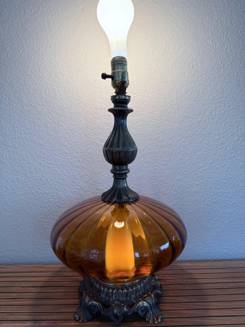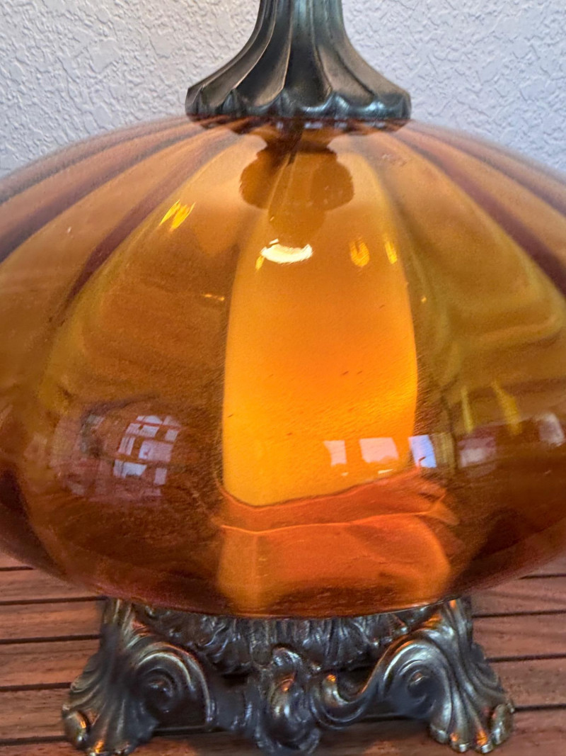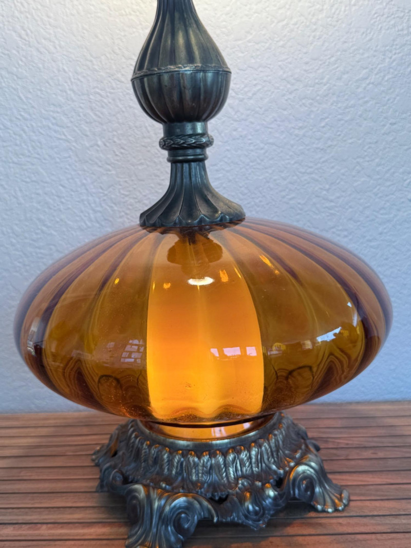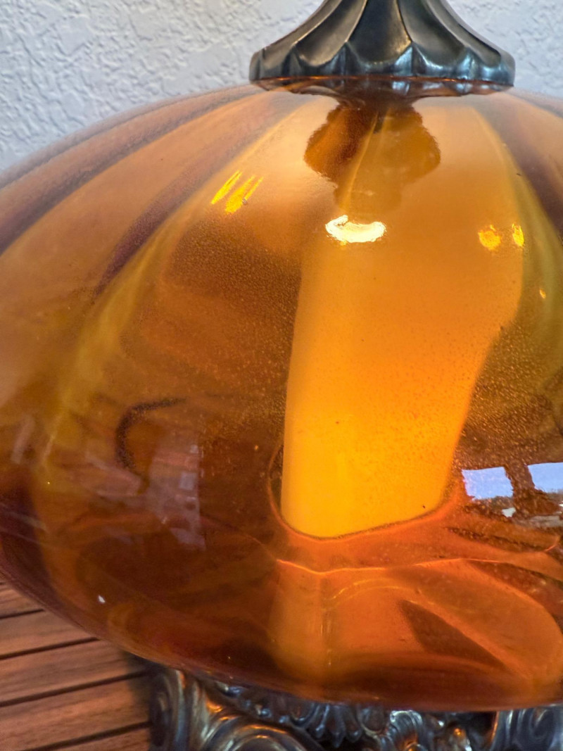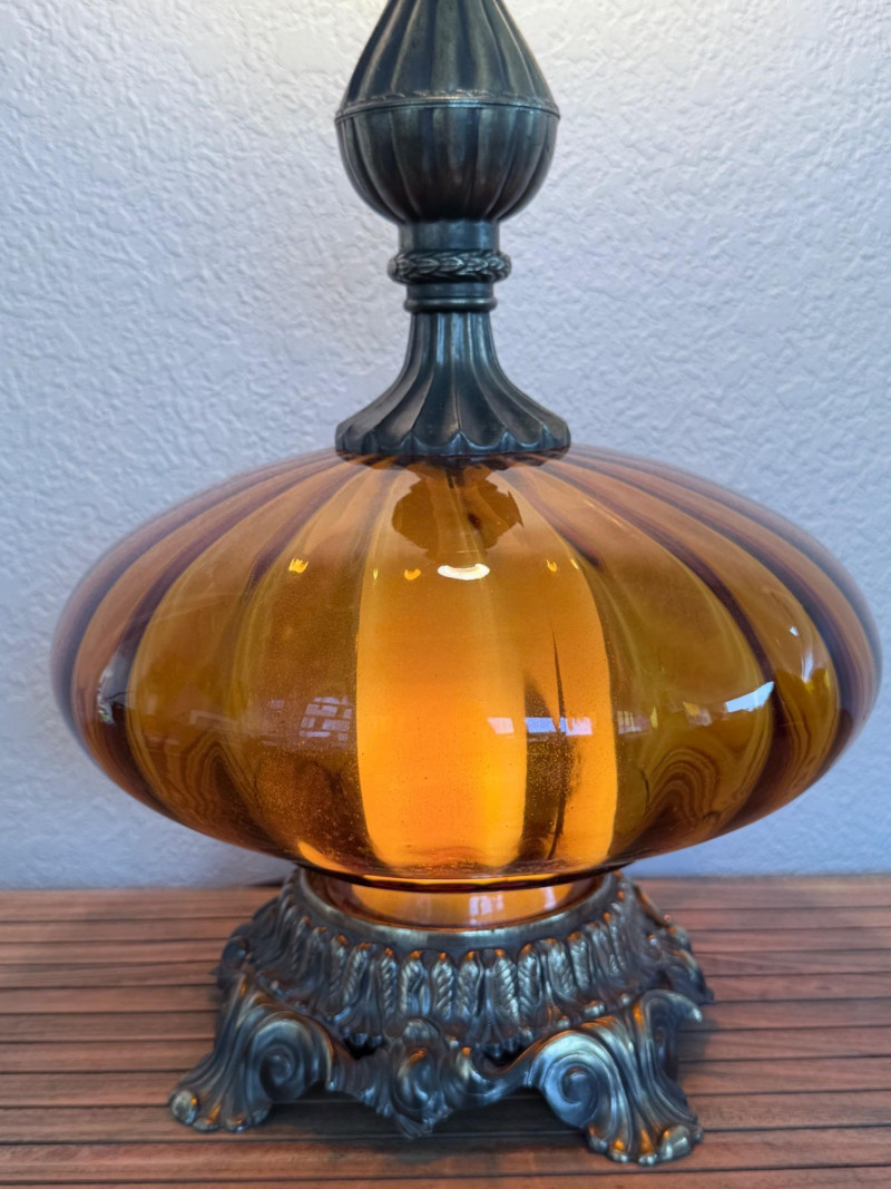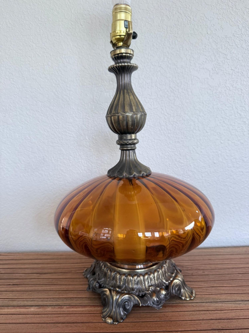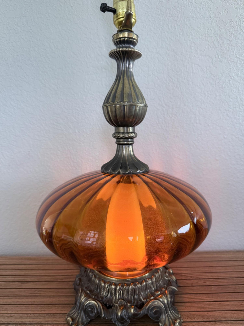 Mid-century amber glass table lamp with a fluted, bulbous base on an ornate metal stand and column. Includes a working top socket light and an internal base light for low illumination. The metal base and column feature scroll and leaf motifs. No harp is included.