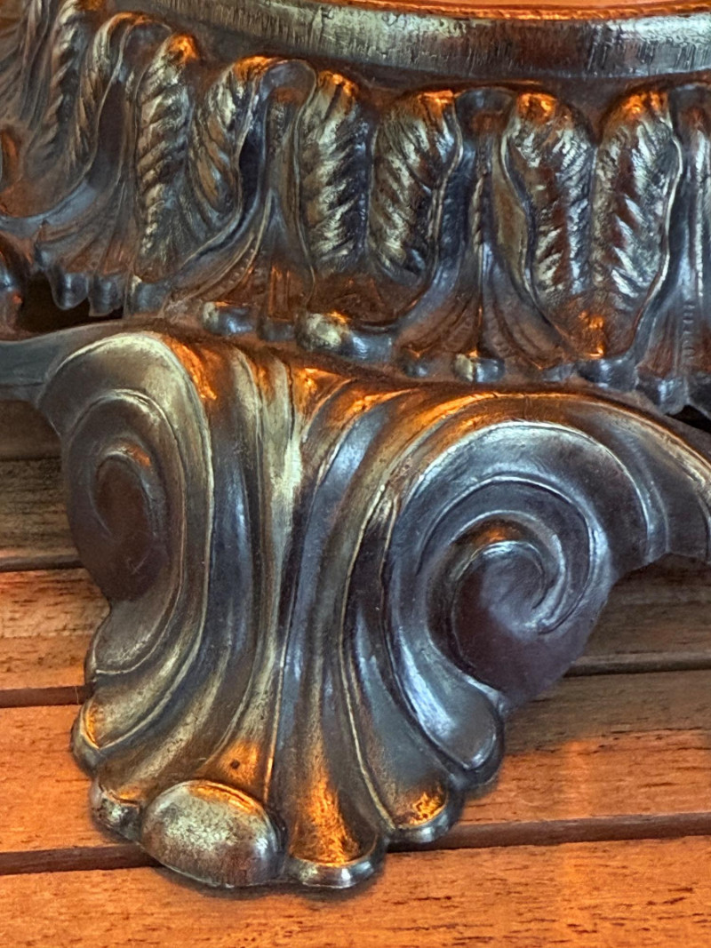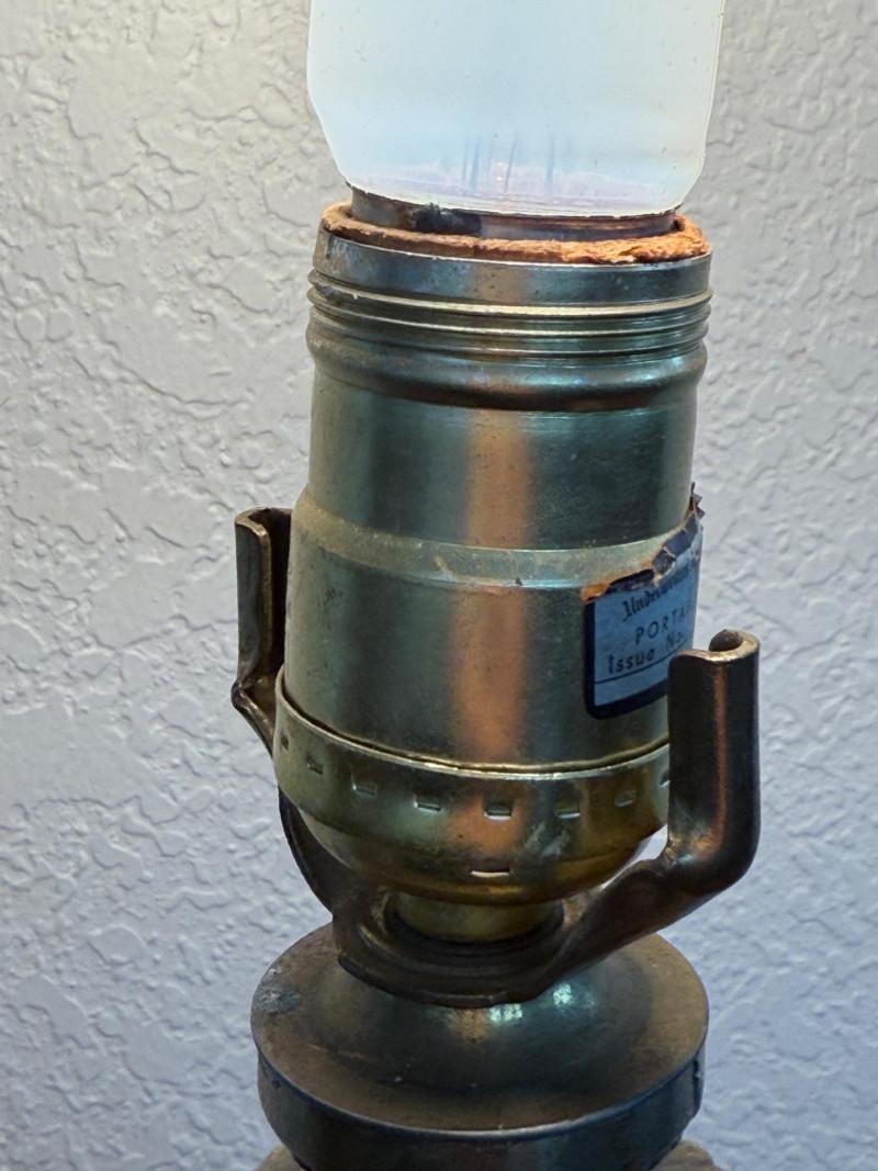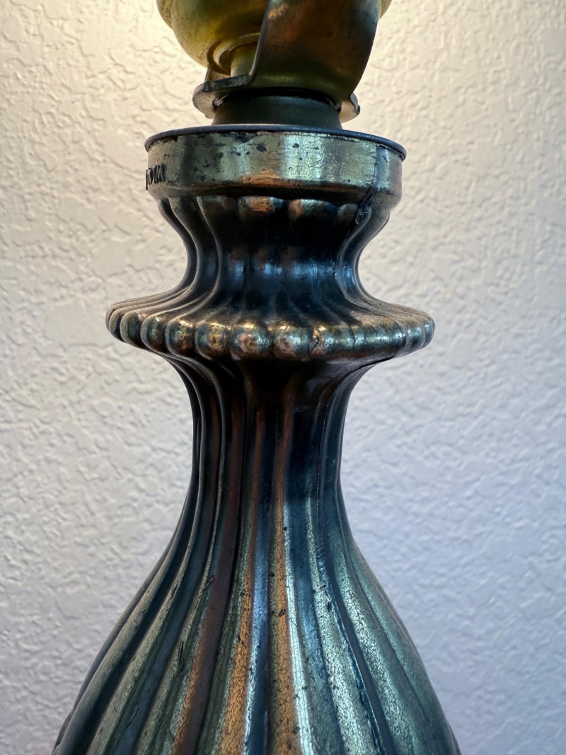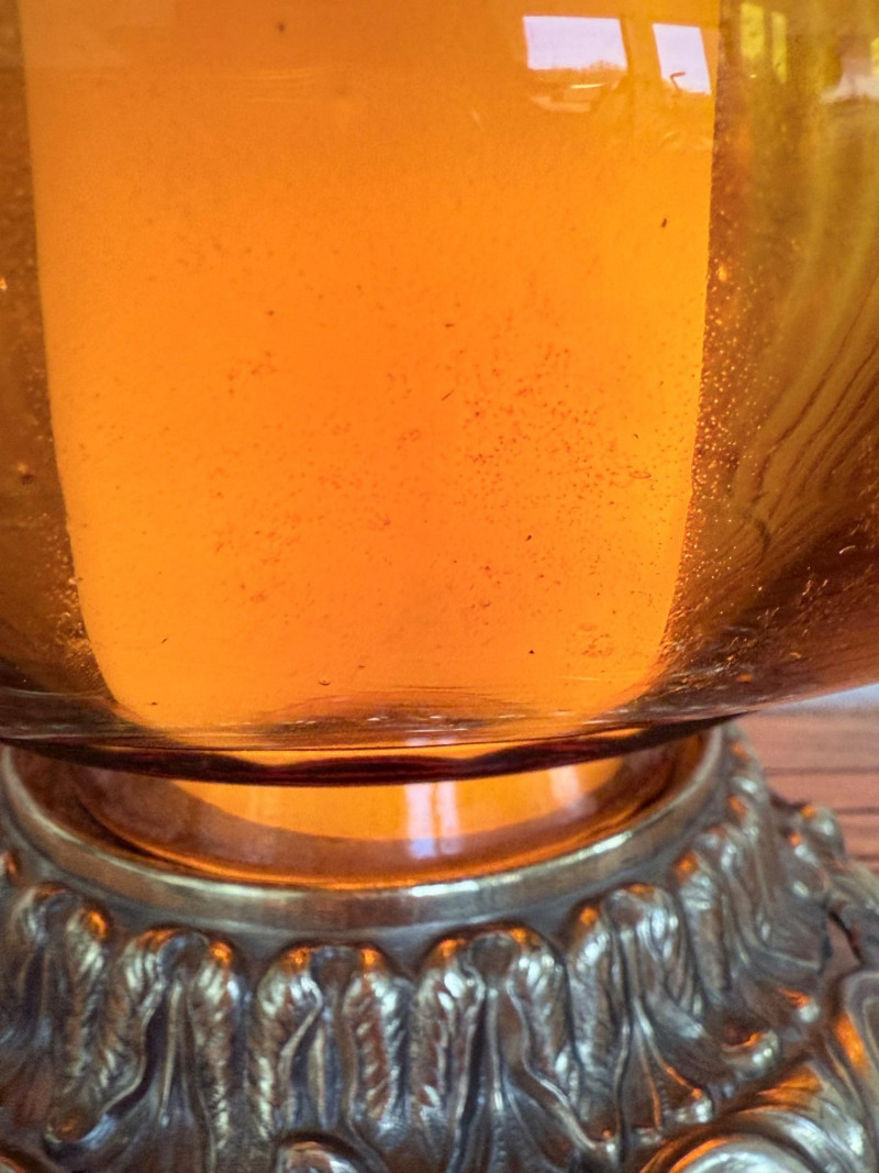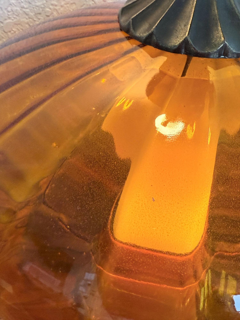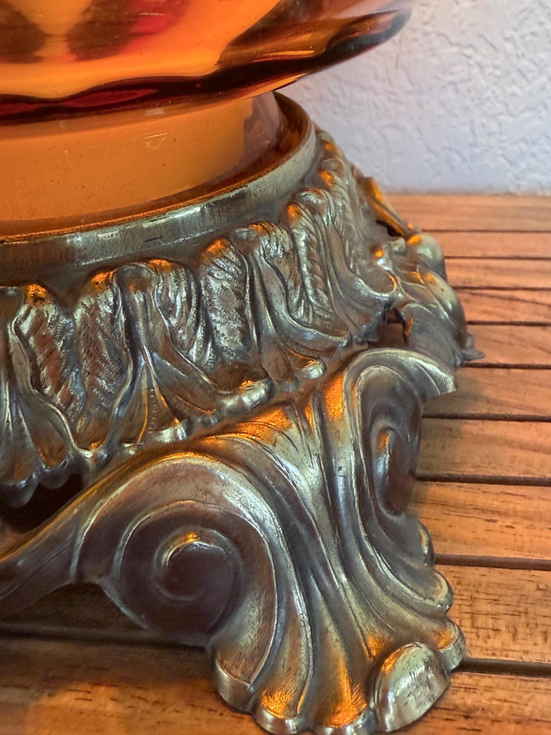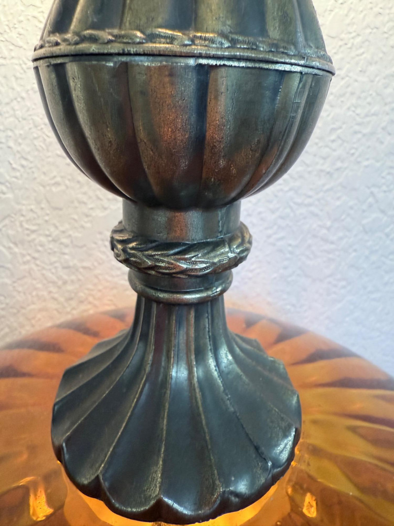 Mid-century amber glass table lamp with a fluted, bulbous base on an ornate metal stand and column. Includes a working top socket light and an internal base light for low illumination. The metal base and column feature scroll and leaf motifs. No harp is included.