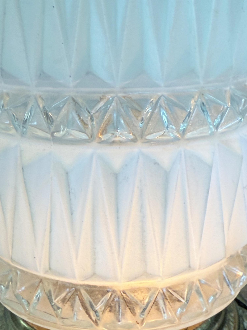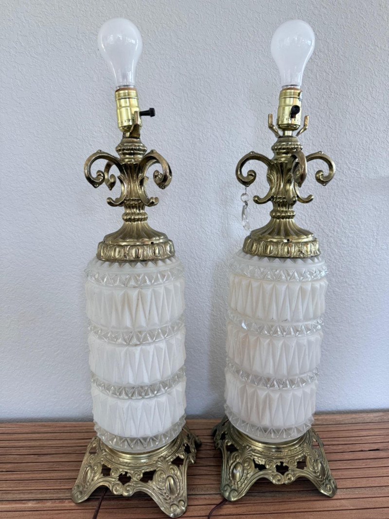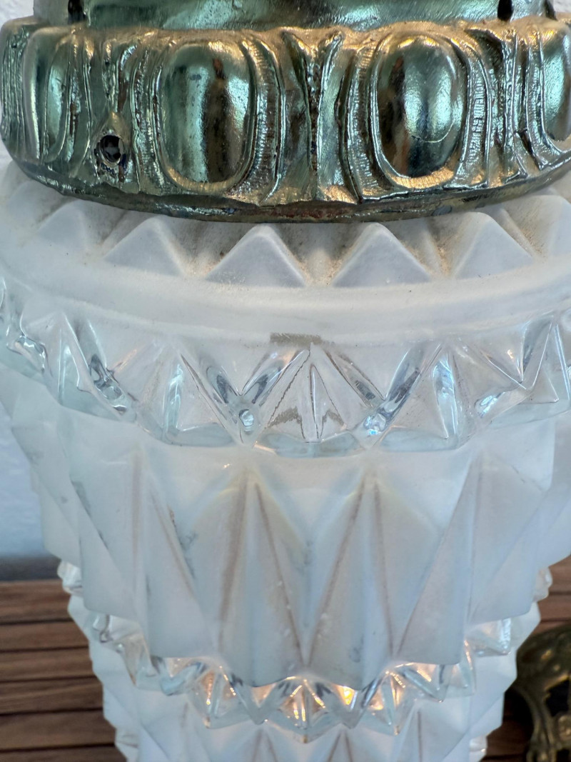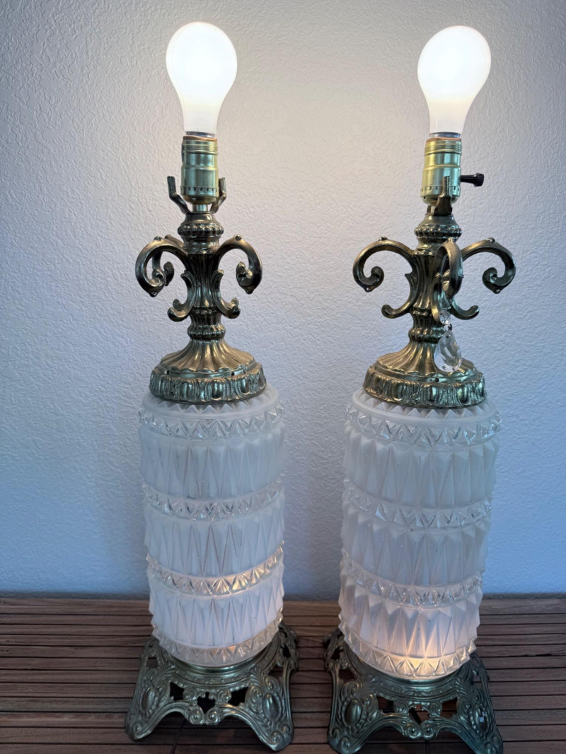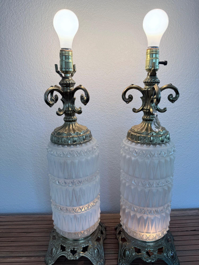 Vintage Pair of Ornate Frosted Glass and Brass Table Lamps – 23” Tall Offered here is a striking vintage pair of electric table lamps featuring elegant frosted cut glass bodies with internal lighting and ornate brass bases and detailing. These timeless pieces are both decorative and functional, ideal for vintage-inspired interiors, collector displays, or restoration enthusiasts. Each lamp measures 23 inches tall with a 7"x7" decorative brass base, showcasing intricate scrollwork and raised motifs. The mid-section of the lamp is composed of finely textured frosted glass with a faceted design that beautifully diffuses the light from the internal bulb within the glass base—a rare and highly desirable feature in vintage lighting. Condition & Features: Both lamps are tested and light up (top bulbs work; internal base lights may need new bulbs) Matching design and patina across both lamps Elegant brass construction with aged finish Eye-catching vintage silhouette with dual light sources Highlights: Height: 23" Base: 7" x 7" Material: Brass and frosted cut glass Working electrical components (base bulbs may require replacement) Unique dual-light functionality adds ambient glow These lamps are increasingly hard to find as a matched, working pair and are perfect for vintage decor lovers or collectors looking for quality craftsmanship from a bygone era.
