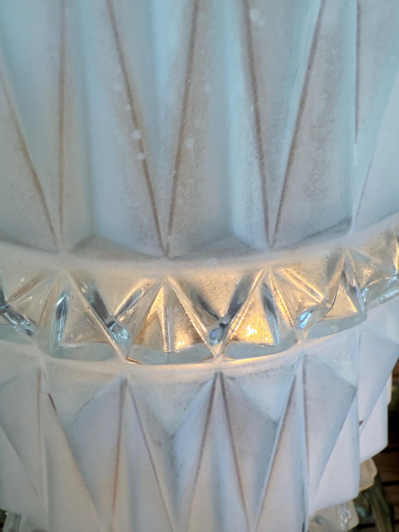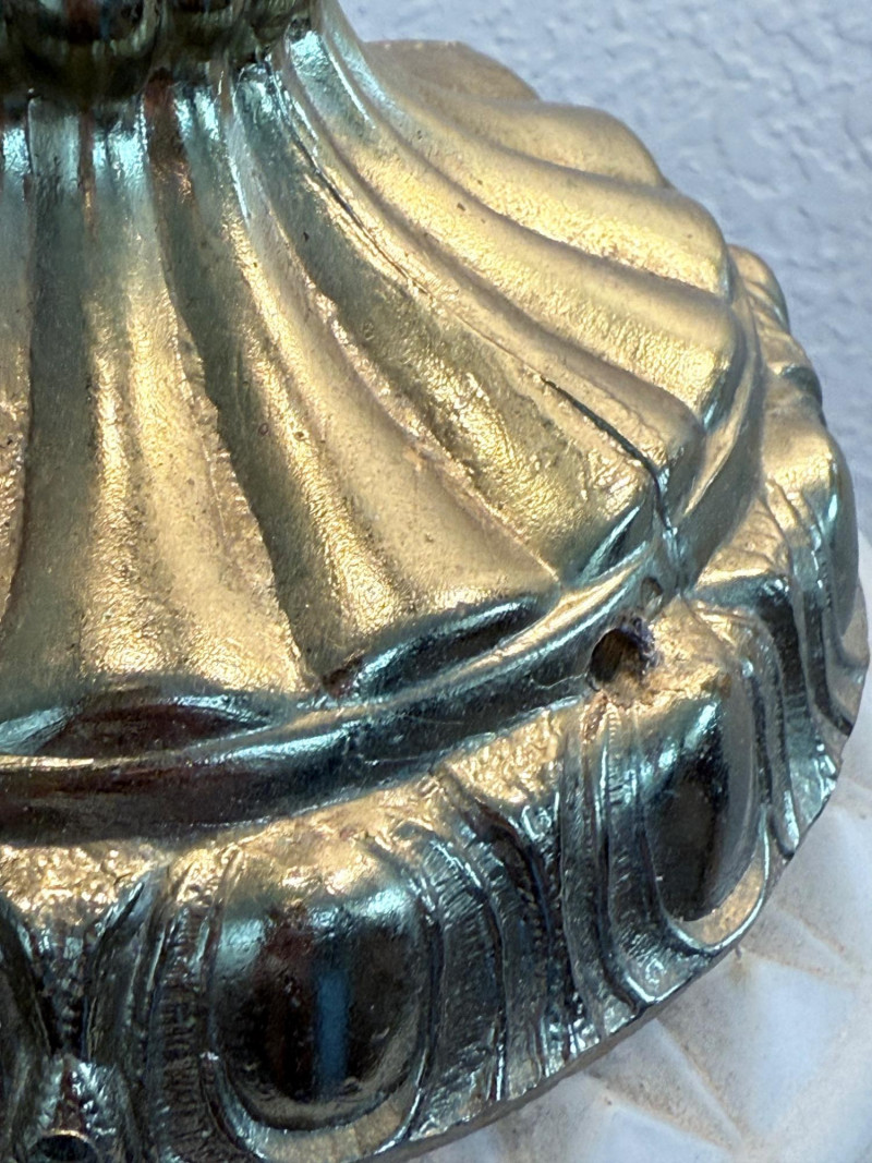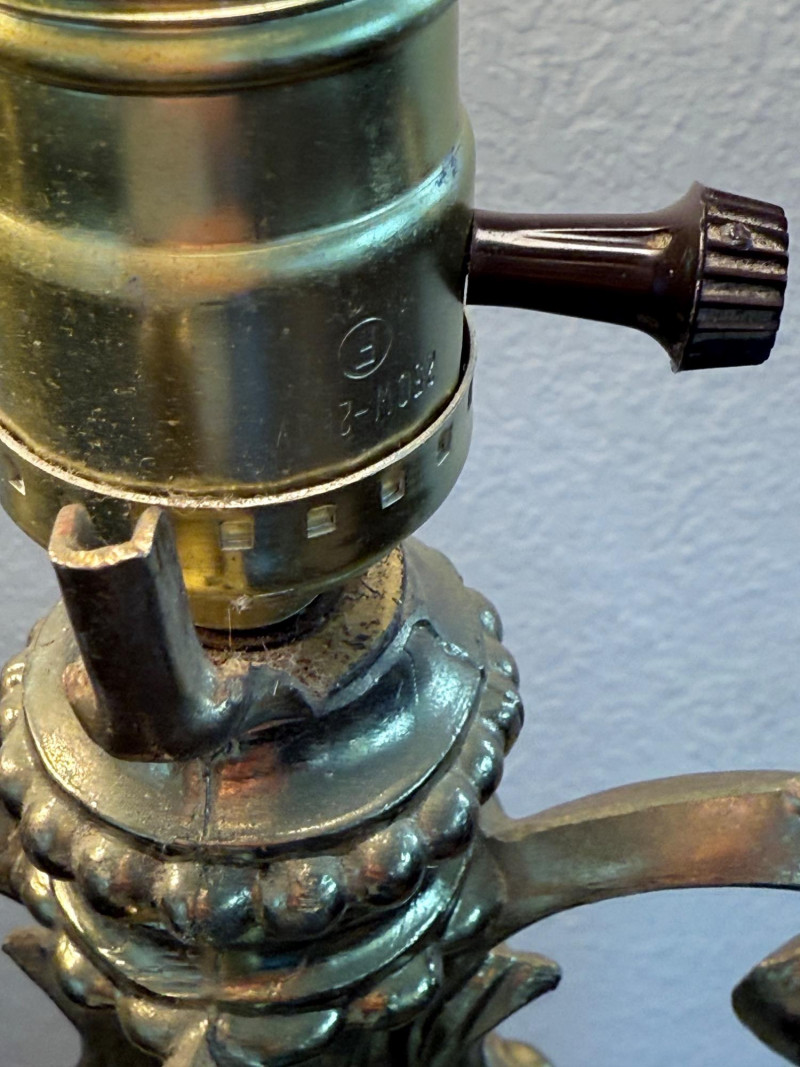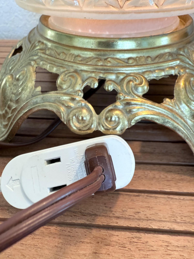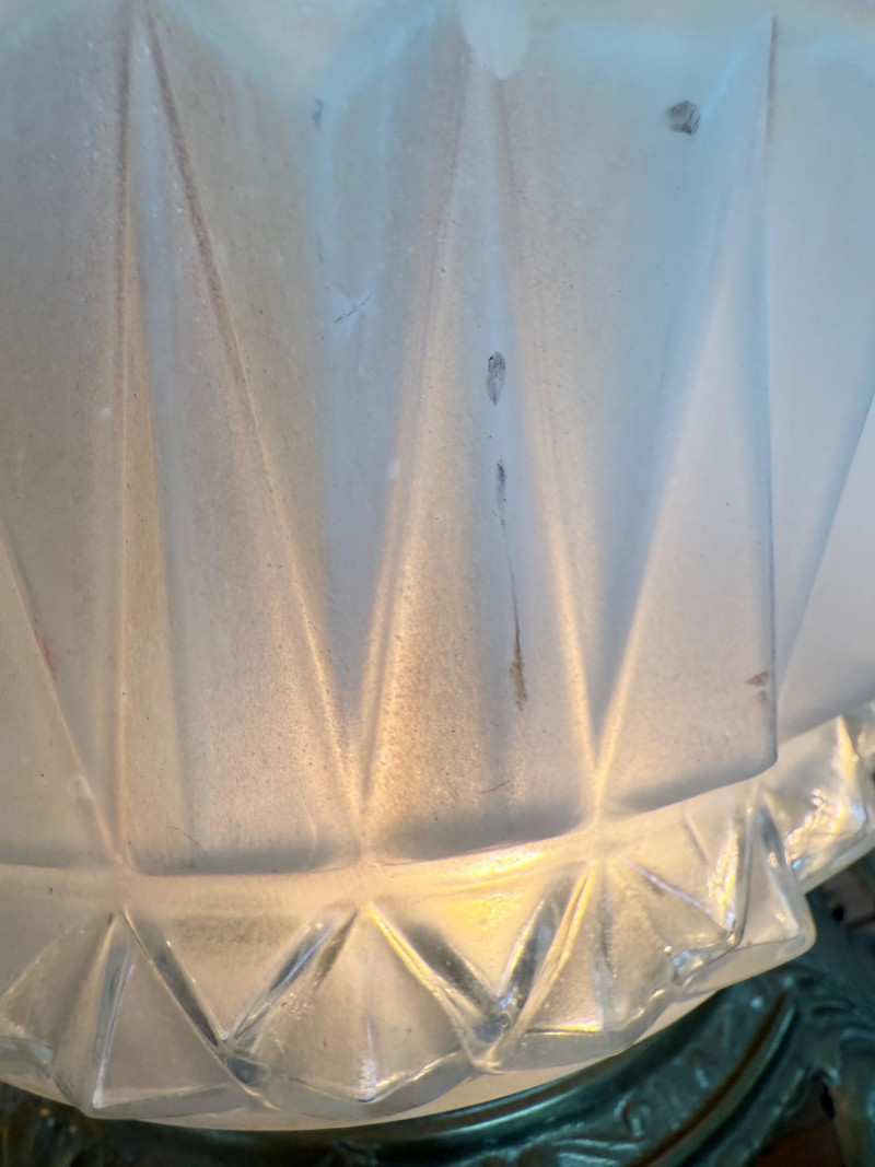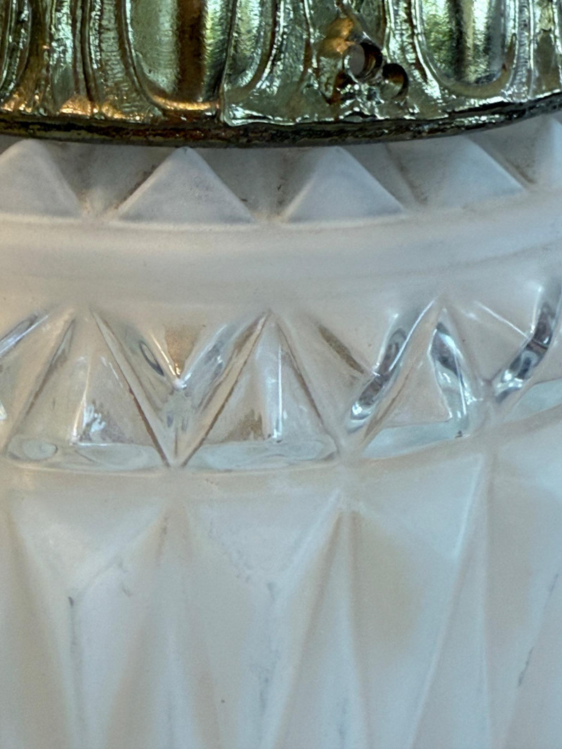 Vintage Pair of Ornate Frosted Glass and Brass Table Lamps – 23” Tall Offered here is a striking vintage pair of electric table lamps featuring elegant frosted cut glass bodies with internal lighting and ornate brass bases and detailing. These timeless pieces are both decorative and functional, ideal for vintage-inspired interiors, collector displays, or restoration enthusiasts. Each lamp measures 23 inches tall with a 7"x7" decorative brass base, showcasing intricate scrollwork and raised motifs. The mid-section of the lamp is composed of finely textured frosted glass with a faceted design that beautifully diffuses the light from the internal bulb within the glass base—a rare and highly desirable feature in vintage lighting. Condition & Features: Both lamps are tested and light up (top bulbs work; internal base lights may need new bulbs) Matching design and patina across both lamps Elegant brass construction with aged finish Eye-catching vintage silhouette with dual light sources Highlights: Height: 23" Base: 7" x 7" Material: Brass and frosted cut glass Working electrical components (base bulbs may require replacement) Unique dual-light functionality adds ambient glow These lamps are increasingly hard to find as a matched, working pair and are perfect for vintage decor lovers or collectors looking for quality craftsmanship from a bygone era.