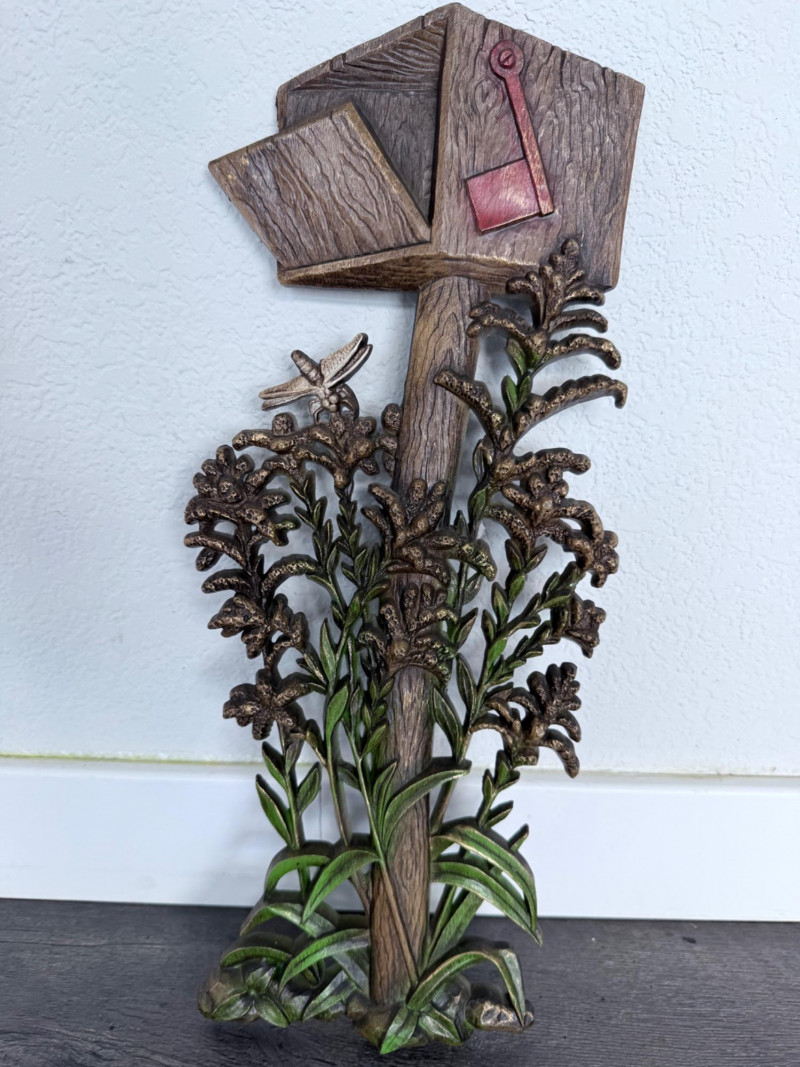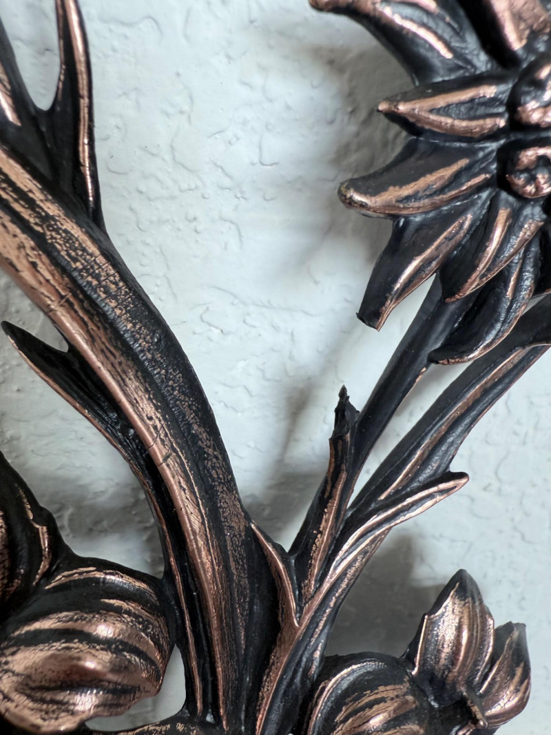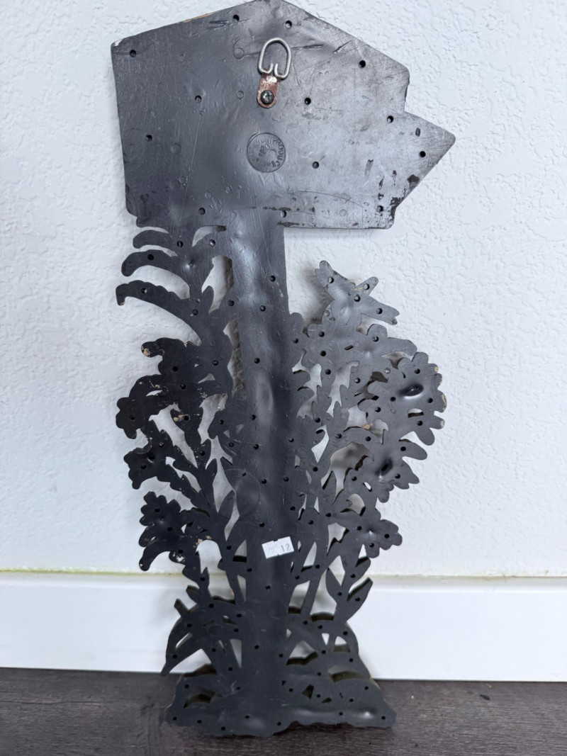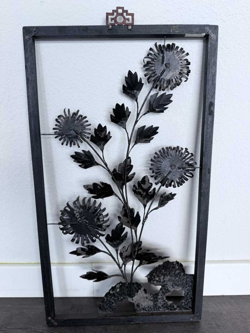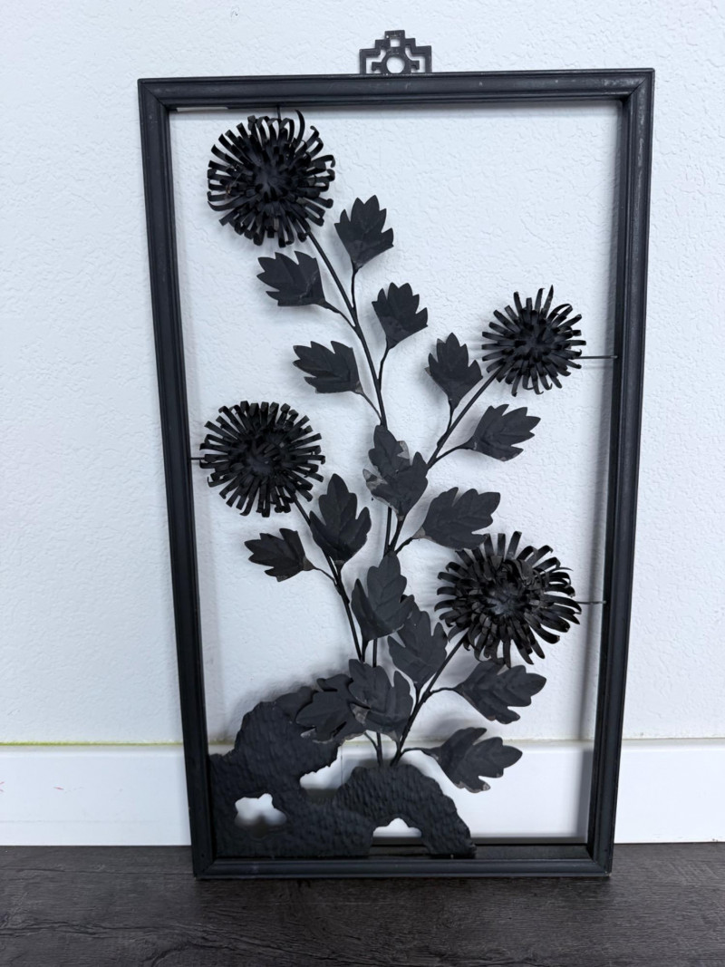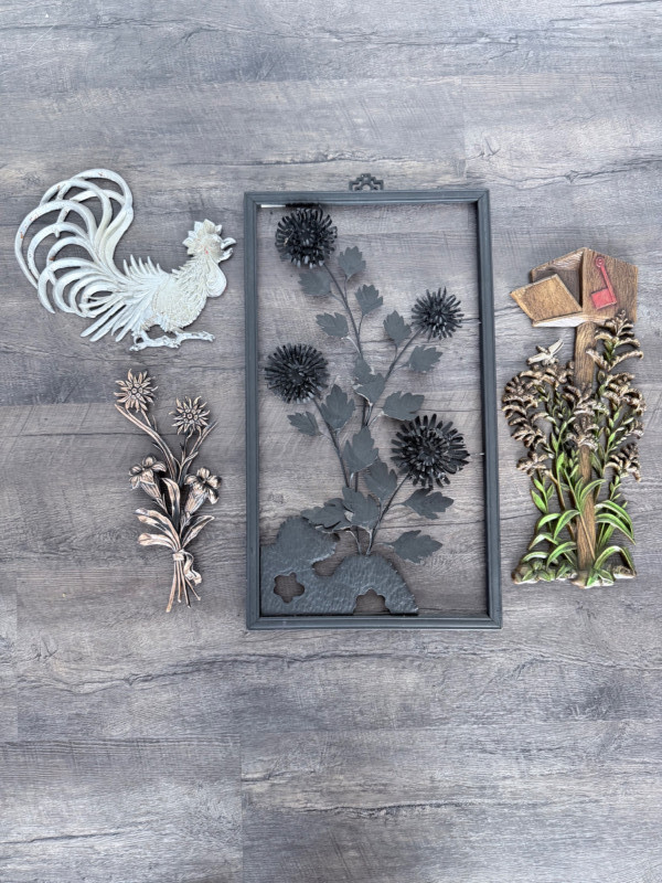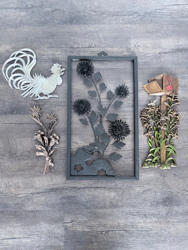 Set of 4 Vintage Wall Decor Pieces – Metal, Plastic, and Resin Includes: Framed Metal Wall Art: Black-painted metal floral design with layered spiky flowers and serrated leaves in a rectangular black frame. Marked "Made in Hong Kong." Approx. 20" x 13". Plastic Wall Plaque: Gold-tone molded plastic with raised floral motif. Approx. 13" x 5". Metal Rooster: Cutout wall piece in a cream finish. Approx. 11" x 10". Resin Wall Plaque: Molded resin with a mailbox post, flowers, and foliage. Painted with green and red accents. Approx. 18" x 7.5".