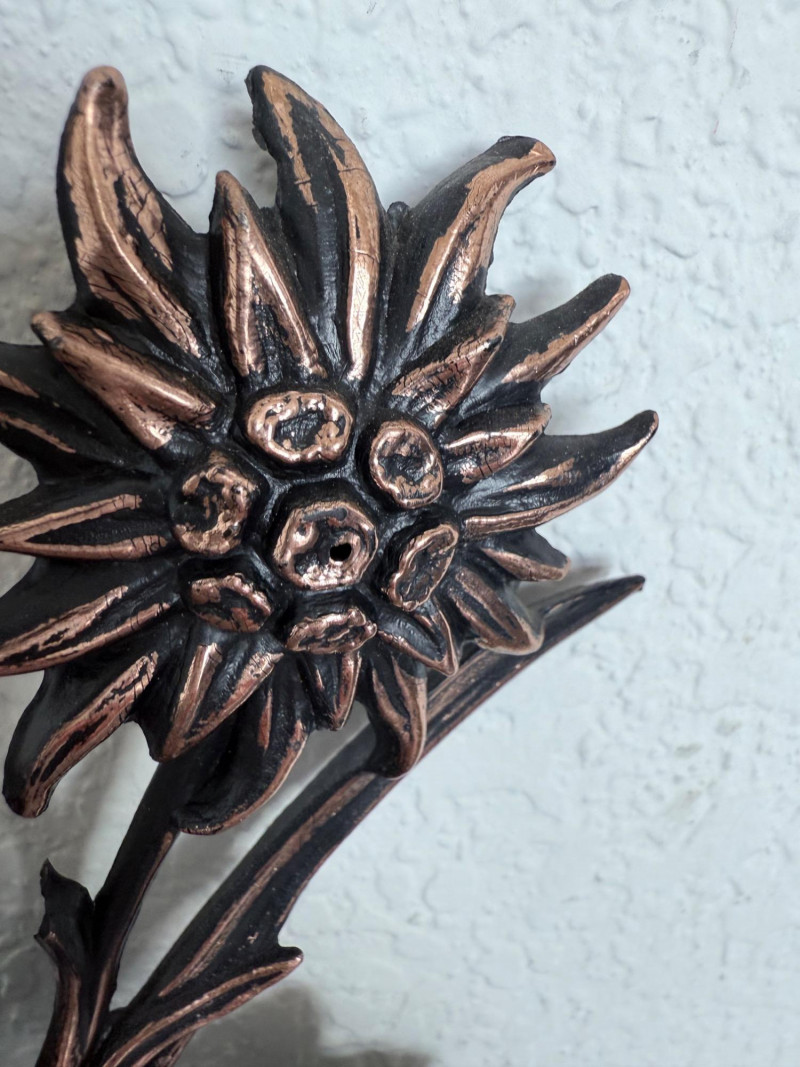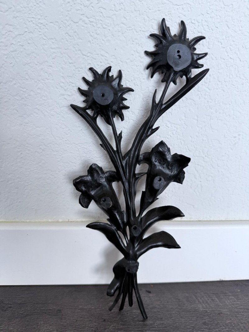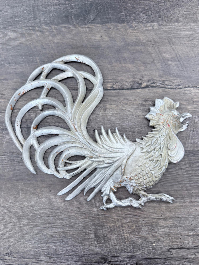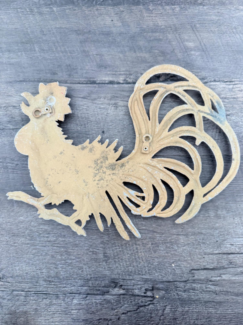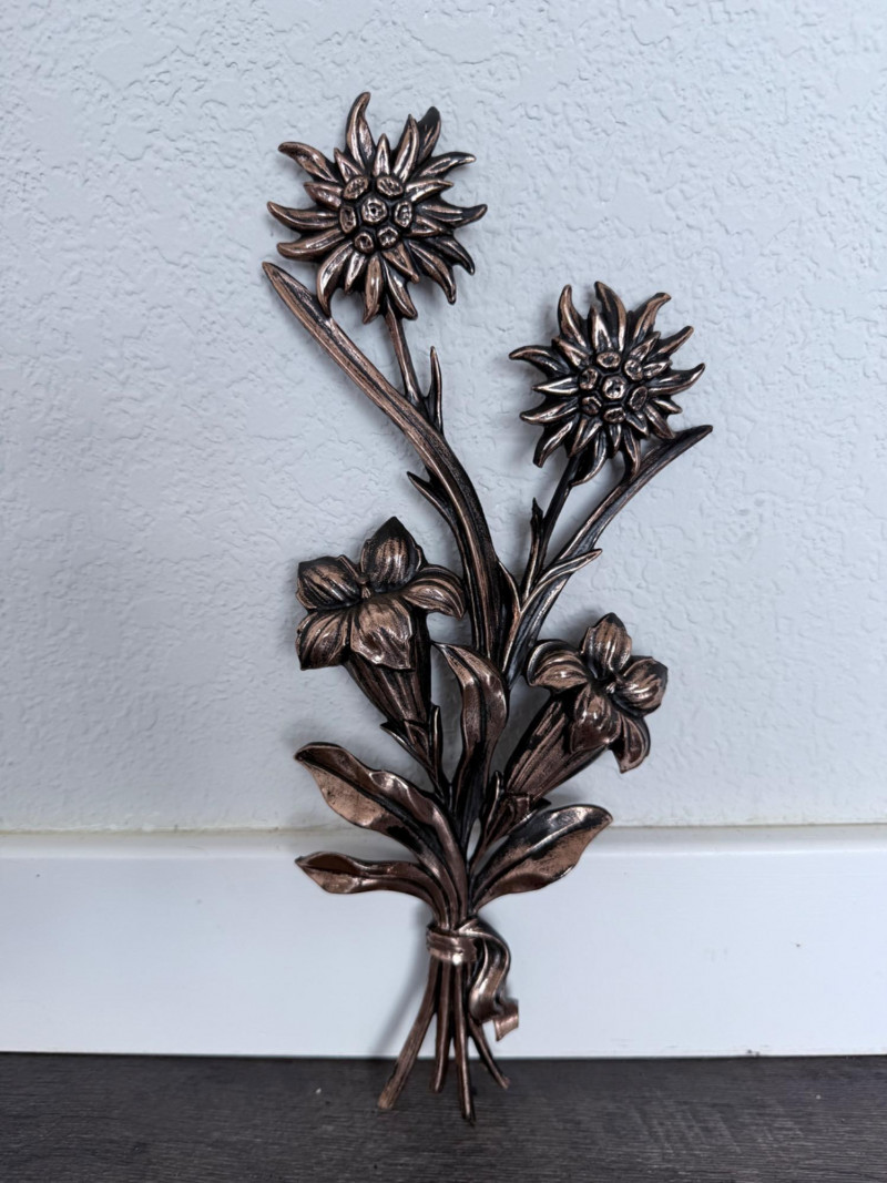Set of 4 Vintage Wall Decor Pieces – Metal, Plastic, and Resin Includes: Framed Metal Wall Art: Black-painted metal floral design with layered spiky flowers and serrated leaves in a rectangular black frame. Marked "Made in Hong Kong." Approx. 20" x 13". Plastic Wall Plaque: Gold-tone molded plastic with raised floral motif. Approx. 13" x 5". Metal Rooster: Cutout wall piece in a cream finish. Approx. 11" x 10". Resin Wall Plaque: Molded resin with a mailbox post, flowers, and foliage. Painted with green and red accents. Approx. 18" x 7.5".