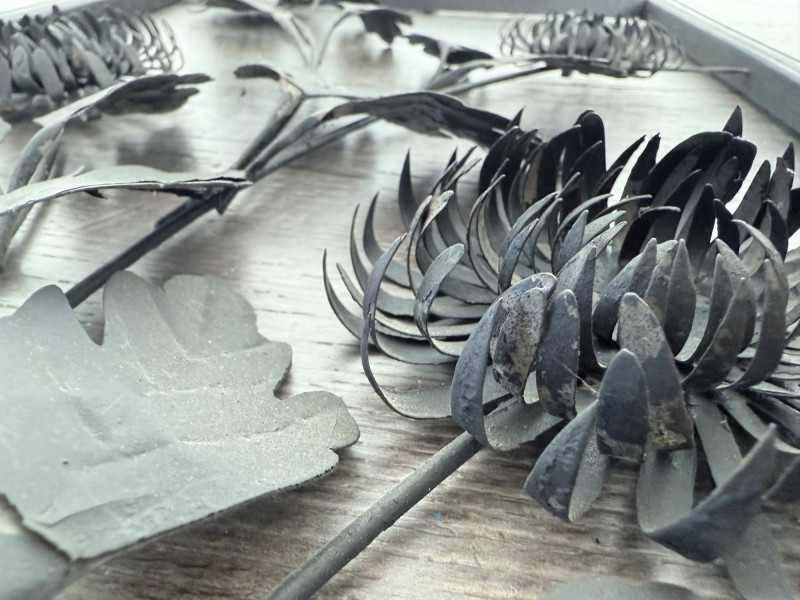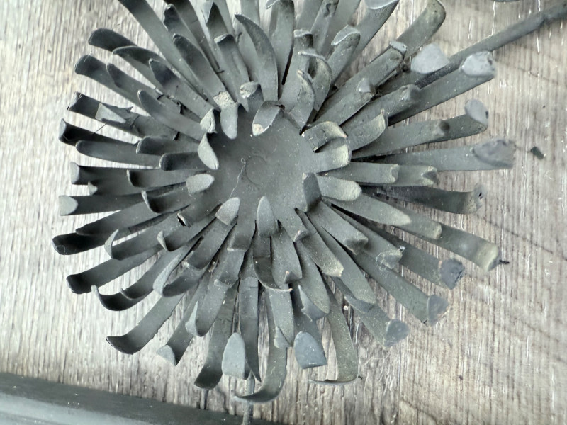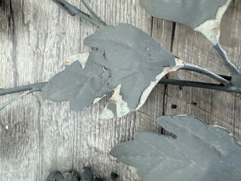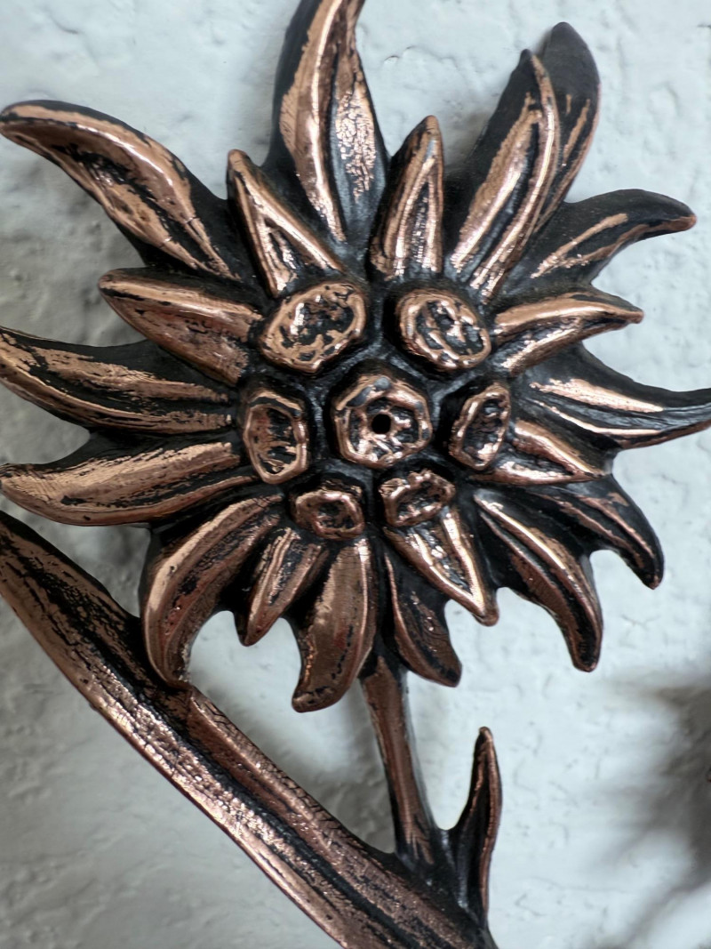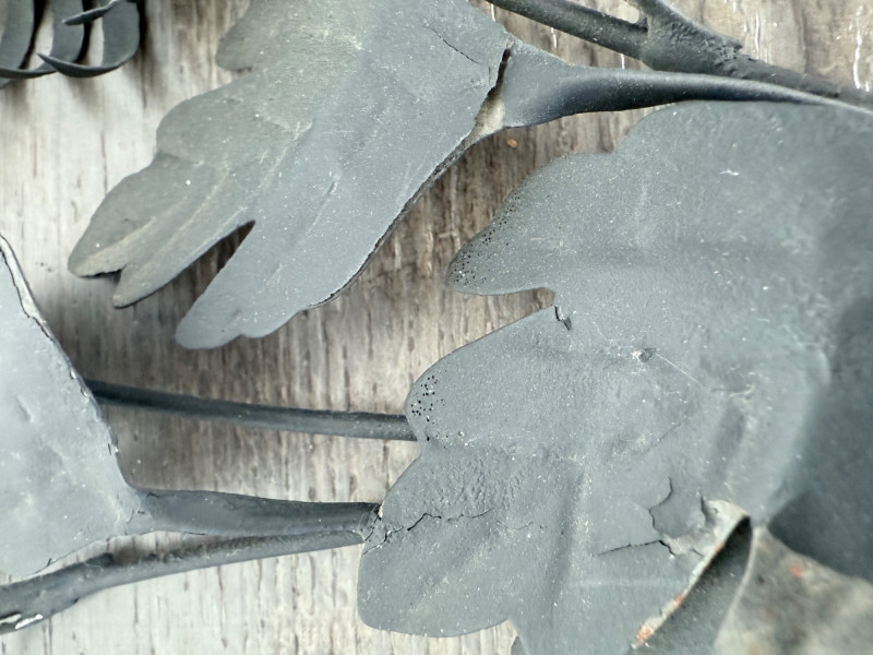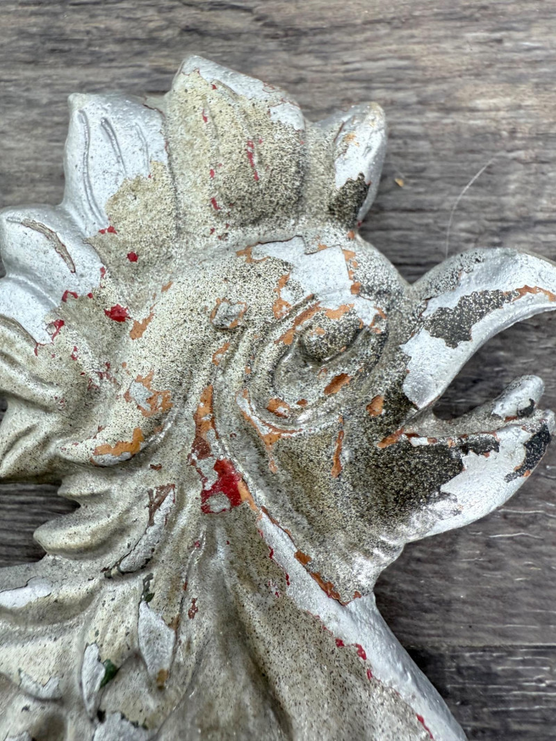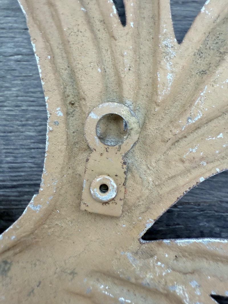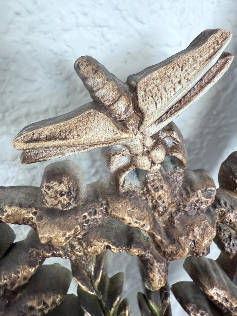 Set of 4 Vintage Wall Decor Pieces – Metal, Plastic, and Resin Includes: Framed Metal Wall Art: Black-painted metal floral design with layered spiky flowers and serrated leaves in a rectangular black frame. Marked "Made in Hong Kong." Approx. 20" x 13". Plastic Wall Plaque: Gold-tone molded plastic with raised floral motif. Approx. 13" x 5". Metal Rooster: Cutout wall piece in a cream finish. Approx. 11" x 10". Resin Wall Plaque: Molded resin with a mailbox post, flowers, and foliage. Painted with green and red accents. Approx. 18" x 7.5".
