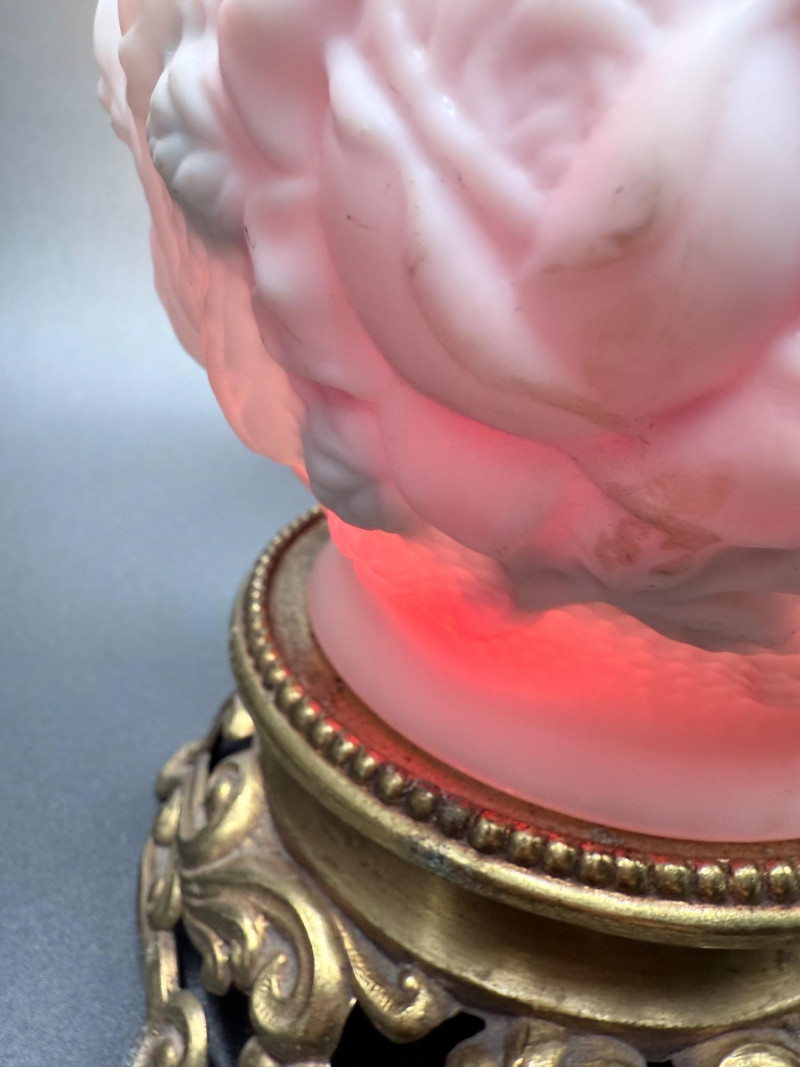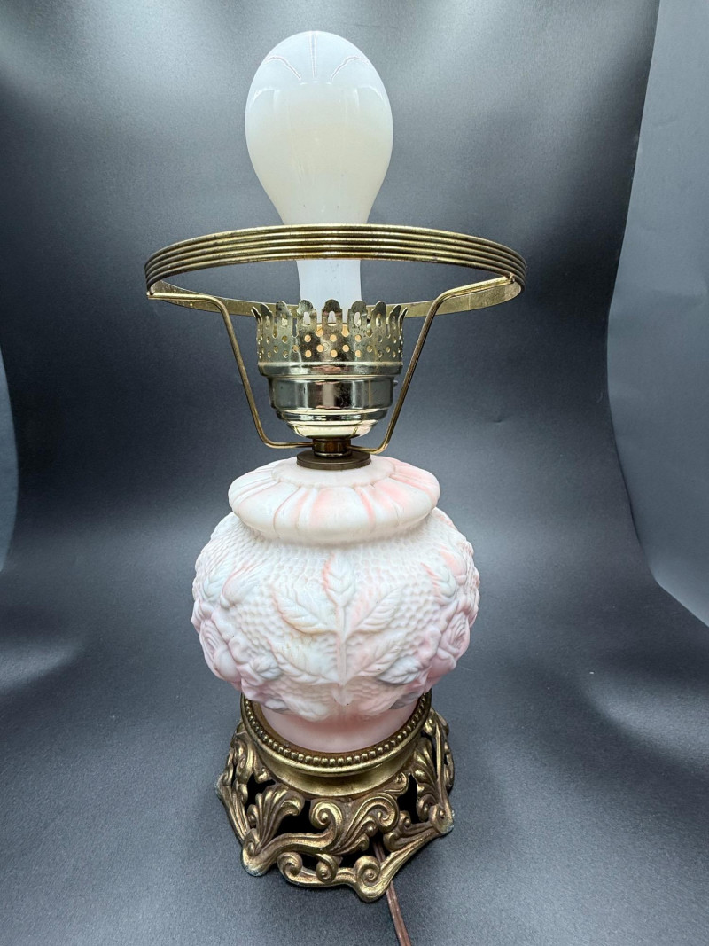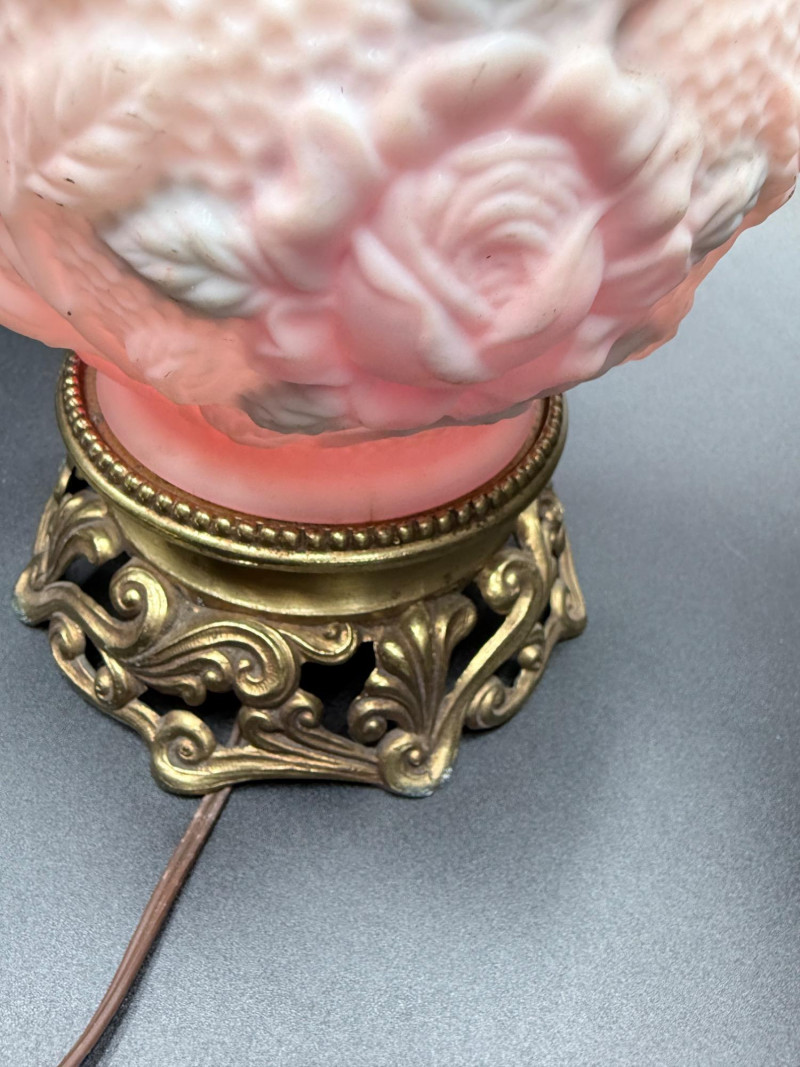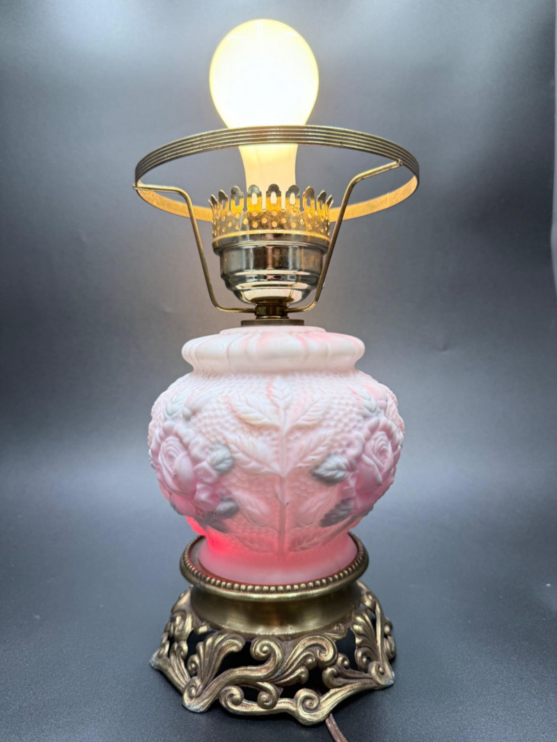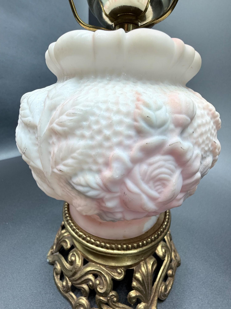 MCM Embossed Roses Glass Lamp Mid-century electric table lamp with embossed rose and leaf motifs on pink-tinged milk glass. The molded glass body sits on an ornate metal base with gold-tone finish. Fitted with a metal collar and harp (shade not included). Measurements: Note: Both parts of the lamp work.