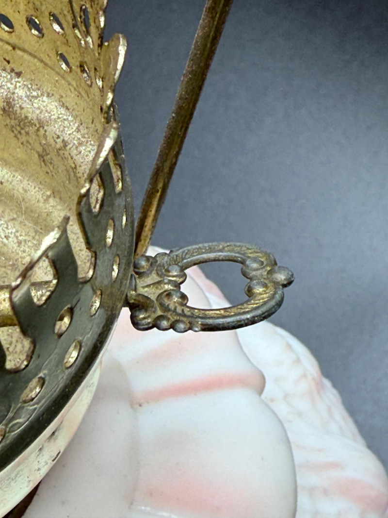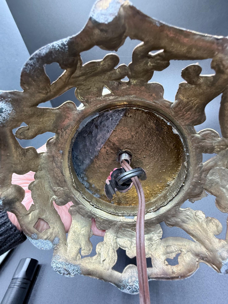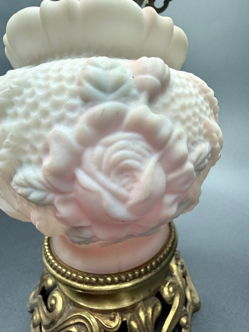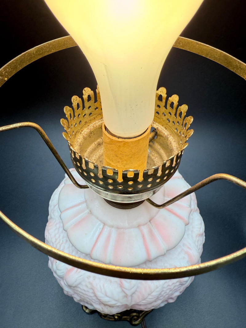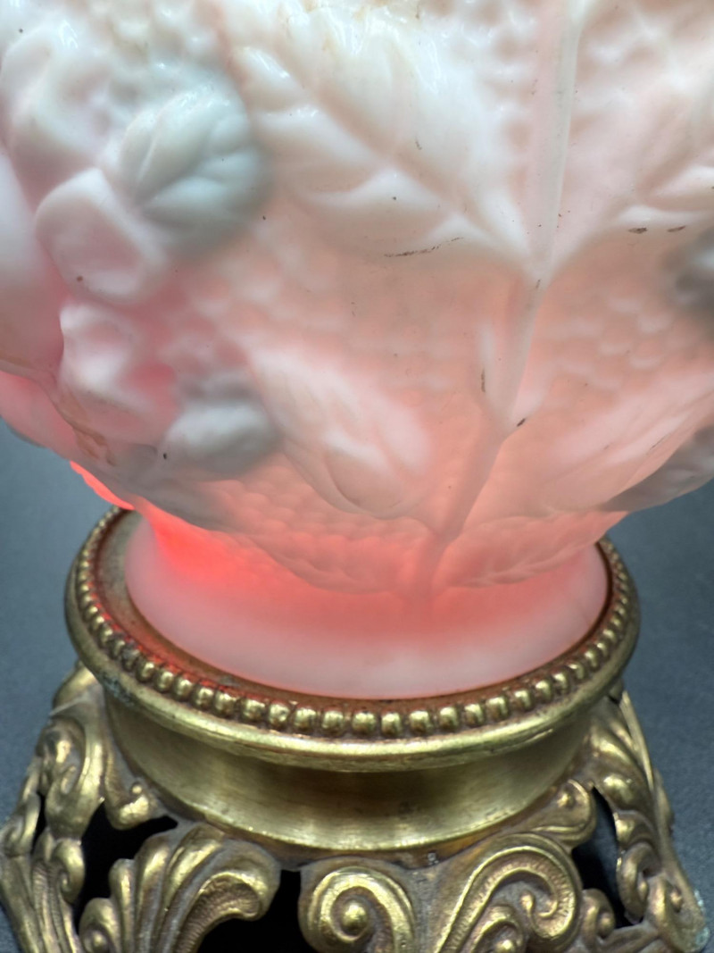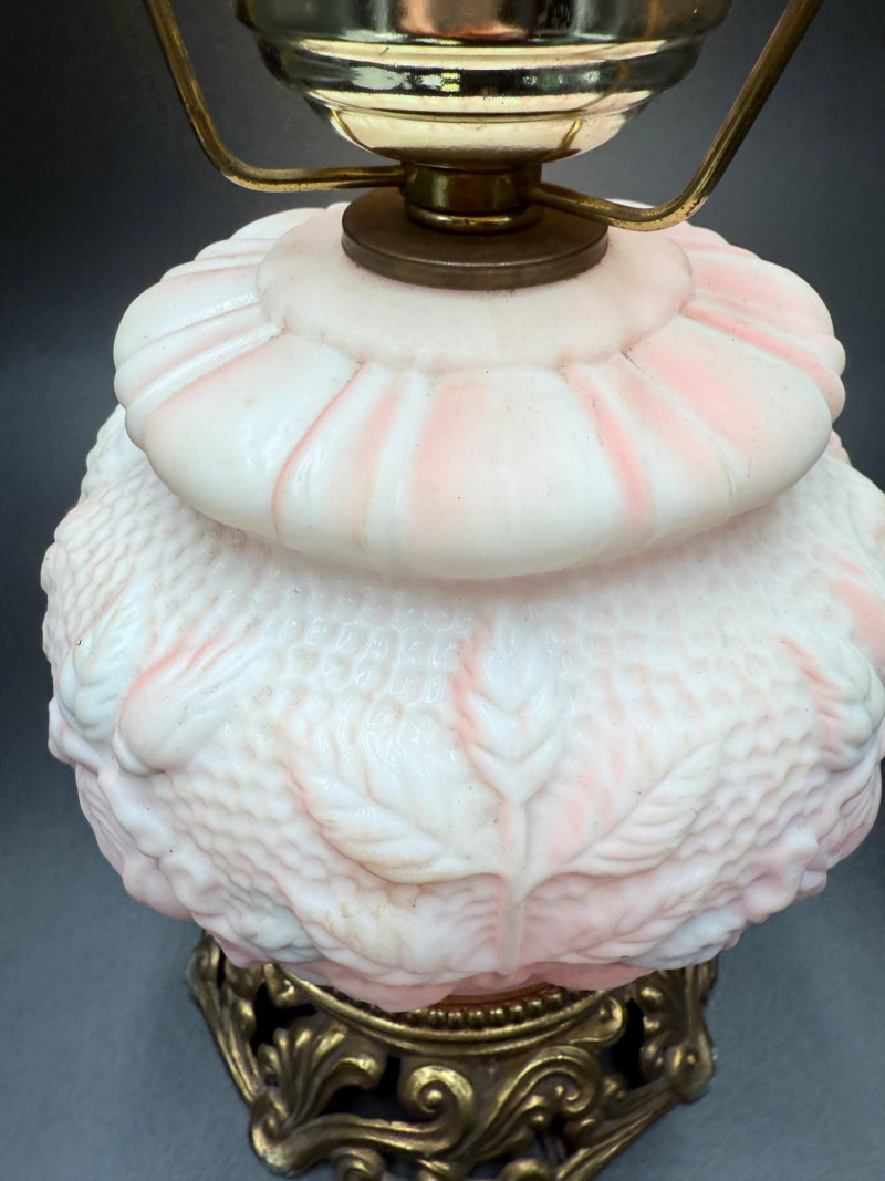MCM Embossed Roses Glass Lamp Mid-century electric table lamp with embossed rose and leaf motifs on pink-tinged milk glass. The molded glass body sits on an ornate metal base with gold-tone finish. Fitted with a metal collar and harp (shade not included). Measurements: Note: Both parts of the lamp work.