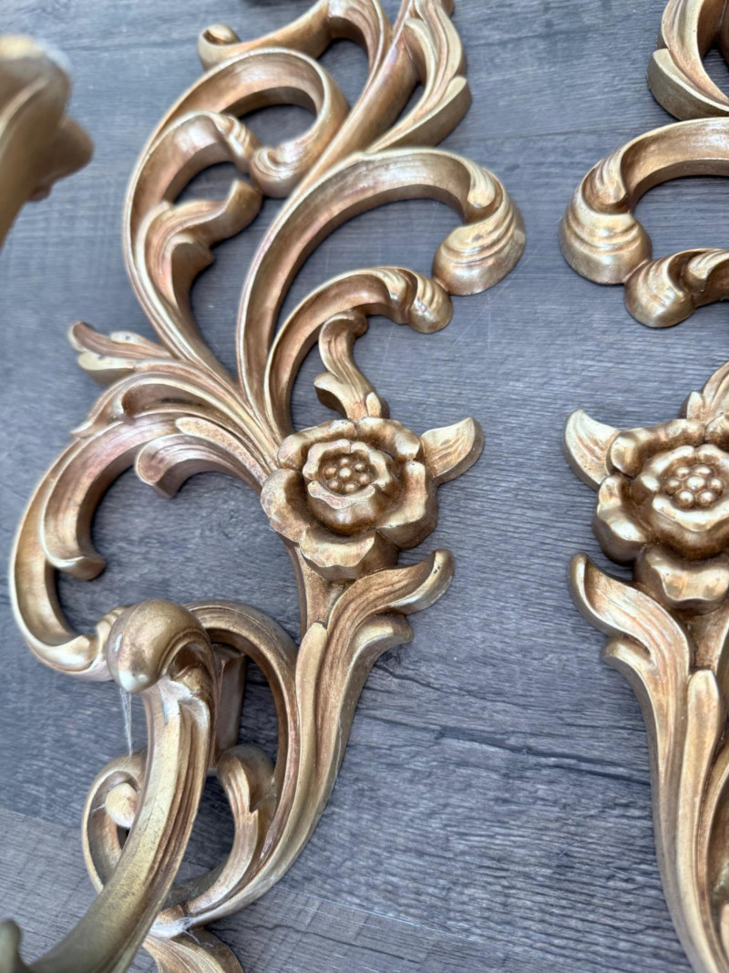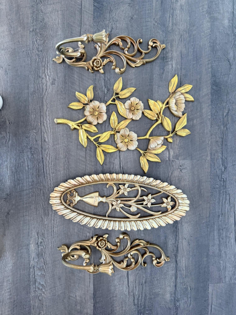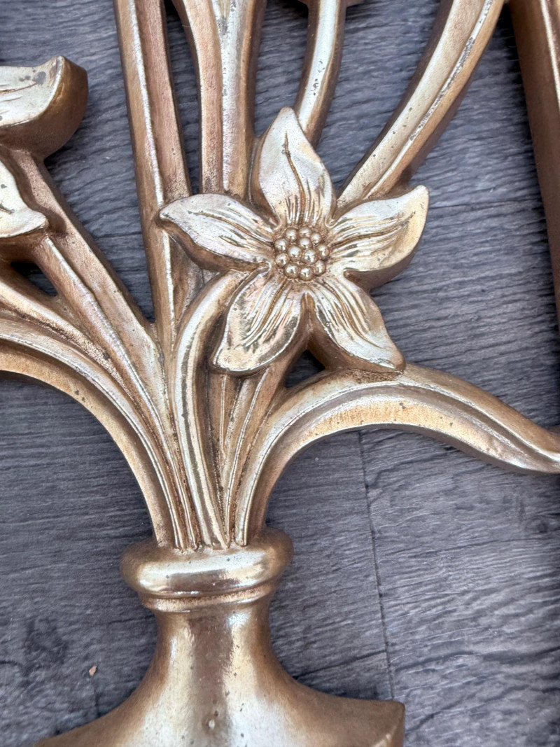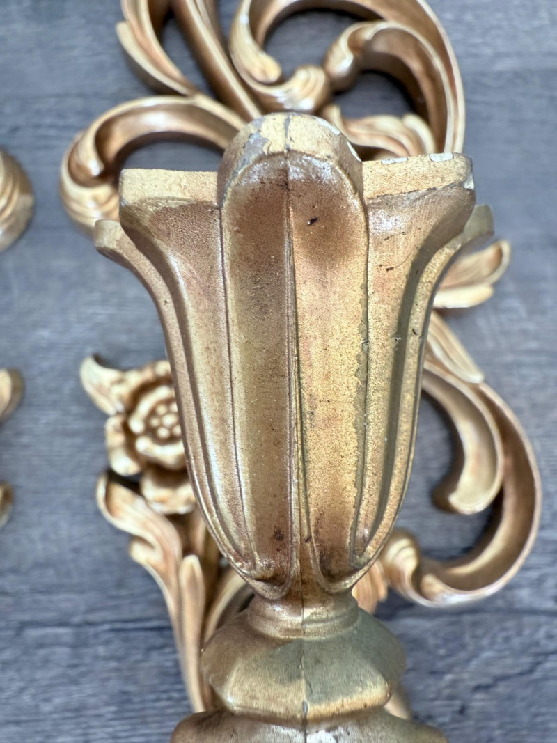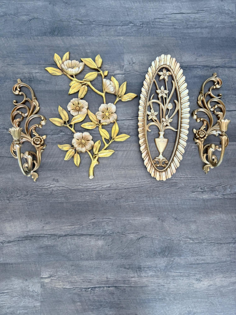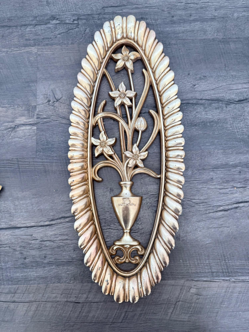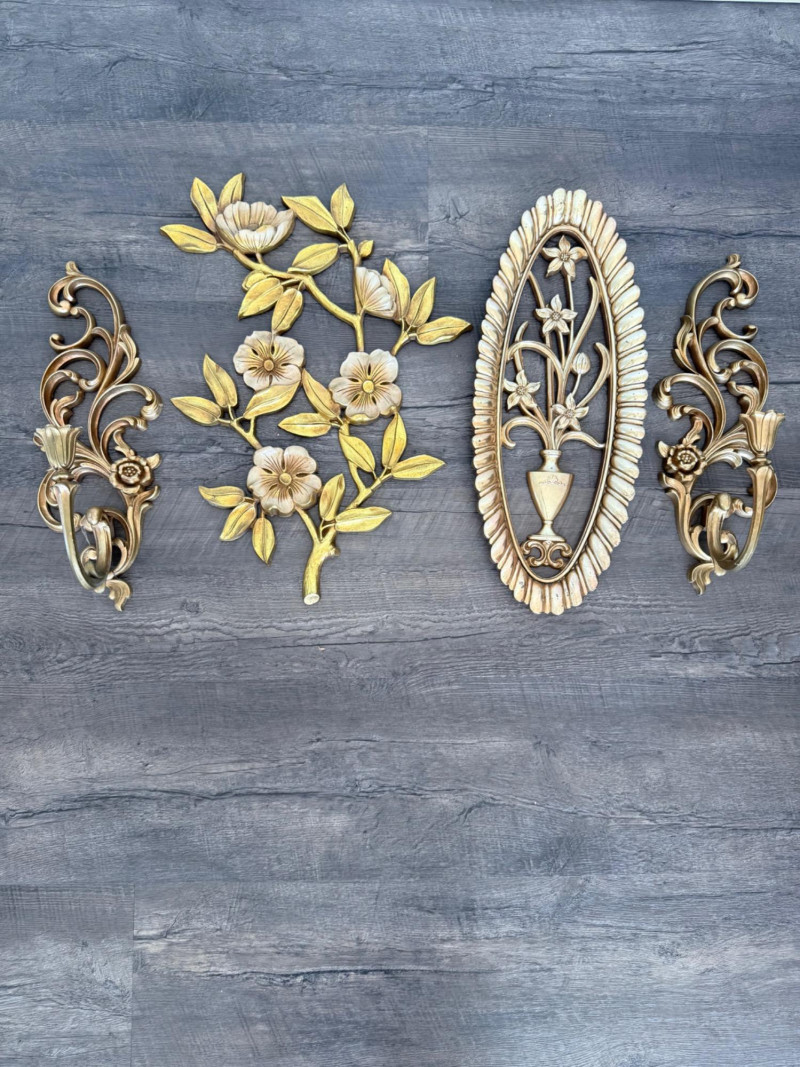 Syroco Wall Plaques – 4-Piece Resin Set One floral wall plaque with layered flower and leaf forms (20" x 14") One vertical oval plaque with raised flower arrangement in a vase (19" x 8") Two scroll-form candle holders with integrated flower designs (each 16" x 6") Each piece is molded with surface relief details. Backs are marked with SYROCO or SYROCO INC. and copyright numbers. Hanging hardware is attached. Material is resin