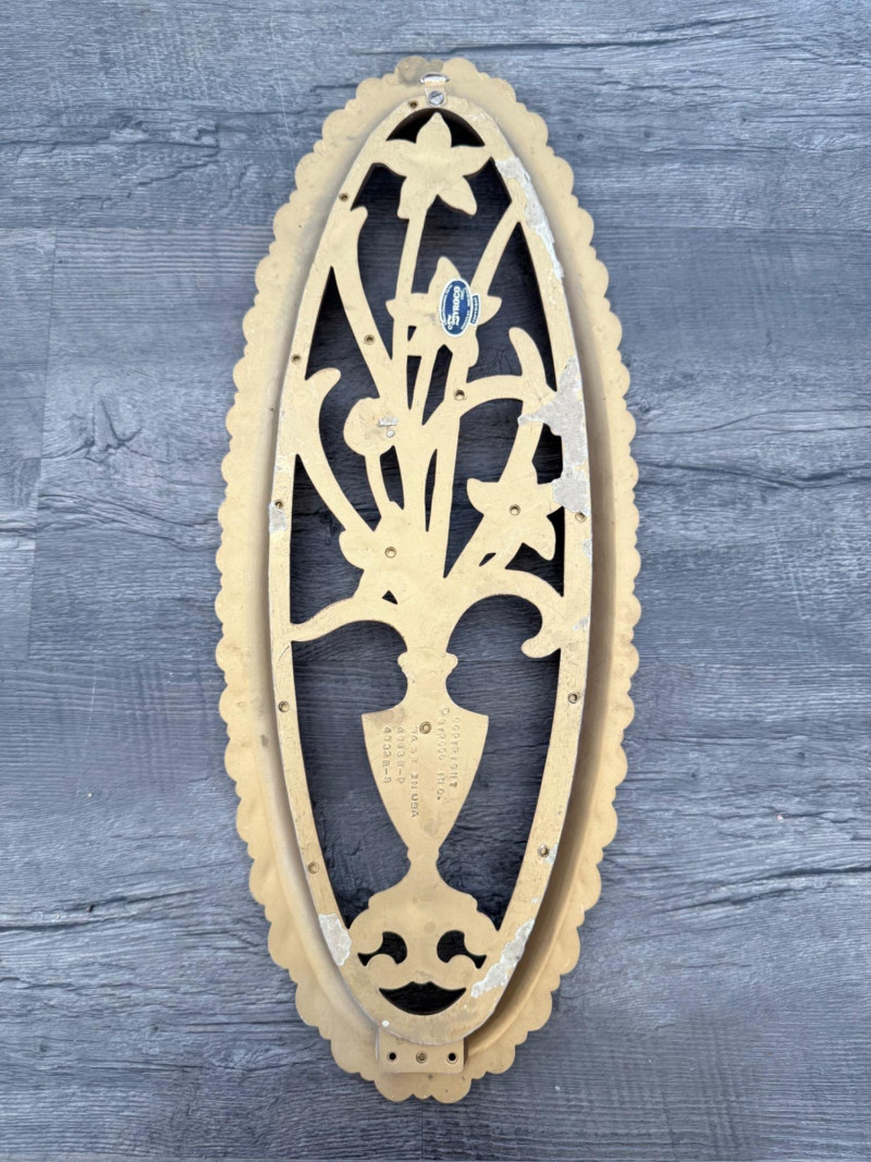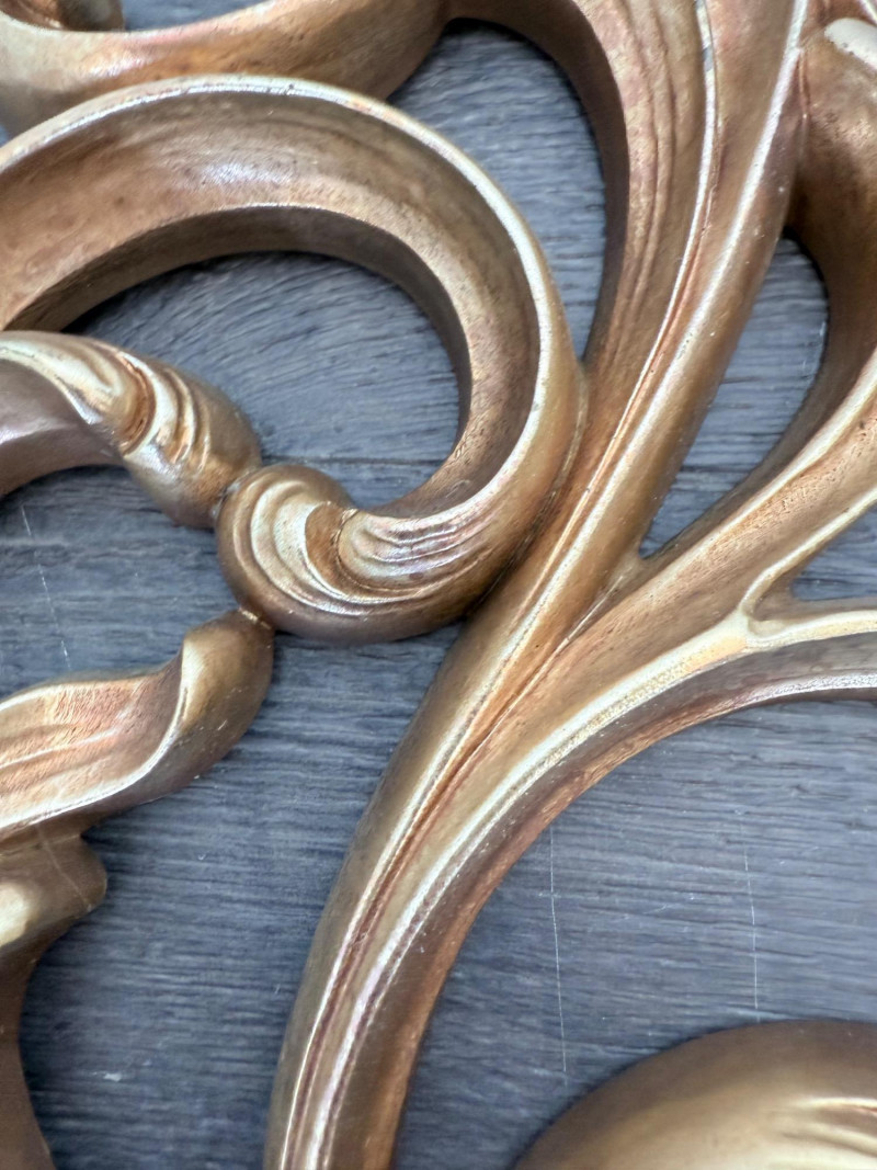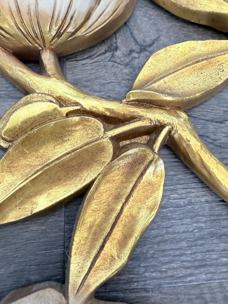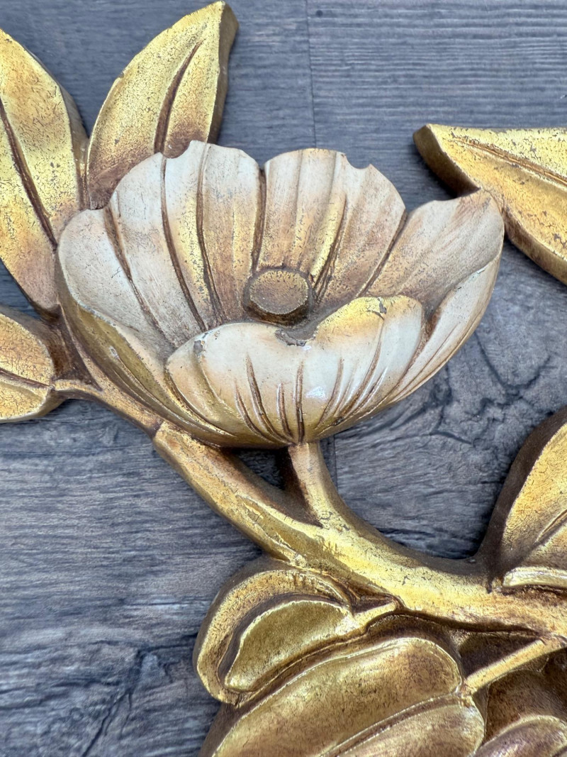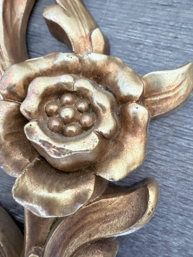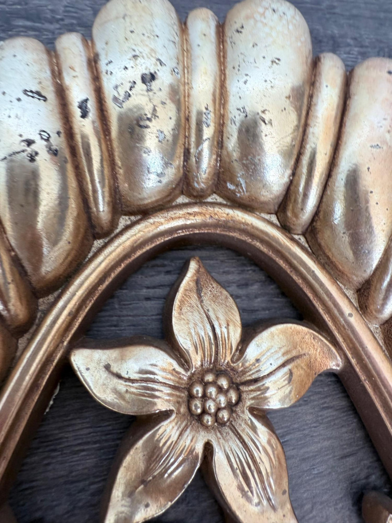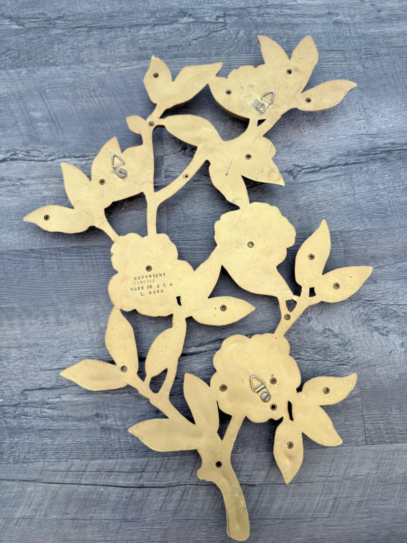 Syroco Wall Plaques – 4-Piece Resin Set One floral wall plaque with layered flower and leaf forms (20" x 14") One vertical oval plaque with raised flower arrangement in a vase (19" x 8") Two scroll-form candle holders with integrated flower designs (each 16" x 6") Each piece is molded with surface relief details. Backs are marked with SYROCO or SYROCO INC. and copyright numbers. Hanging hardware is attached. Material is resin