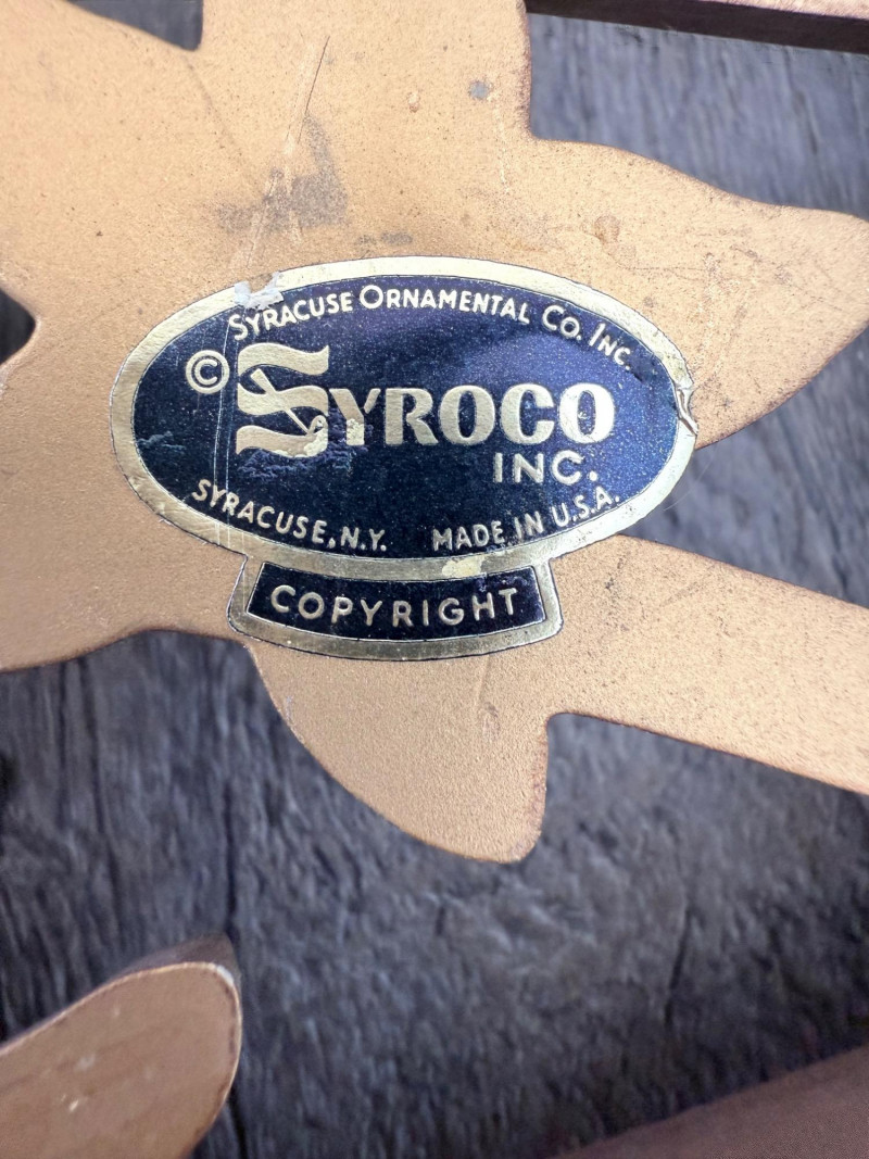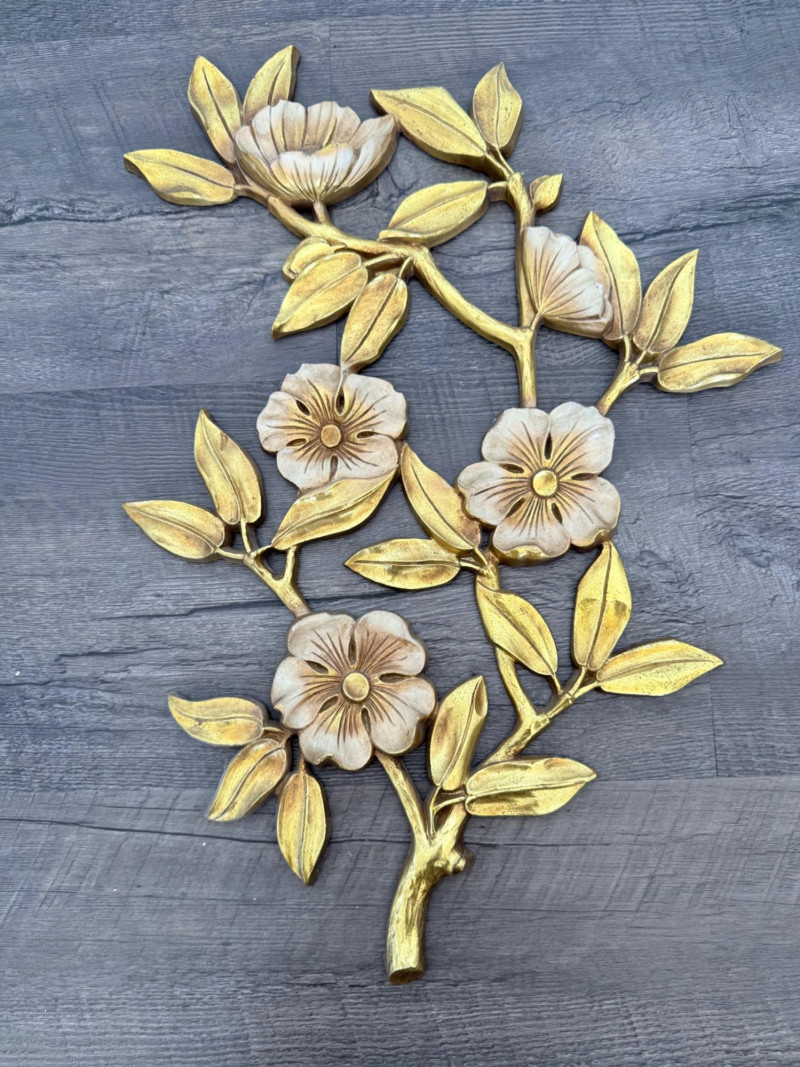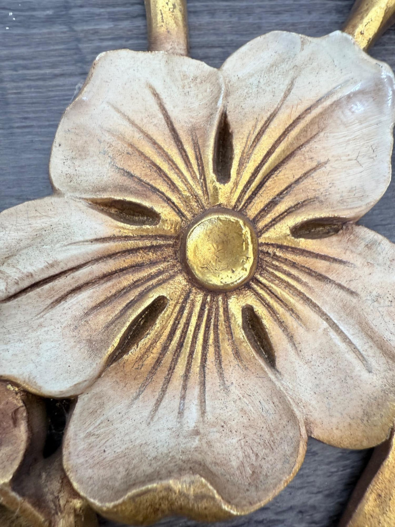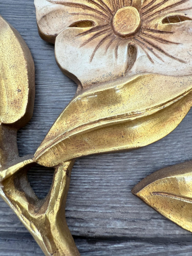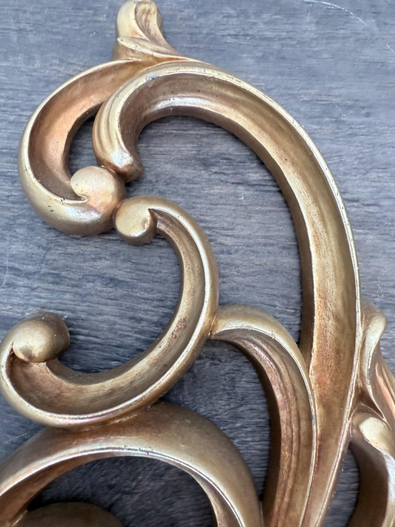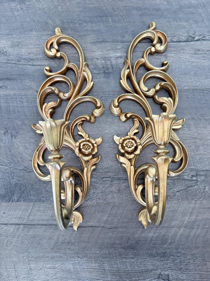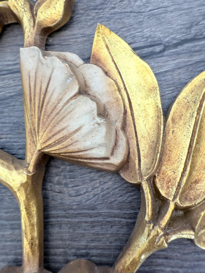 Syroco Wall Plaques – 4-Piece Resin Set One floral wall plaque with layered flower and leaf forms (20" x 14") One vertical oval plaque with raised flower arrangement in a vase (19" x 8") Two scroll-form candle holders with integrated flower designs (each 16" x 6") Each piece is molded with surface relief details. Backs are marked with SYROCO or SYROCO INC. and copyright numbers. Hanging hardware is attached. Material is resin