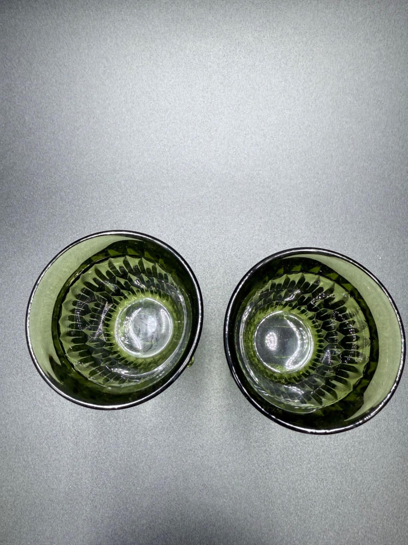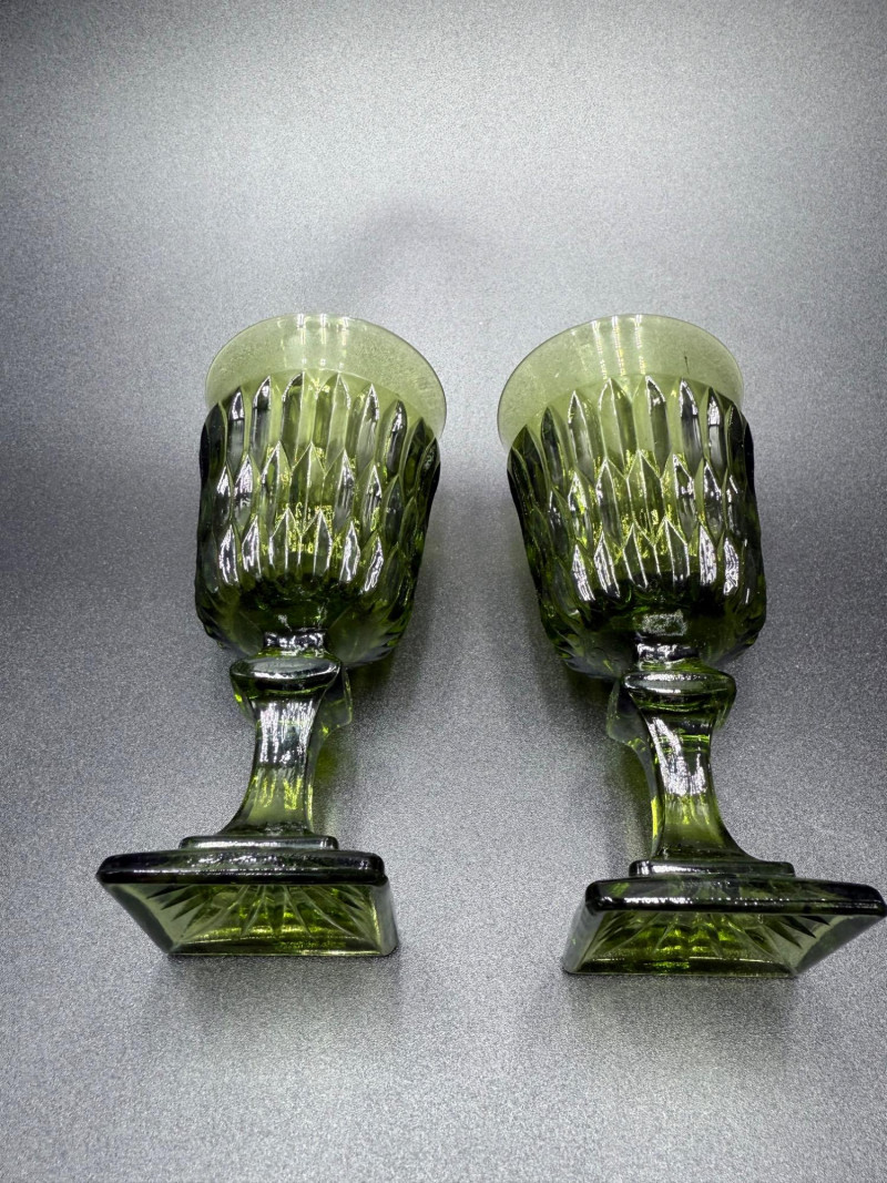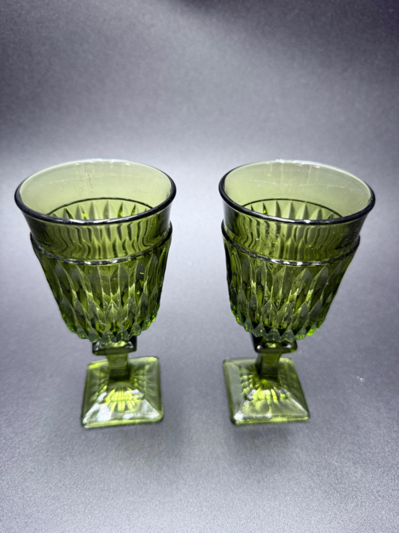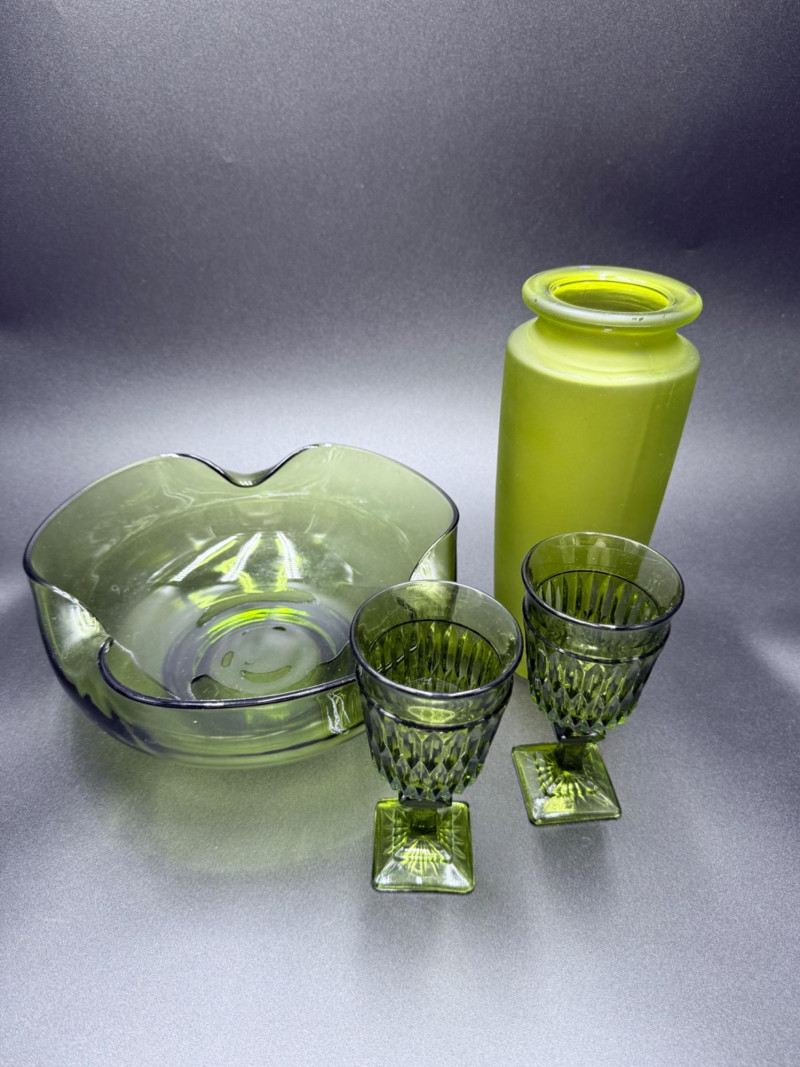 4-Piece Green Glass Set Four-piece green glass set including: One green glass bowl with tri-lobed rim and rounded base, likely Anchor Hocking. One tall green glass vase with frosted surface, cylindrical body, and flared rim. Two pressed glass goblets with faceted diamond pattern and square footed bases, likely Indiana Glass. Measurements: Bowl: 9" diameter x 4" height Vase: 9" height x 4" width Goblets: 5.5" height each