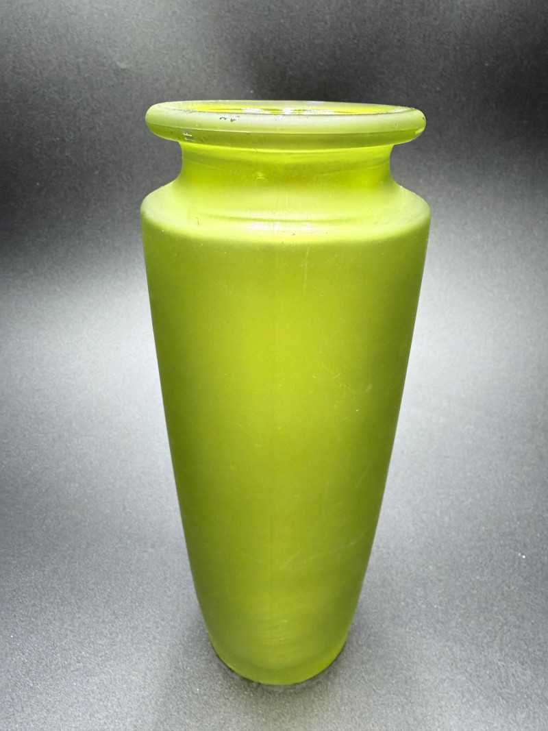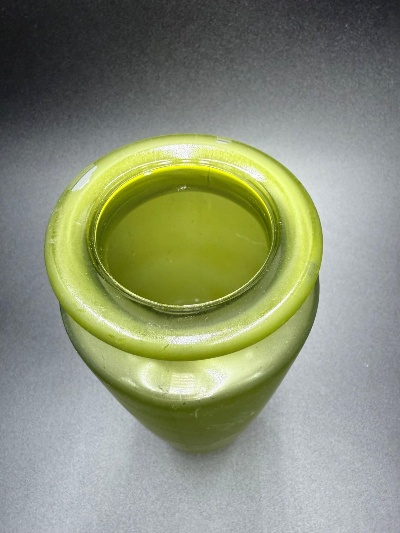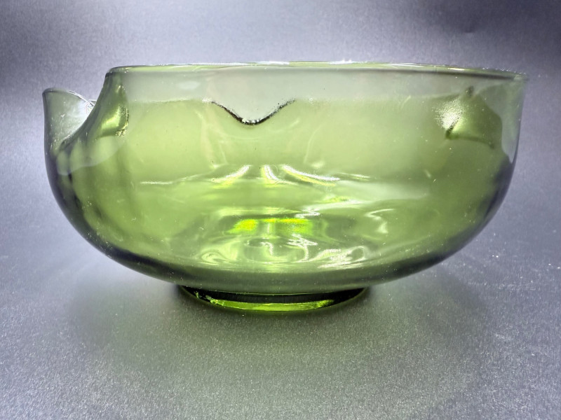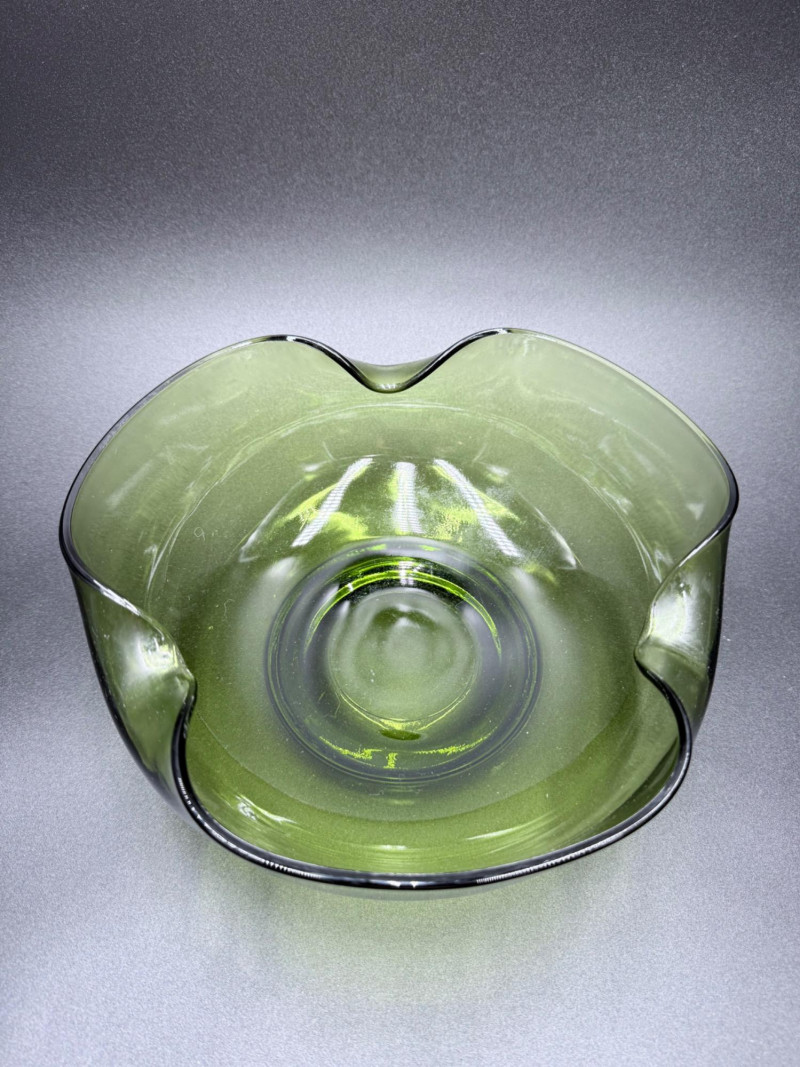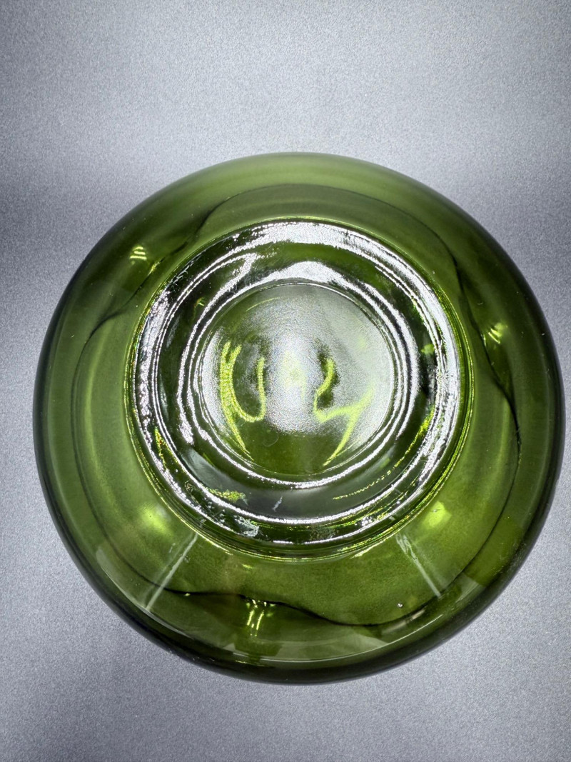 4-Piece Green Glass Set Four-piece green glass set including: One green glass bowl with tri-lobed rim and rounded base, likely Anchor Hocking. One tall green glass vase with frosted surface, cylindrical body, and flared rim. Two pressed glass goblets with faceted diamond pattern and square footed bases, likely Indiana Glass. Measurements: Bowl: 9" diameter x 4" height Vase: 9" height x 4" width Goblets: 5.5" height each