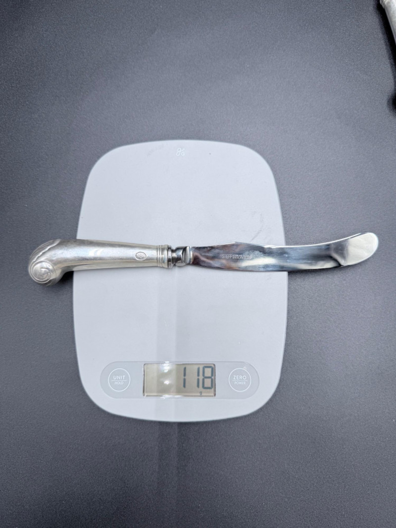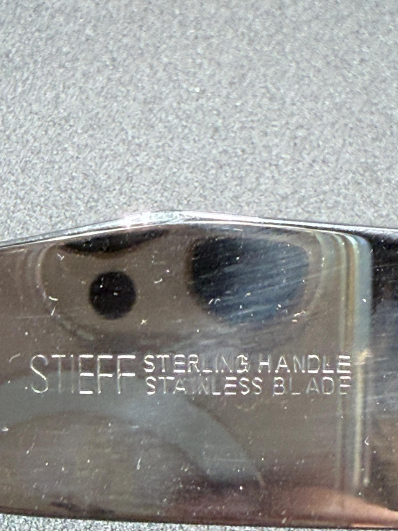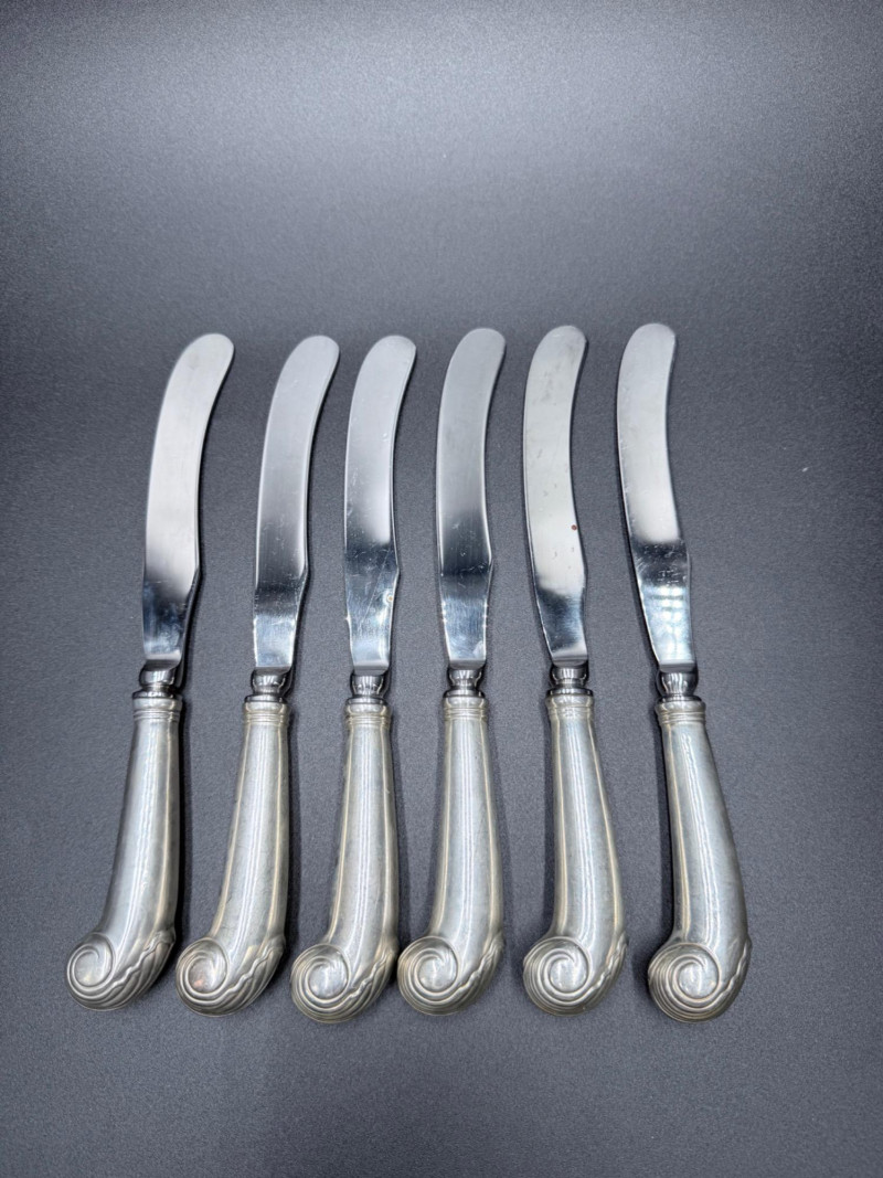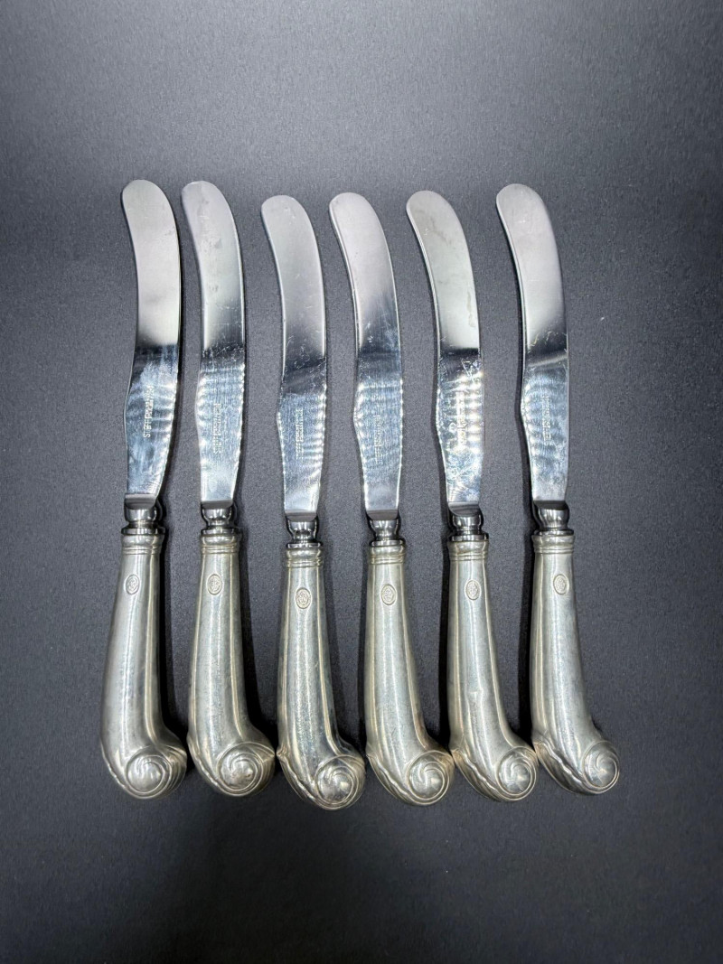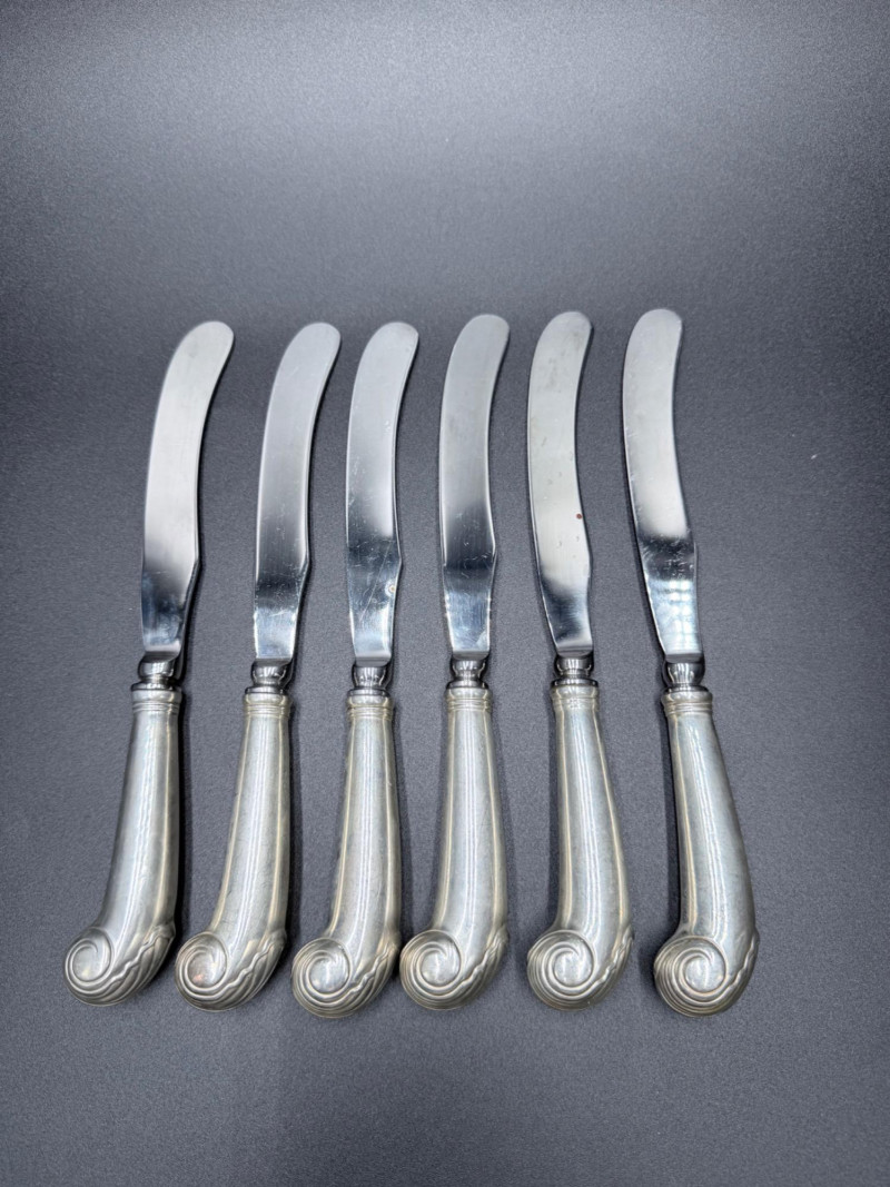 Set of 6 Stieff Sterling Silver Handle Knives Set of 6 table knives by Stieff. Each knife has a sterling silver handle with a scroll-end design and a stainless steel blade. Marked "Stieff Sterling Handle Stainless Blade." The Stieff hallmark is present on each handle. Approximate weight per knife: 118 grams.