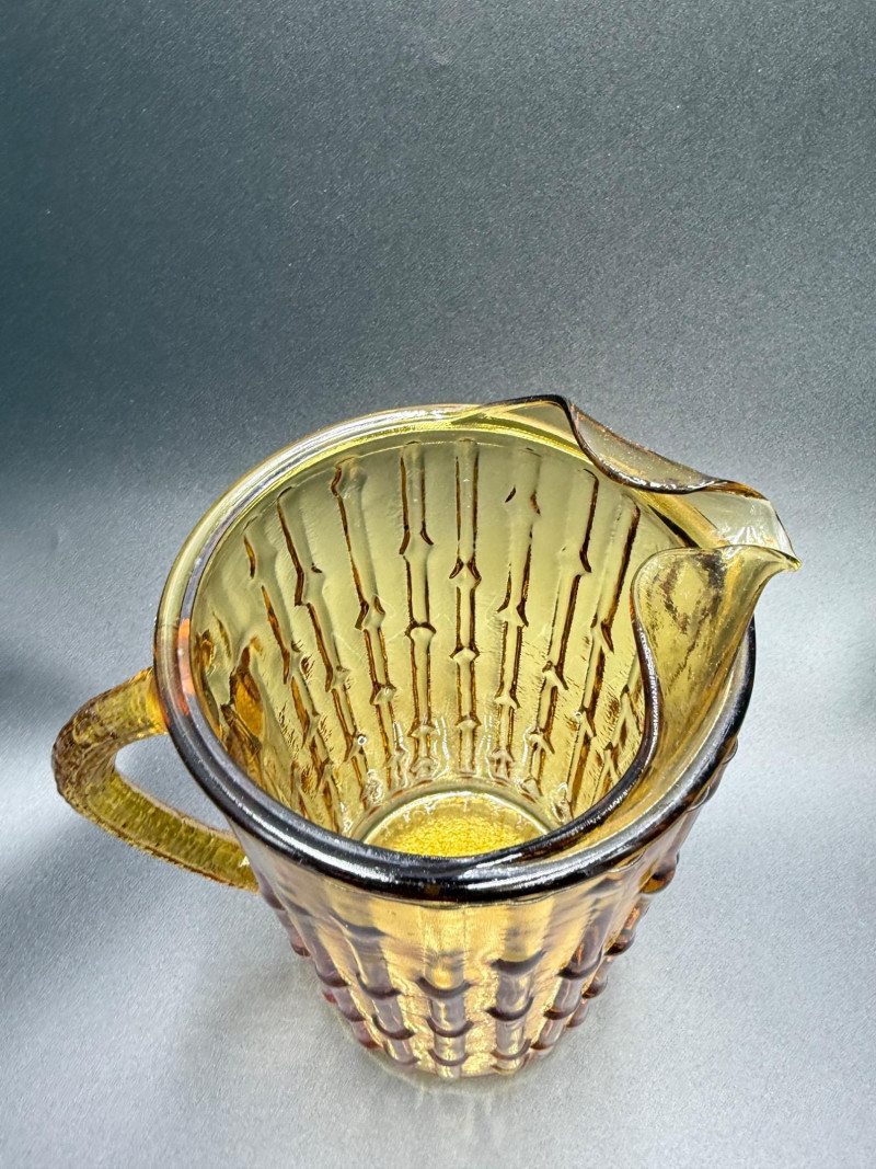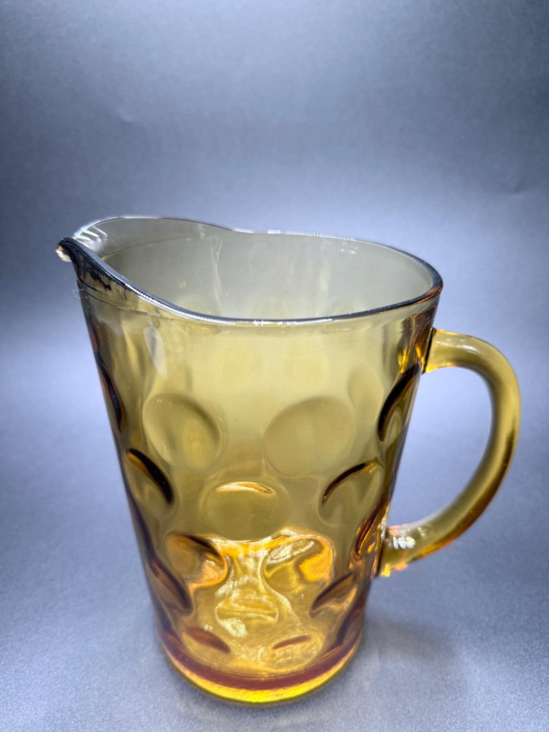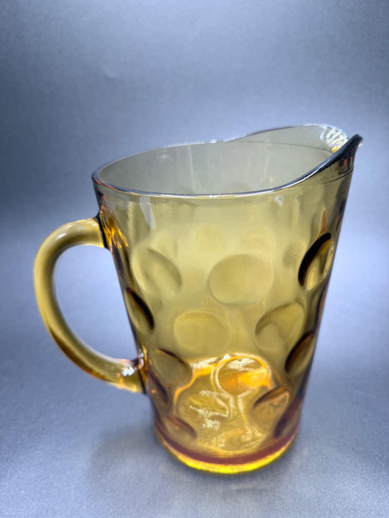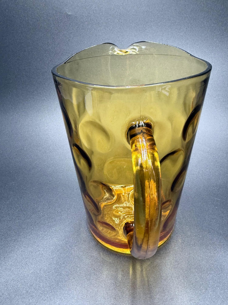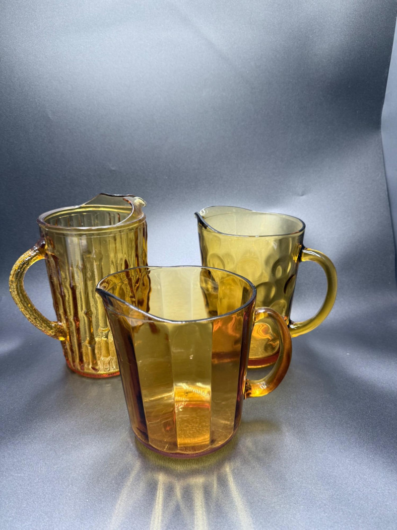 Vintage Amber Glass Pitchers – Set of 3 Set of three vintage amber glass pitchers, each with a distinct molded design: One pitcher with raised dot pattern, also known as bubble or coin spot style. One pitcher with vertical ridges and textured handle, likely Anchor Hocking's “Tahiti” bamboo pattern. One pitcher with paneled sides and a square base. Heights are approximately 9.5", 8", and 7".