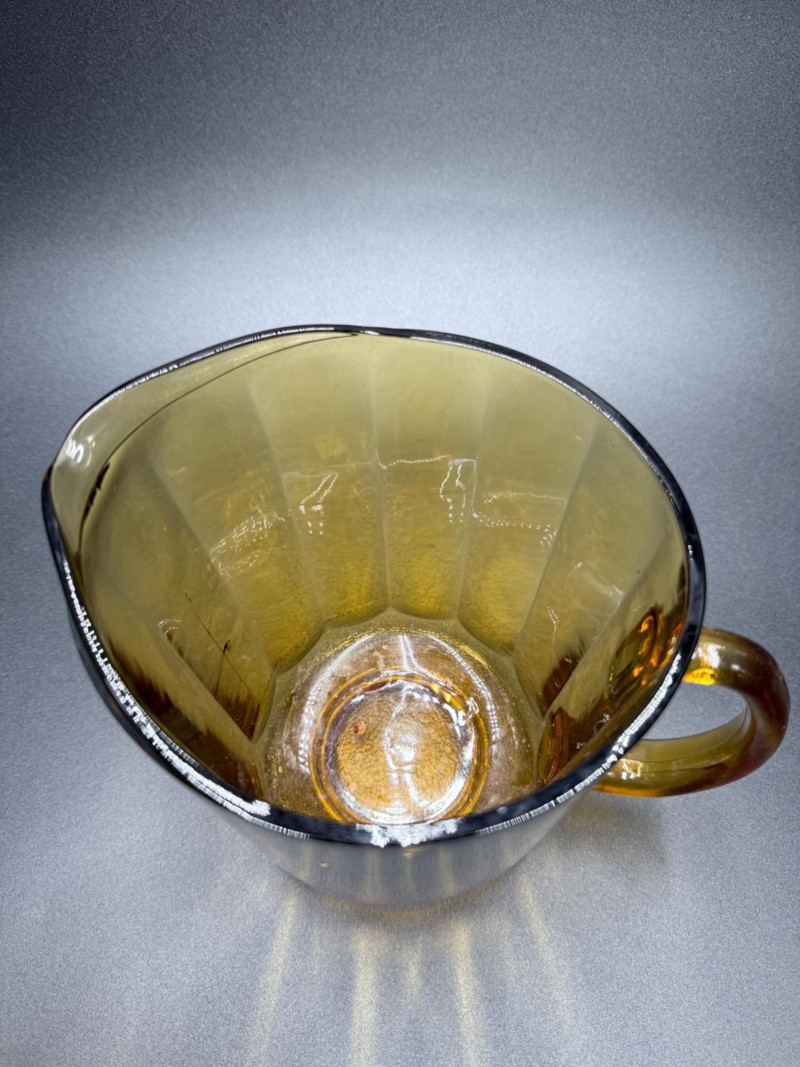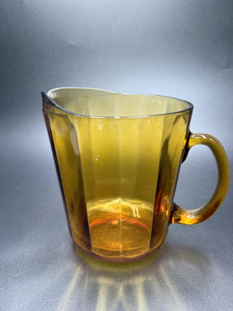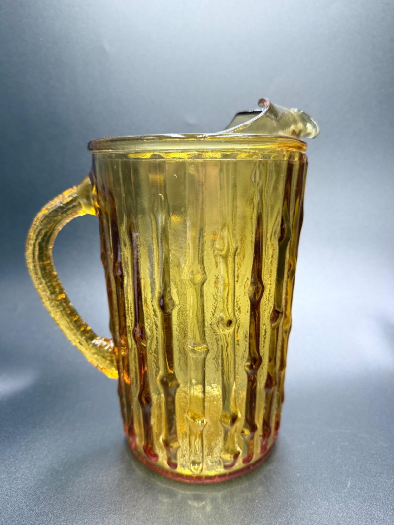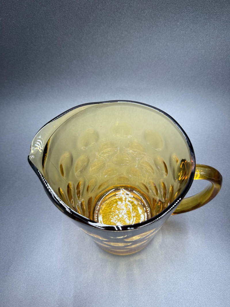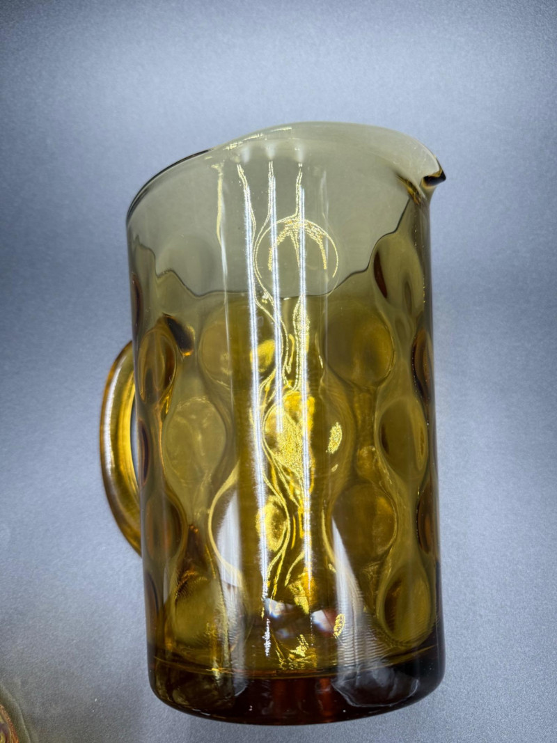 Vintage Amber Glass Pitchers – Set of 3 Set of three vintage amber glass pitchers, each with a distinct molded design: One pitcher with raised dot pattern, also known as bubble or coin spot style. One pitcher with vertical ridges and textured handle, likely Anchor Hocking's “Tahiti” bamboo pattern. One pitcher with paneled sides and a square base. Heights are approximately 9.5", 8", and 7".