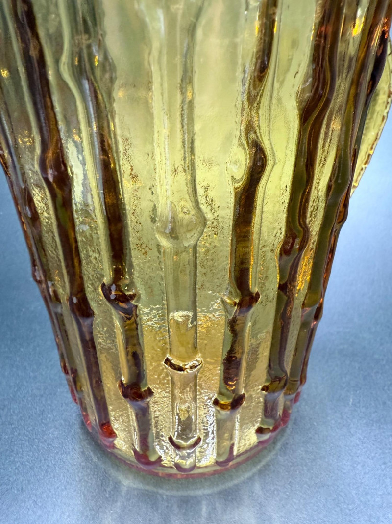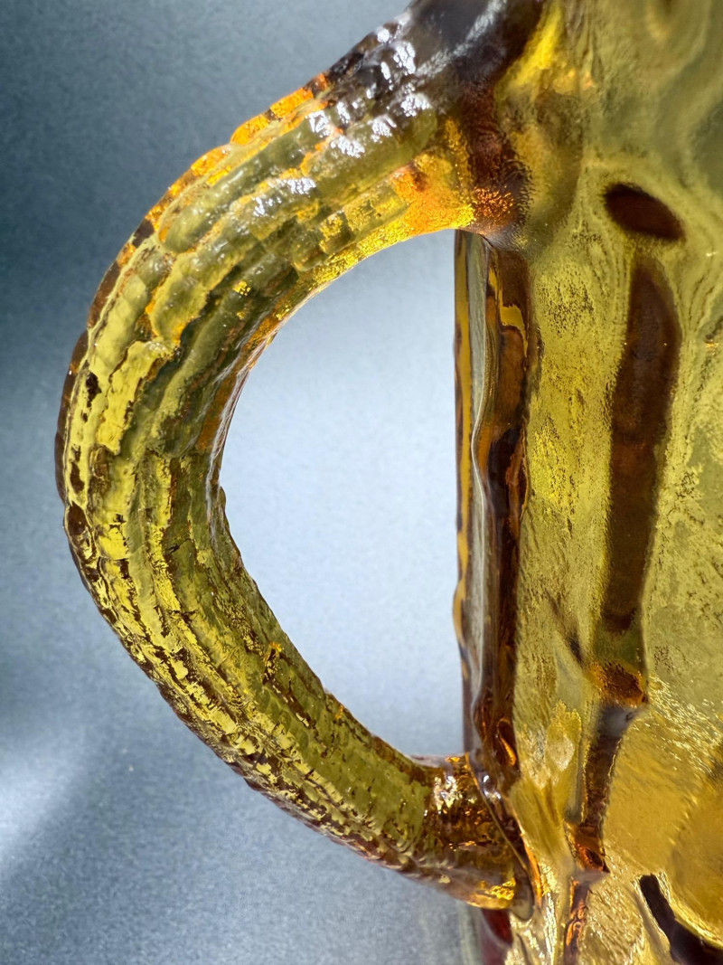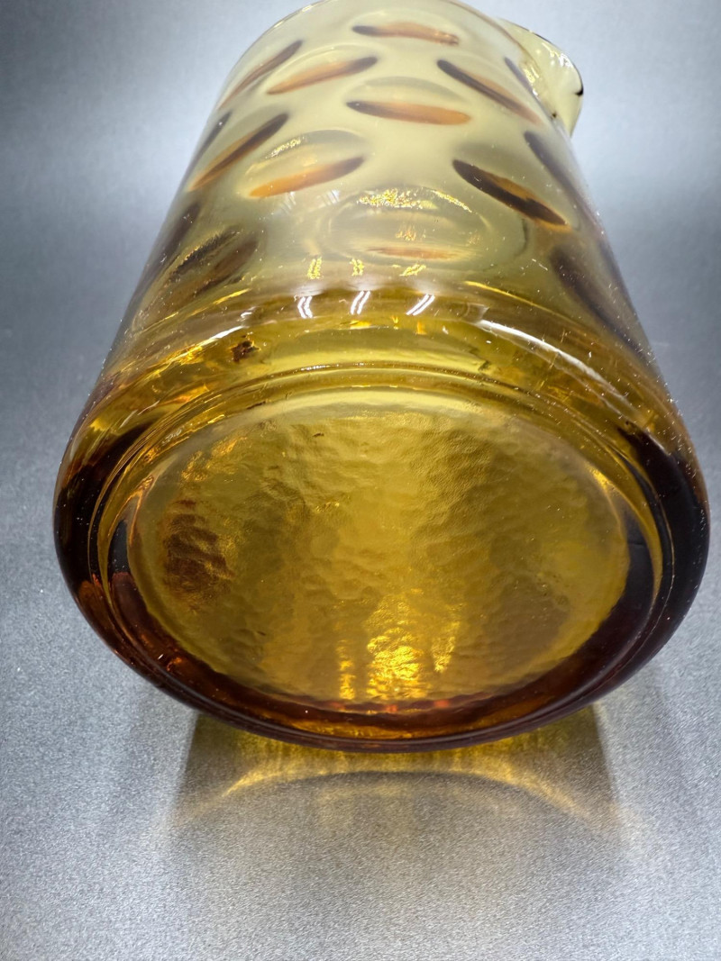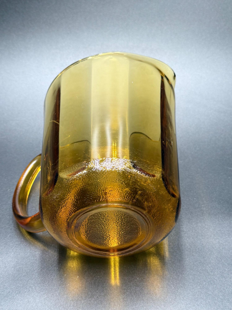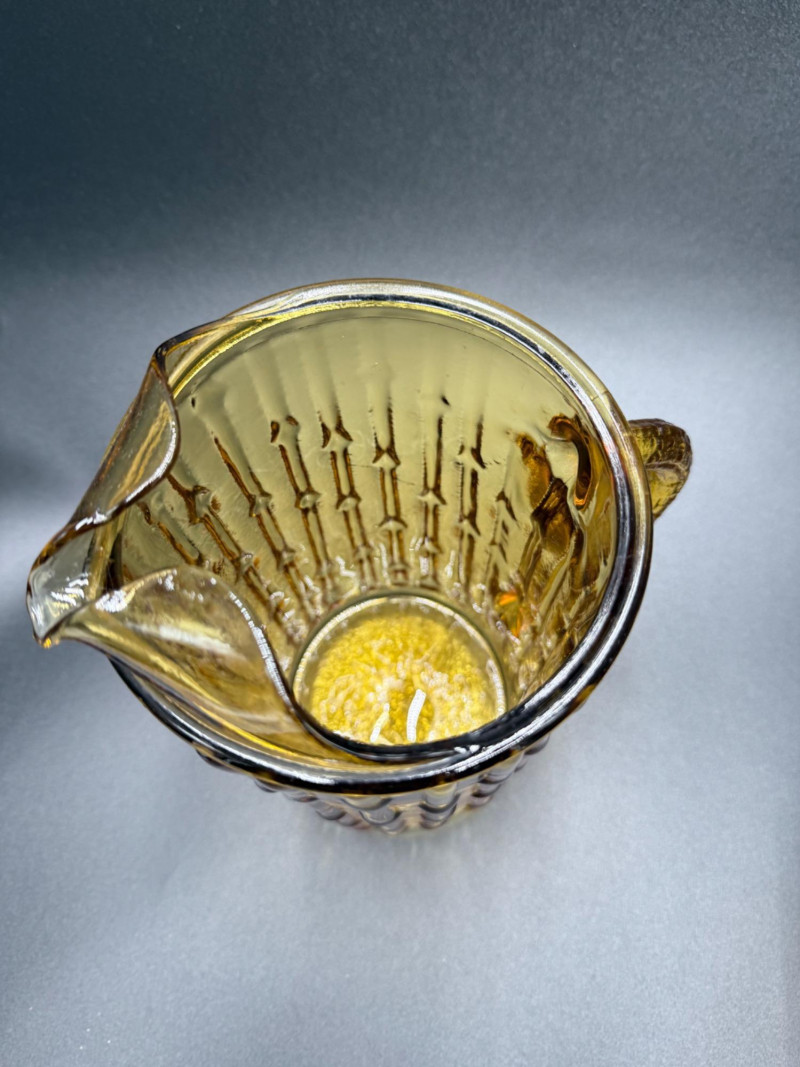 Vintage Amber Glass Pitchers – Set of 3 Set of three vintage amber glass pitchers, each with a distinct molded design: One pitcher with raised dot pattern, also known as bubble or coin spot style. One pitcher with vertical ridges and textured handle, likely Anchor Hocking's “Tahiti” bamboo pattern. One pitcher with paneled sides and a square base. Heights are approximately 9.5", 8", and 7".