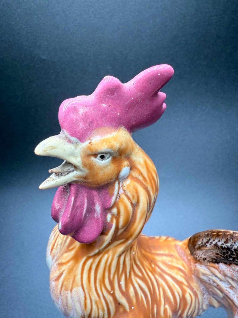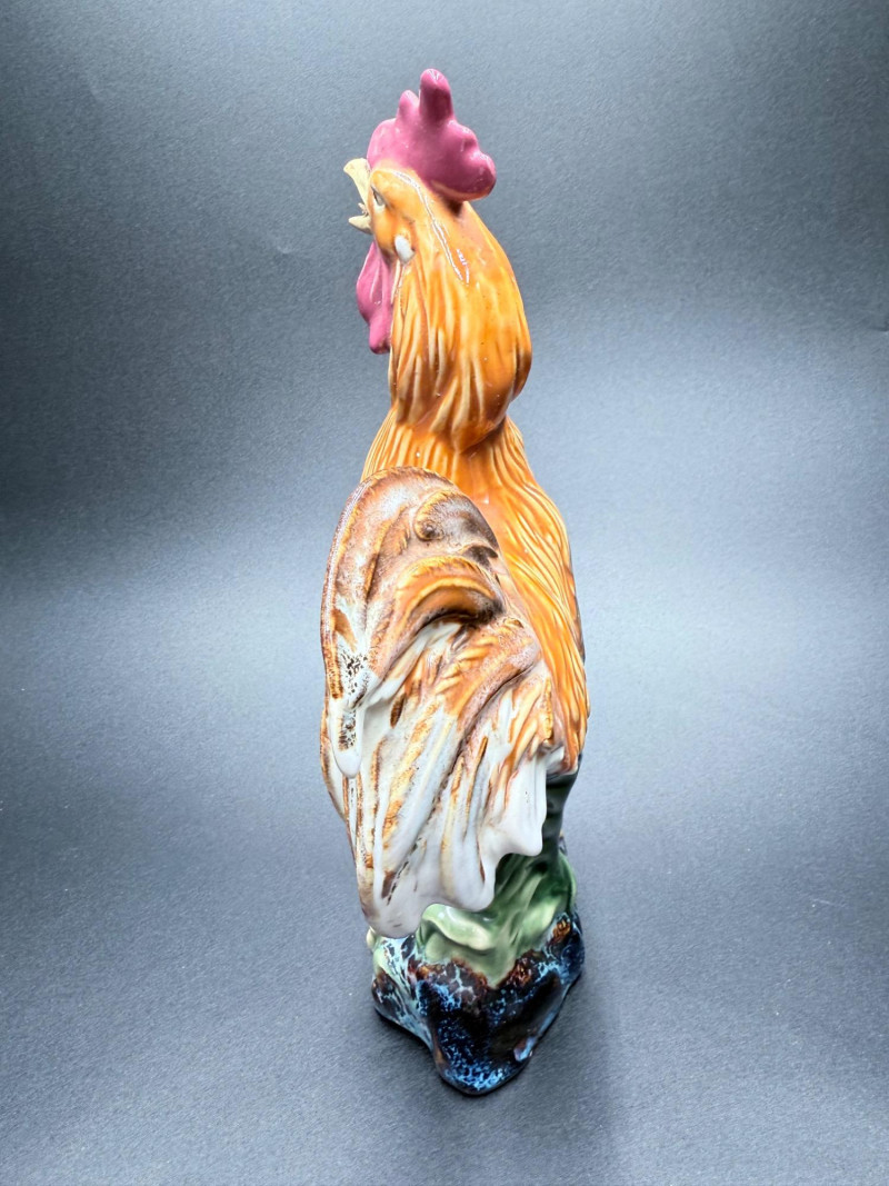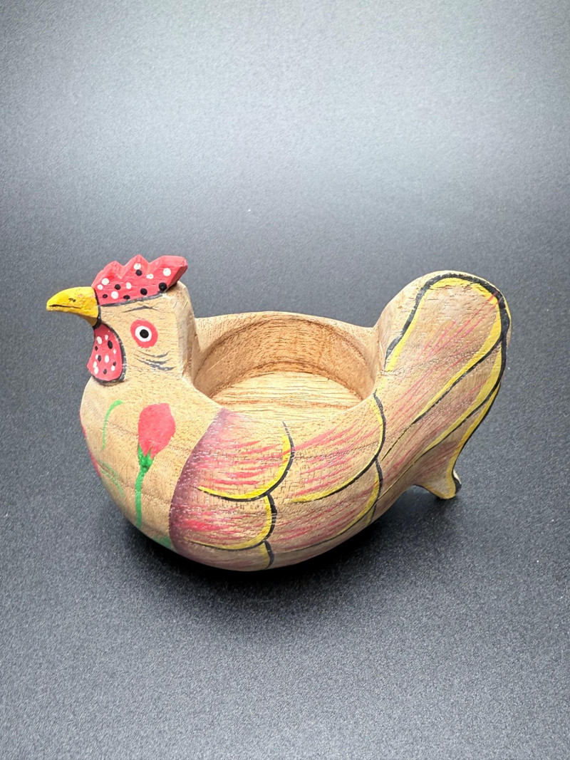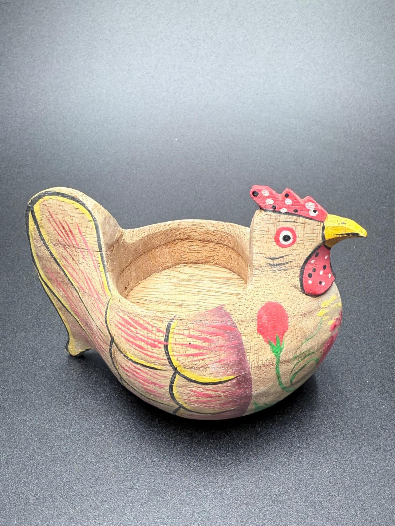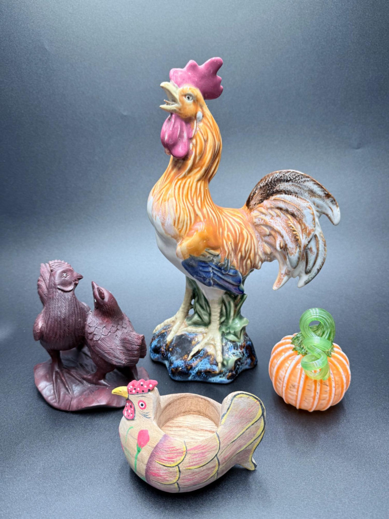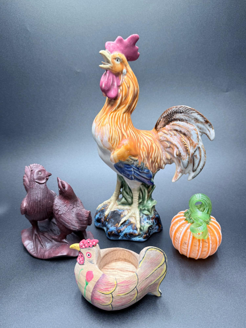 Chicken Figurines, Egg Holder and Glass Pumpkin Measurements: Ceramic rooster: 11.5" tall Wooden chicken egg holder: 4.5" wide Two wooden chickens: 6" x 3.5" each Glass pumpkin: 4" tall