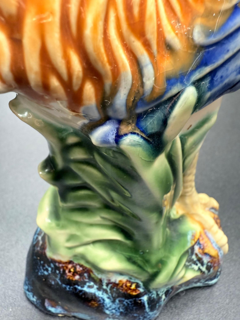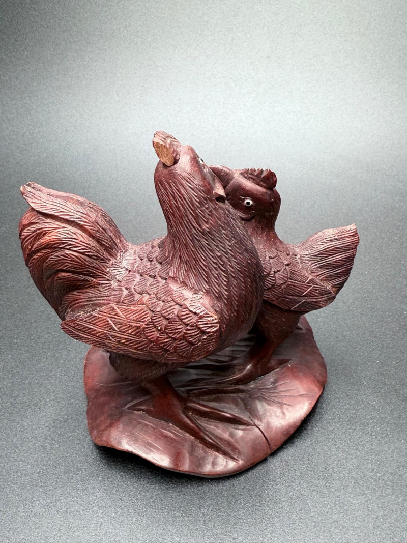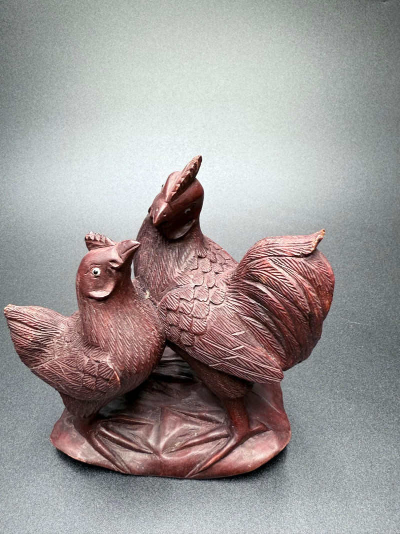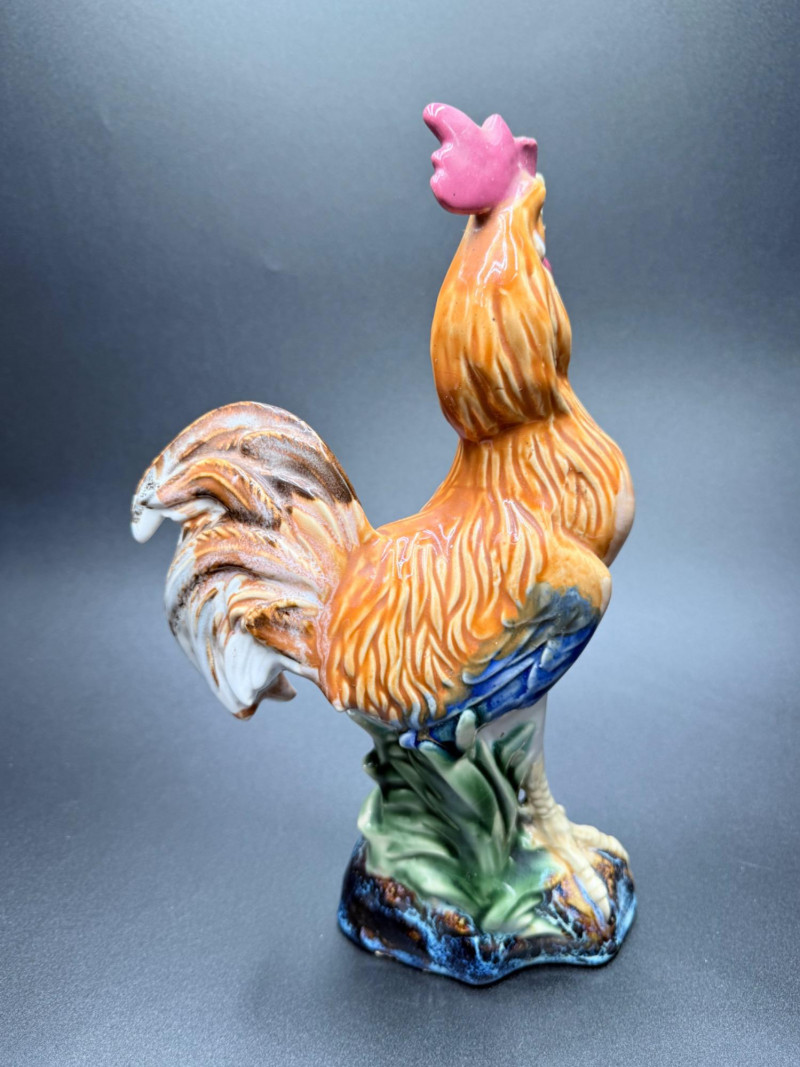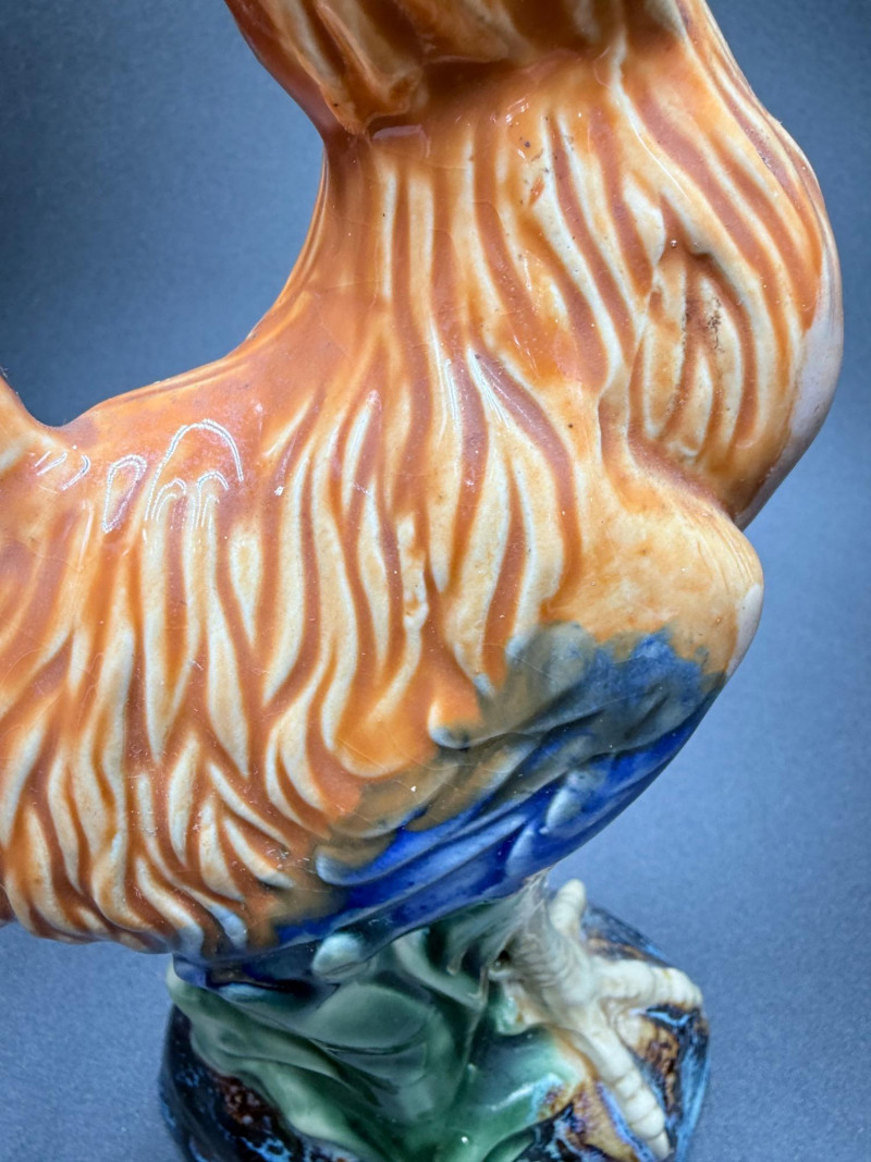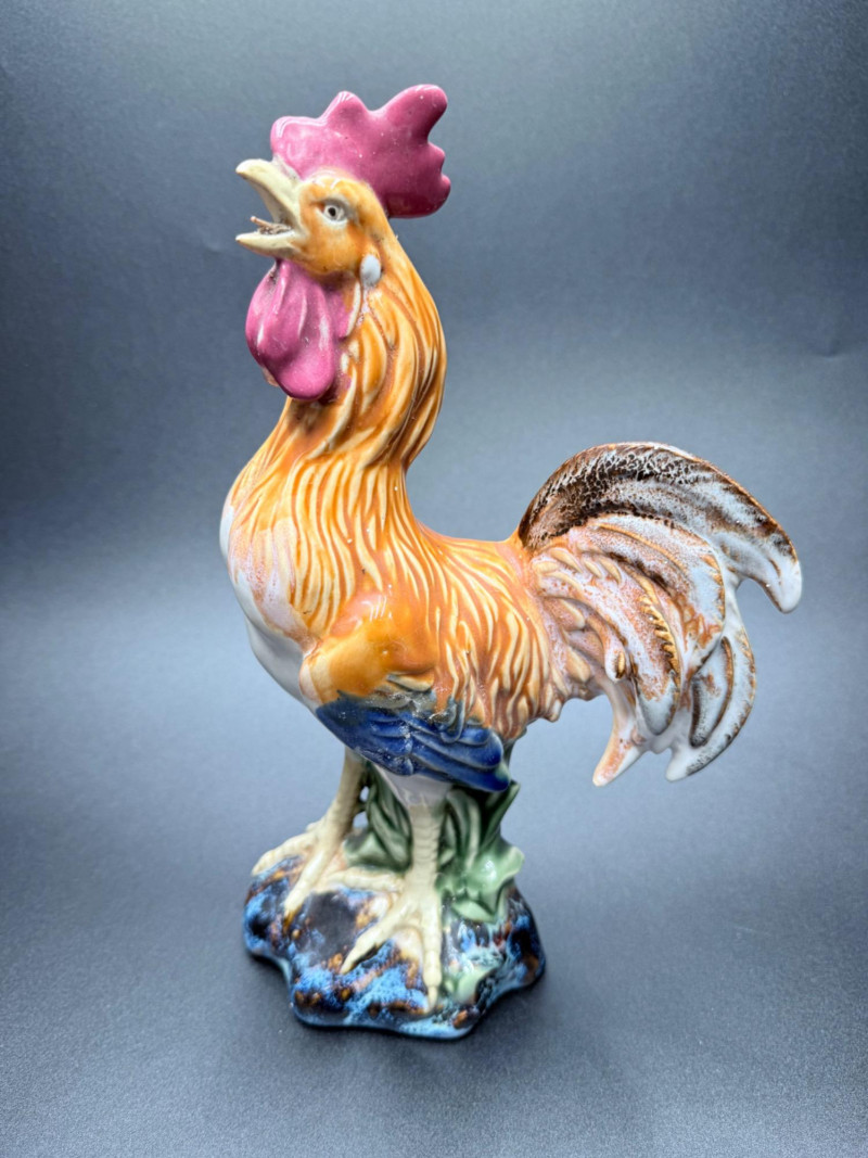 Chicken Figurines, Egg Holder and Glass Pumpkin Measurements: Ceramic rooster: 11.5" tall Wooden chicken egg holder: 4.5" wide Two wooden chickens: 6" x 3.5" each Glass pumpkin: 4" tall